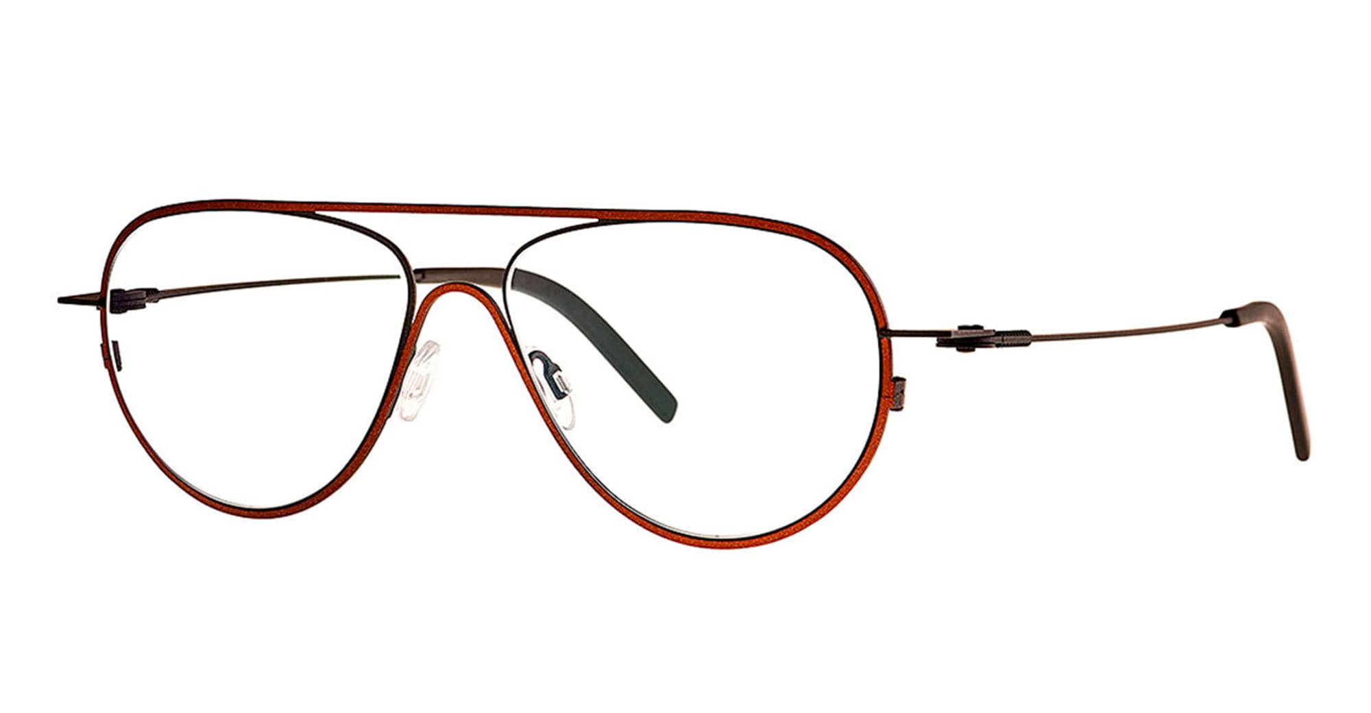 Theo eyewear ISOHYPSE - 293 BLACK / COPPER RX (IHYP-293) are elegant, colorful eyeglasses made in Belgium. They feature a lightweight bi-color stainless steel frame with a pilot shape, double nose bridge, and acetate temple tips.