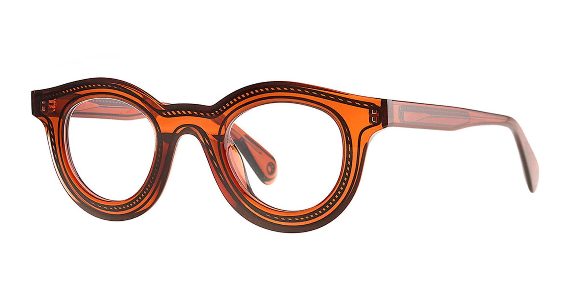 Theo eyewear YH - 008 TRANSPARENT RED BROWN RX (YH-8) are modern colorful oval eyeglasses made in Belgium. They feature transparent red brown acetate frame, acetate temples with exposed wirecore.