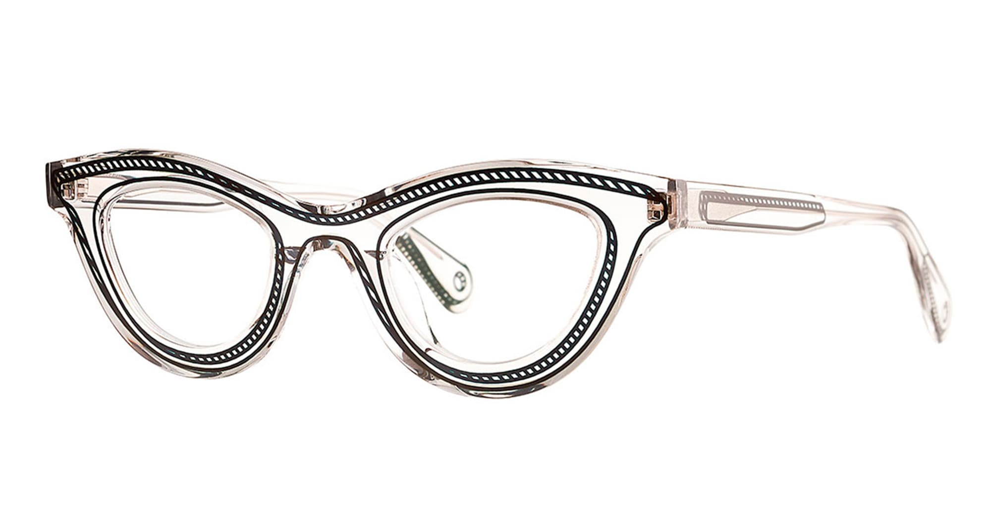 Theo eyewear YL - 002 TRANSPARENT RX (YL -2) are modern colorful cat-eye eyeglasses made in Belgium. They feature transparent acetate frame, acetate temples with exposed wirecore.