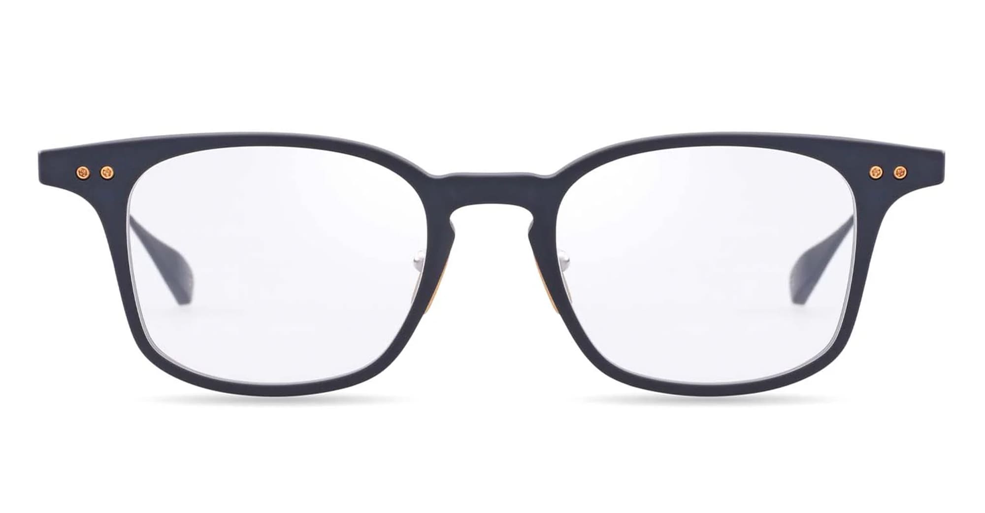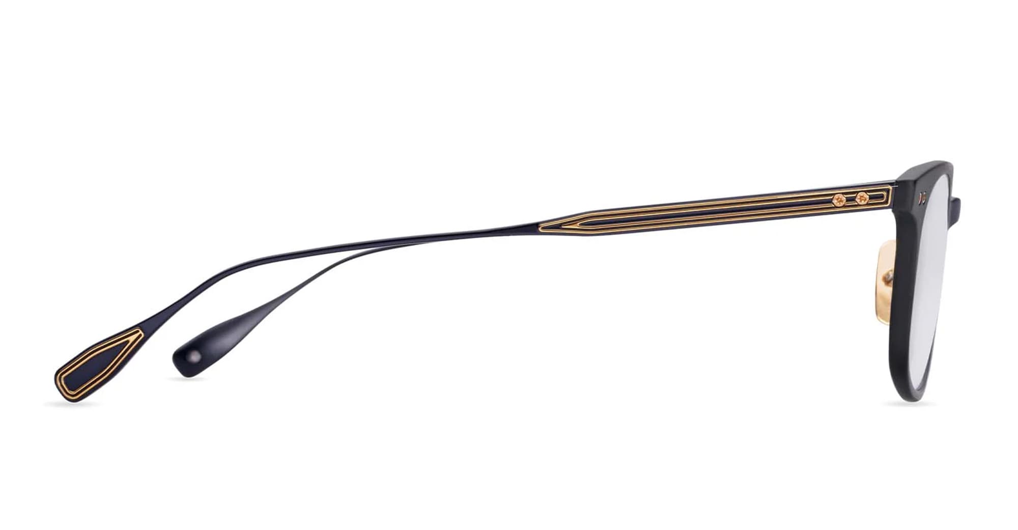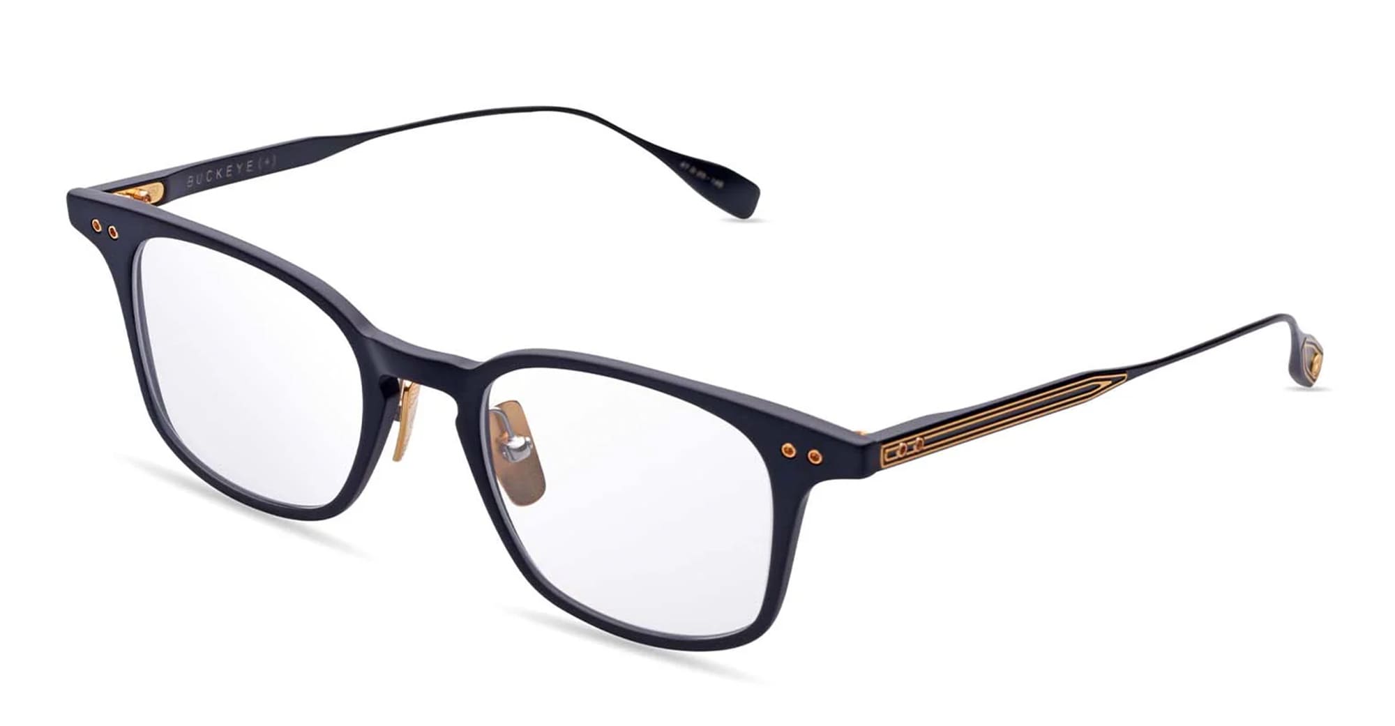 DITA BUCKEYE (+) - MATTE BLACK / YELLOW GOLD RX (DTX149-A-01) are elegant modern rectangular eyeglasses made in Japan. They feature black acetate frame with gold front pins, acetate temples with yellowe gold decorations, custom Dita's titanium hinge.