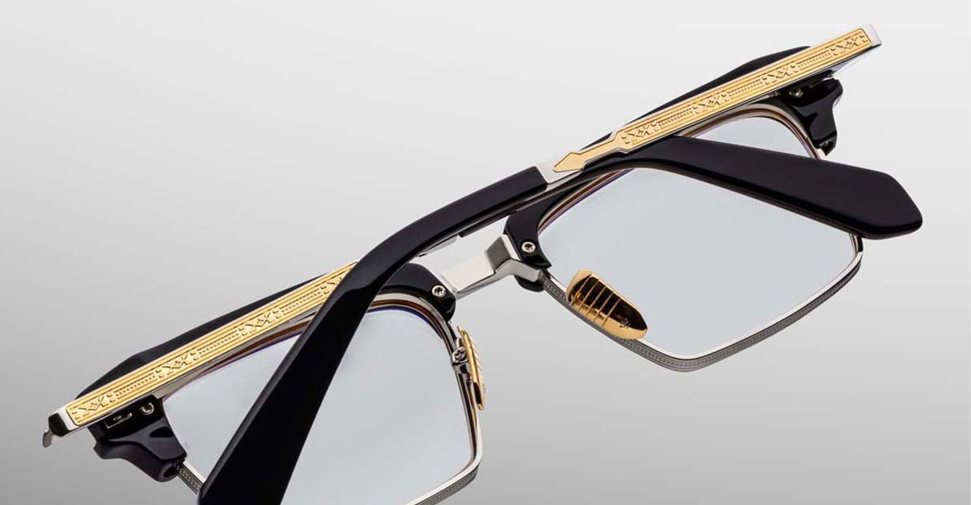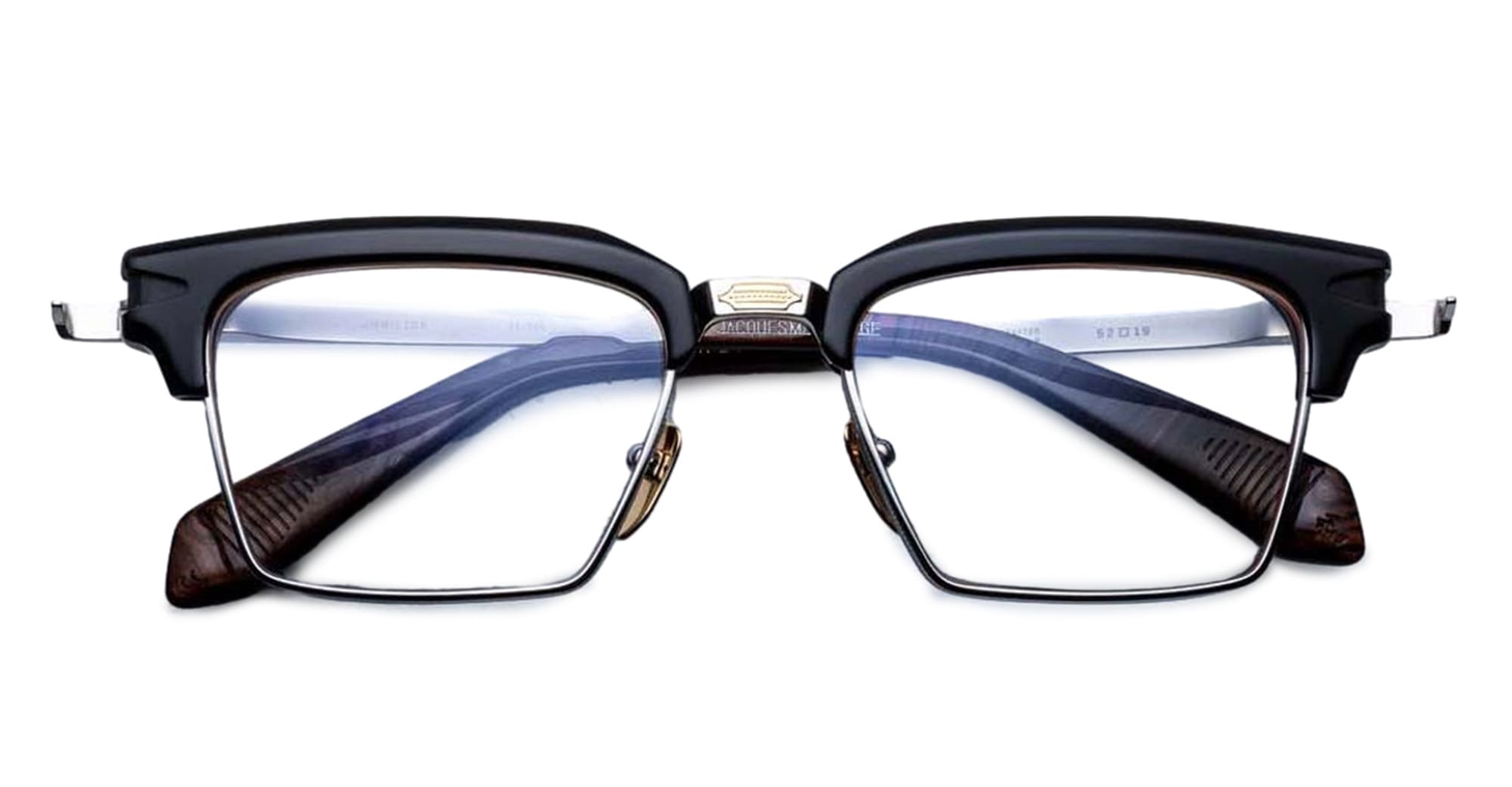 Jacques Marie Mage ALIN - NOIR X RX (JMMILRX-10A) are '50s-inspired combo eyeglasses with prominent acetate brow, square titanium lens shape. They feature sterling silver 100% beta titanium frame with dark gold accents, black cured cellulose acetate brows, engraved titanium temples with acetate tips, tension-secured custom arrowhead monoblock hinge, custom titanium nose pads.