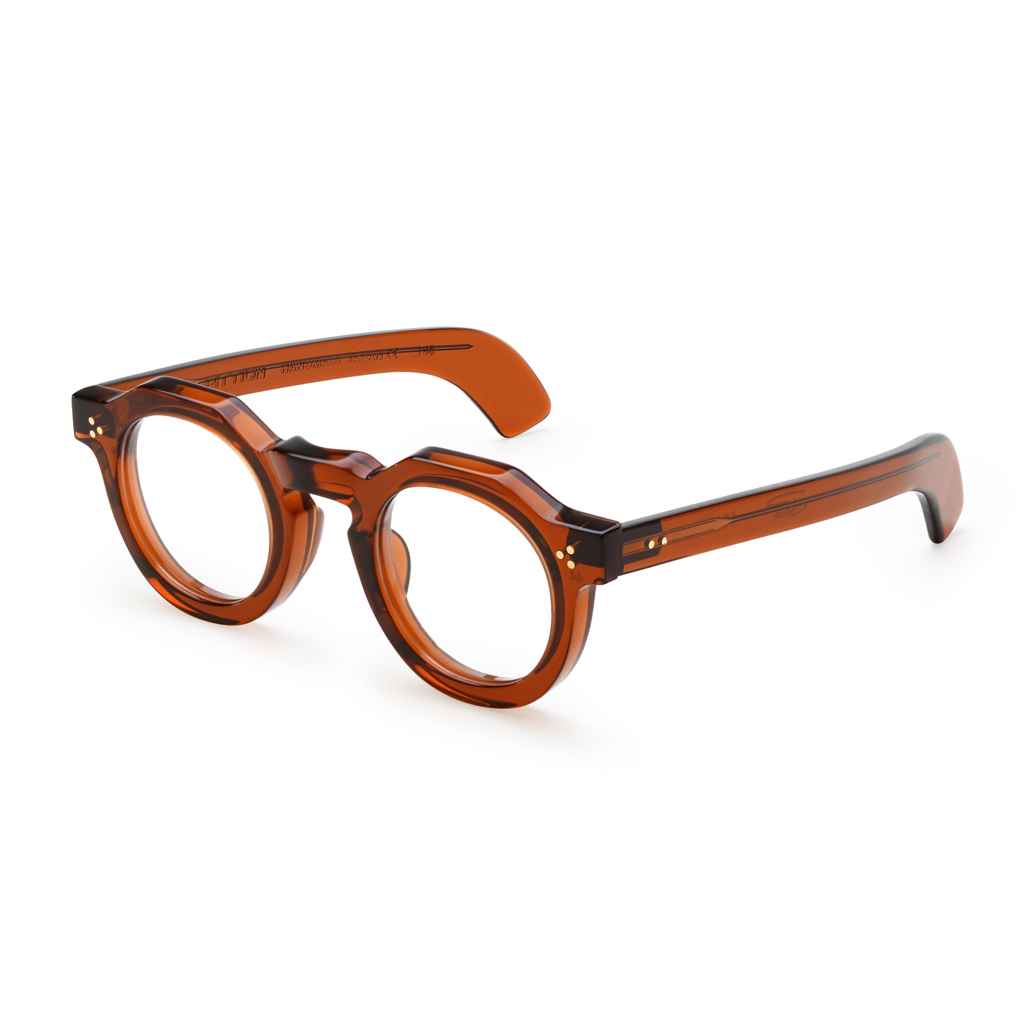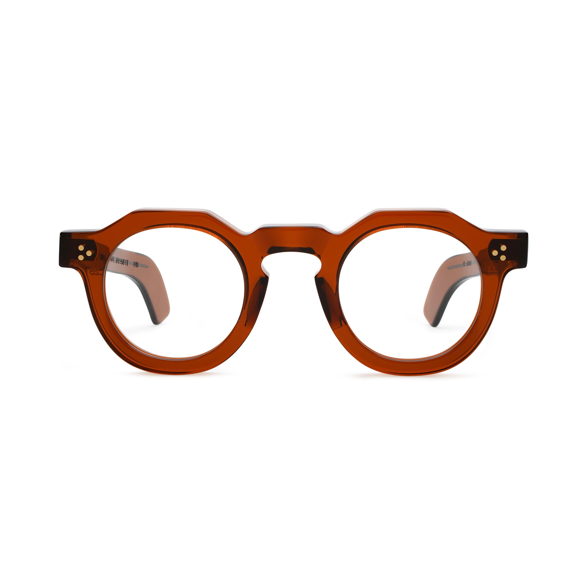 Max Pittion HUGO 44 X 28 - FRENCH BEER DARK RX (MXPL-004H) are bold panto eyeglasses with a striking combination of straight lines and rounded corners, inspired by Victor Hugo, the radical French literary legend known for his fiery social critique. They feature a brown 8 mm thick cotton-based acetate frame, brass pins and five-barrel hinges welded into place for a clean, smooth finish. Straight Massue-style temples complemented by patterned core wire, curved and rounded temple tips. Each pair is handmade in Japan, reflecting a commitment to artistry and precision.