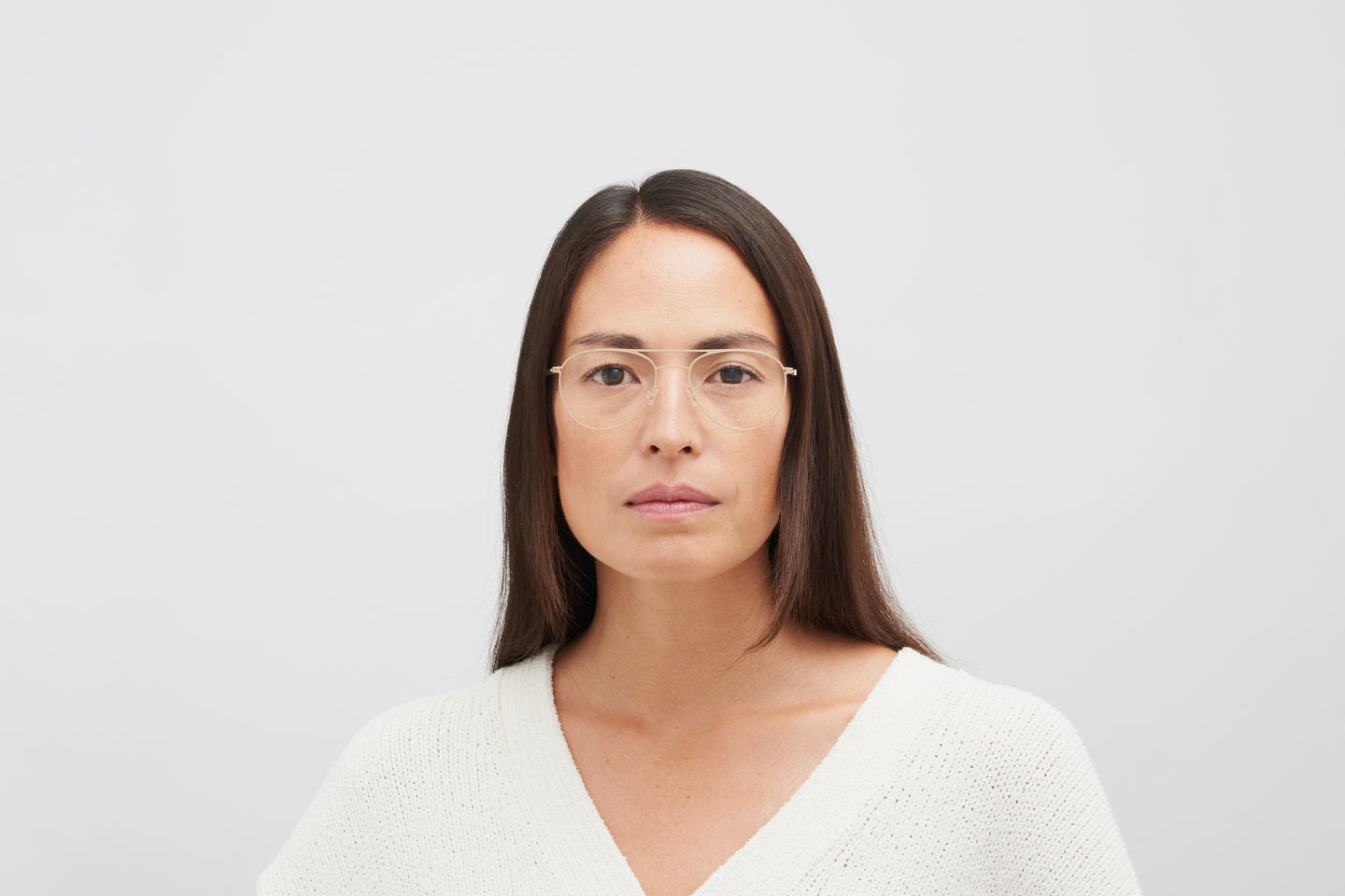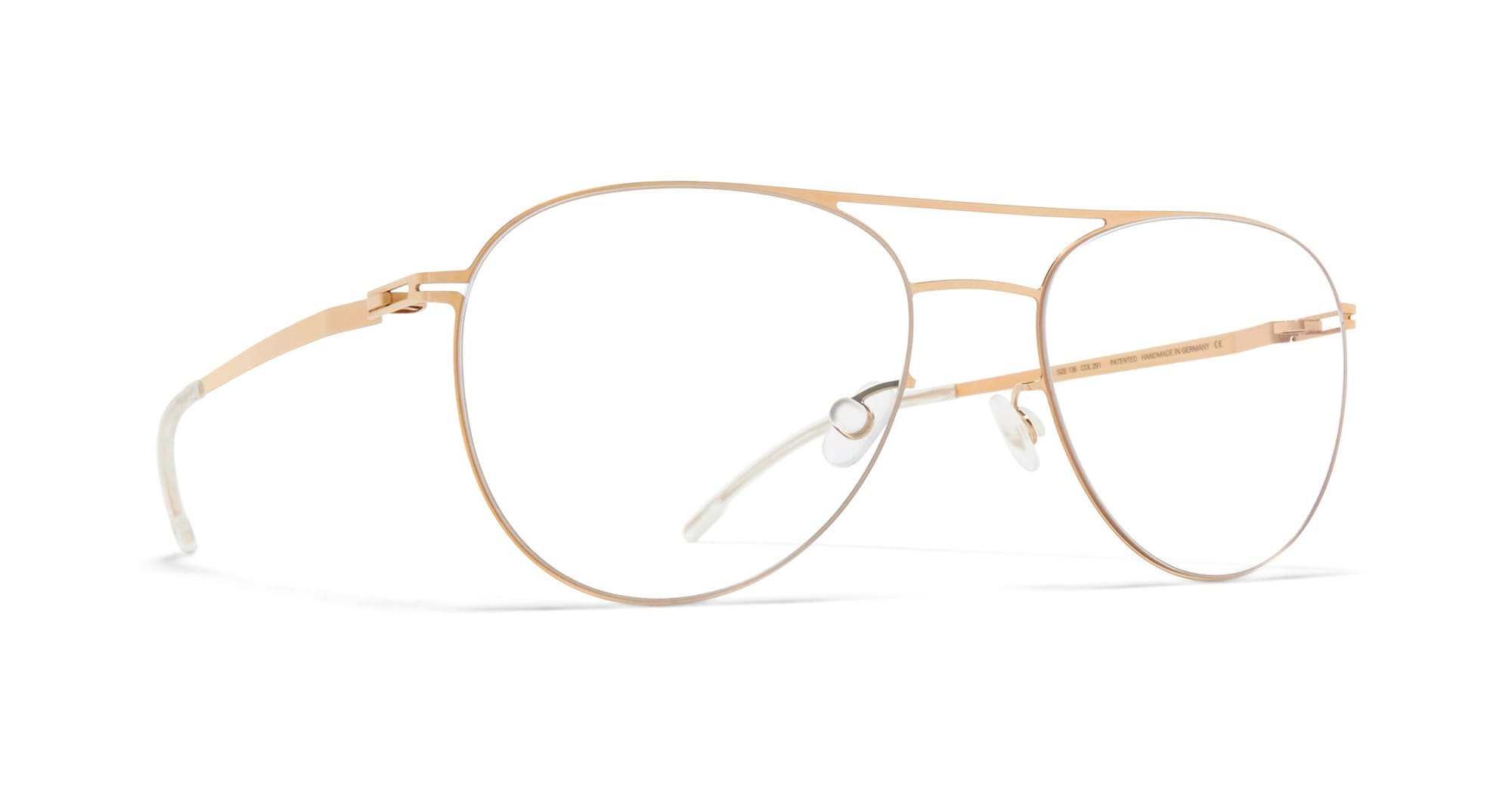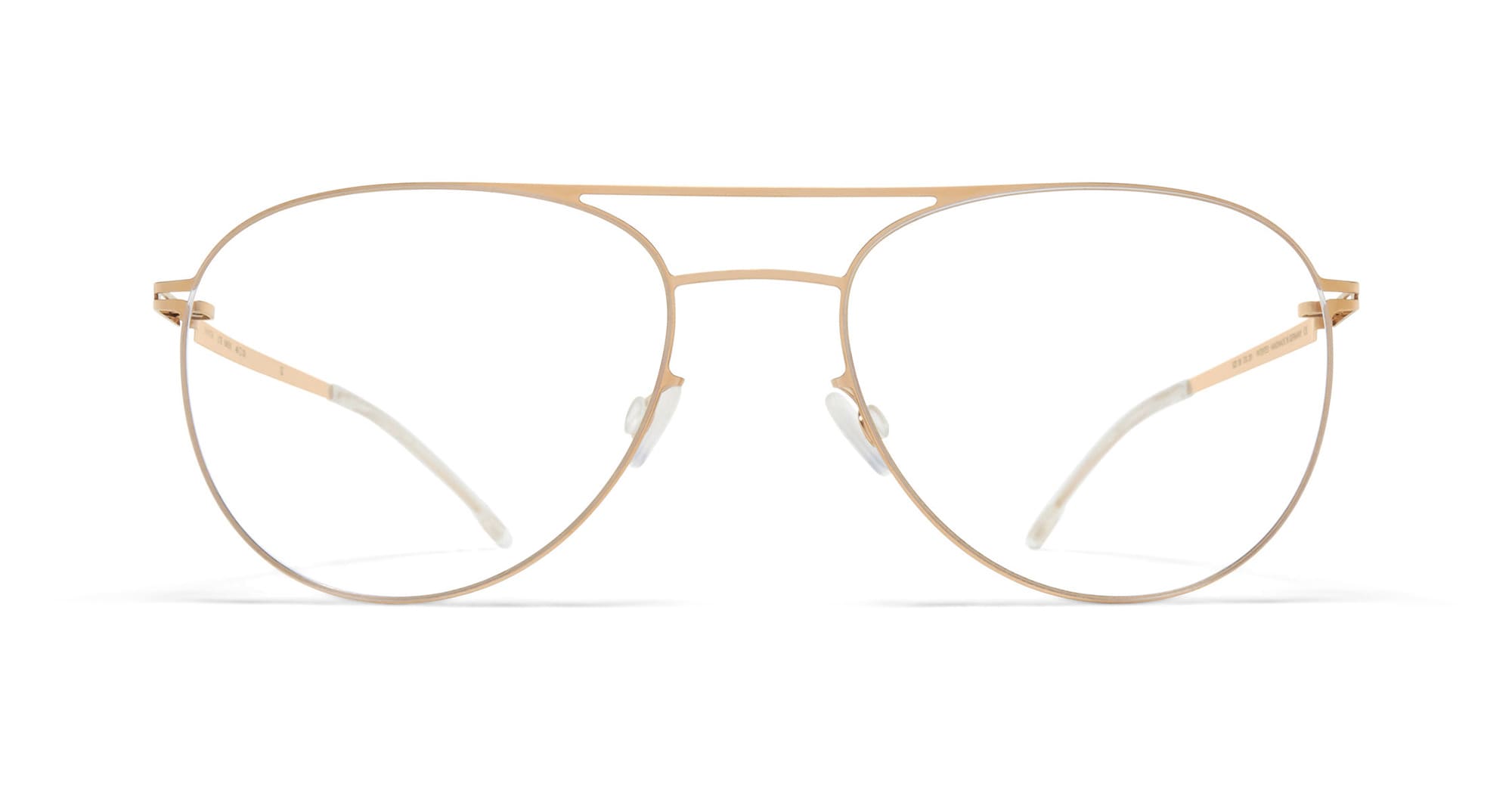 Mykita NIKEN - CHAMPAGNE GOLD RX (10067002) are aviator eyeglasses made in Germany, part of the Mykyta Lite Collection. They feature gold stainless steel frame with double bridge, stainless steel temples with silicon tips, silicone nose pads, and patented spiral hinge.