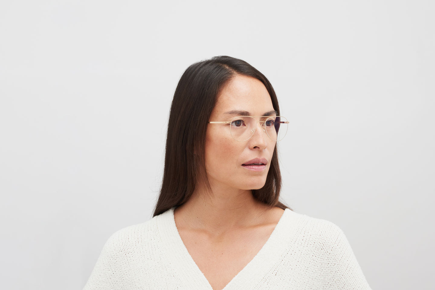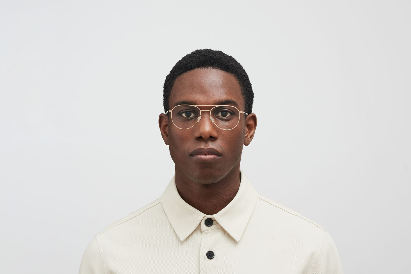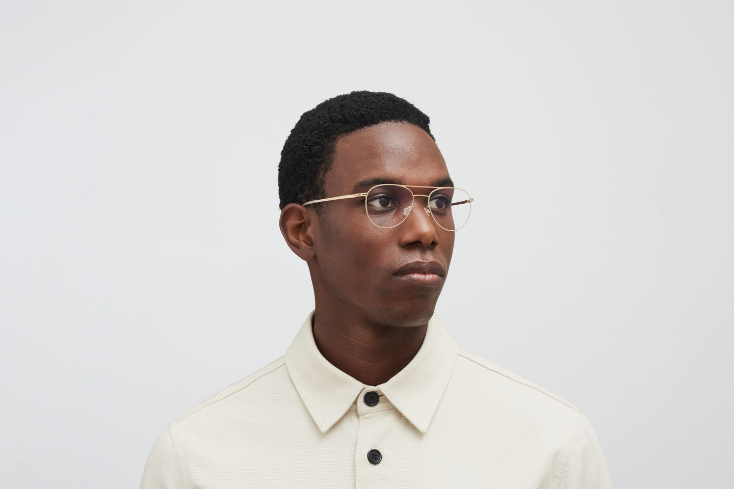 Mykita NIKEN - CHAMPAGNE GOLD RX (10067002) are aviator eyeglasses made in Germany, part of the Mykyta Lite Collection. They feature gold stainless steel frame with double bridge, stainless steel temples with silicon tips, silicone nose pads, and patented spiral hinge.