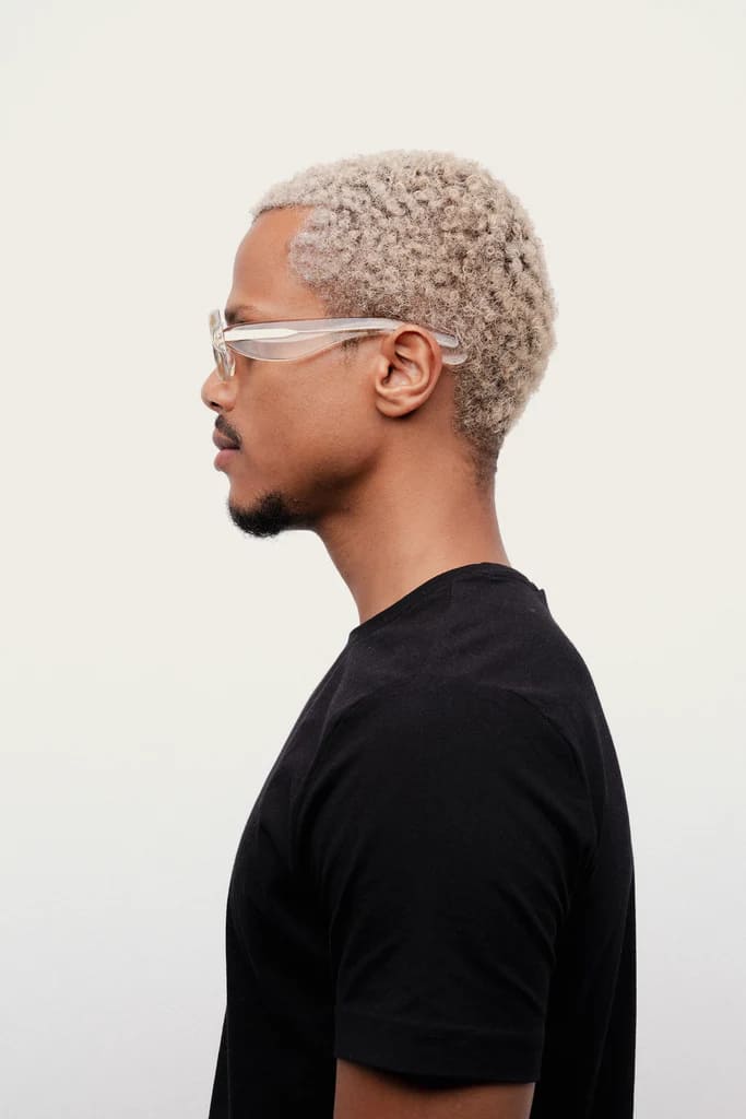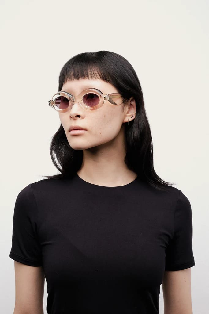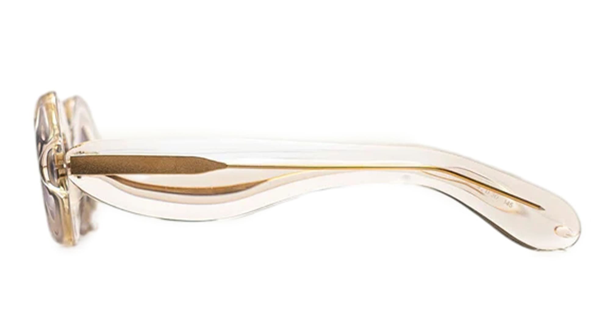 Paloceras PEBBLE - DULCE GLOSS RX (pebble-dulce-gloss-rx) are round sunglasses with exaggerated, inflated volumes. They feature 8mm transparent cured Mazzucchelli acetate frame with DualLayer™ laminated construction, custom Visottica gold-plated wirecore and 5-joint hinge system, gold-tone engraving logo, and CR39 2 base grey lens with backside anti-reflective treatement and 100% UV protection.