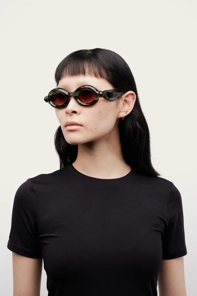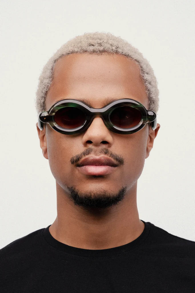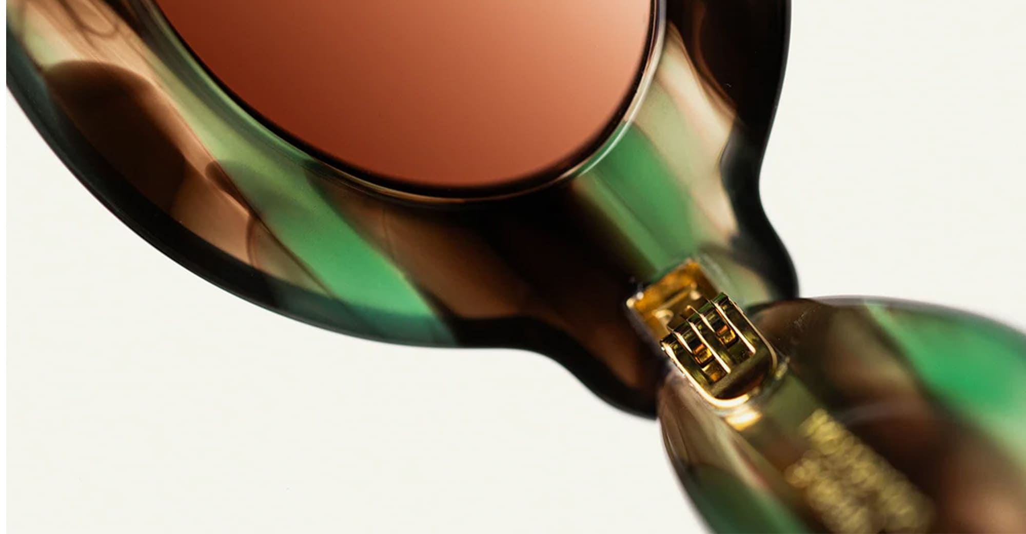 Paloceras PEBBLE - SAFARI TORTOISE RX (pebble-safari-tortoise-rx) are round sunglasses with exaggerated, inflated volumes. They feature 8mm green tortoise cured Mazzucchelli acetate frame with DualLayer™ laminated construction, custom Visottica gold-plated wirecore and 5-joint hinge system, gold-tone engraving logo, and CR39 2 base gradient brown lens with backside anti-reflective treatement and 100% UV protection.