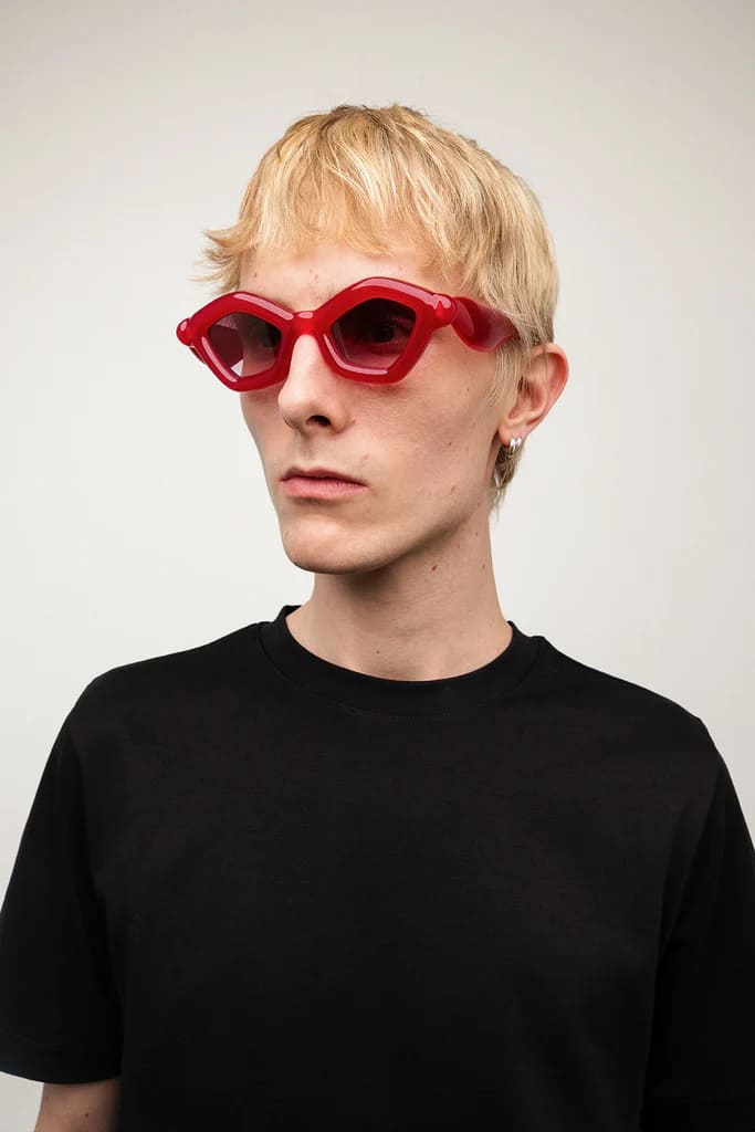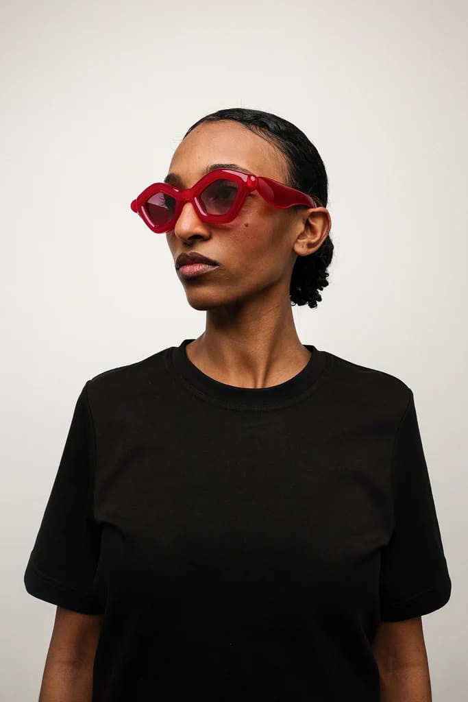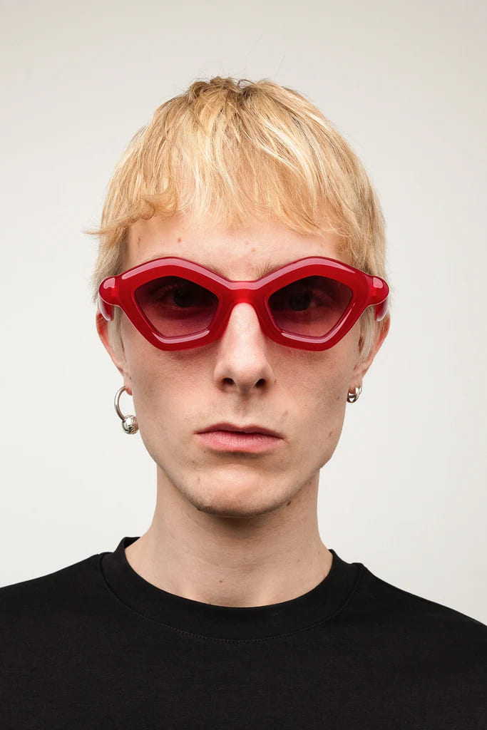 Paloceras PEBBLE - VELVET ROUGE DX (pebble-velvet-rouge-dx) are cat-eye sunglasses with exaggerated, inflated volumes. They feature 8mm red cured Mazzucchelli acetate frame with DualLayer™ laminated construction, custom Visottica gold-plated wirecore and 5-joint hinge system, gold-tone engraving logo, and CR39 2 base gradient pink lens with backside anti-reflective treatement and 100% UV protection.