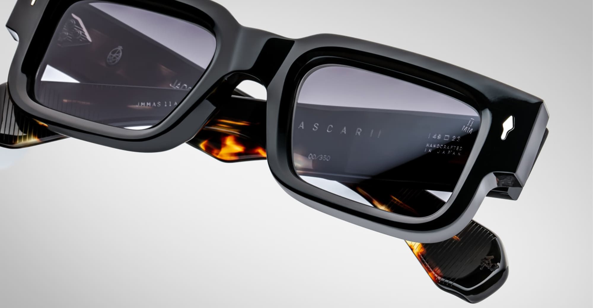 Jacques Marie Mage ASCARI - NOIR 11 (JMMAS-11A) are '50s-inspired sleek rectangular sunglasses, hommage to racer Albero Ascari. They feature black 10mm cured cellulose acetate frame, custom double laminated acetate temples, signature arrowhead front pin, hidden wirecore, tension-secured custom 7 barrel hinge, 2 base CR39 jet balck lens with backside anti-reflective treatment and 100% UV protection.