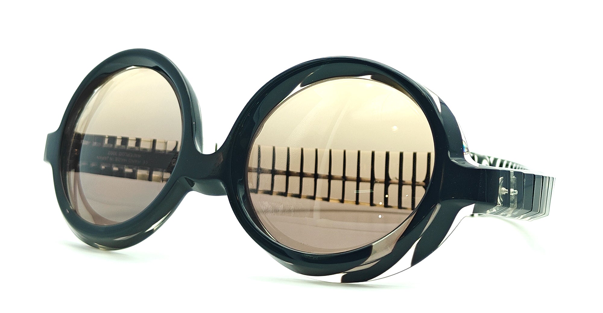 Pq eyewear by Ron Arad WATERLOO - BLACK FADE (PQWAT-3002) are round sunglasses made in Japan. They feature black nylon frame with bevel cuts, hingeless system, and gradient grey lens with 100% UV protection. Last Ron Arad Eyewear stock available.
