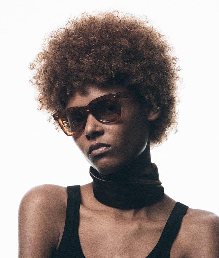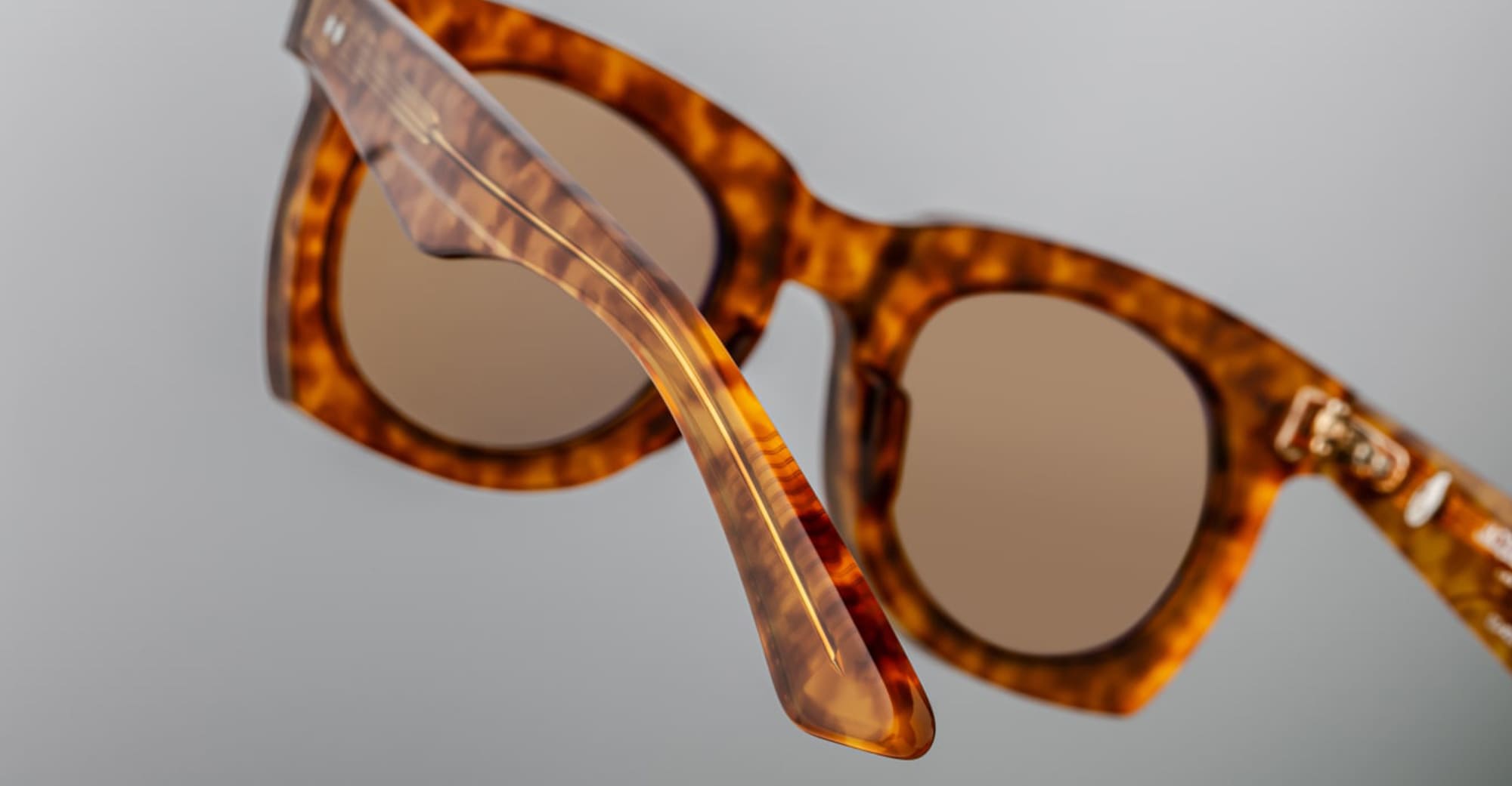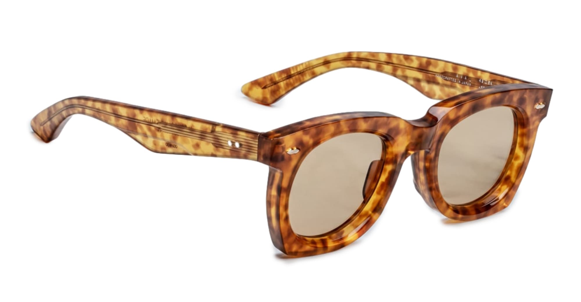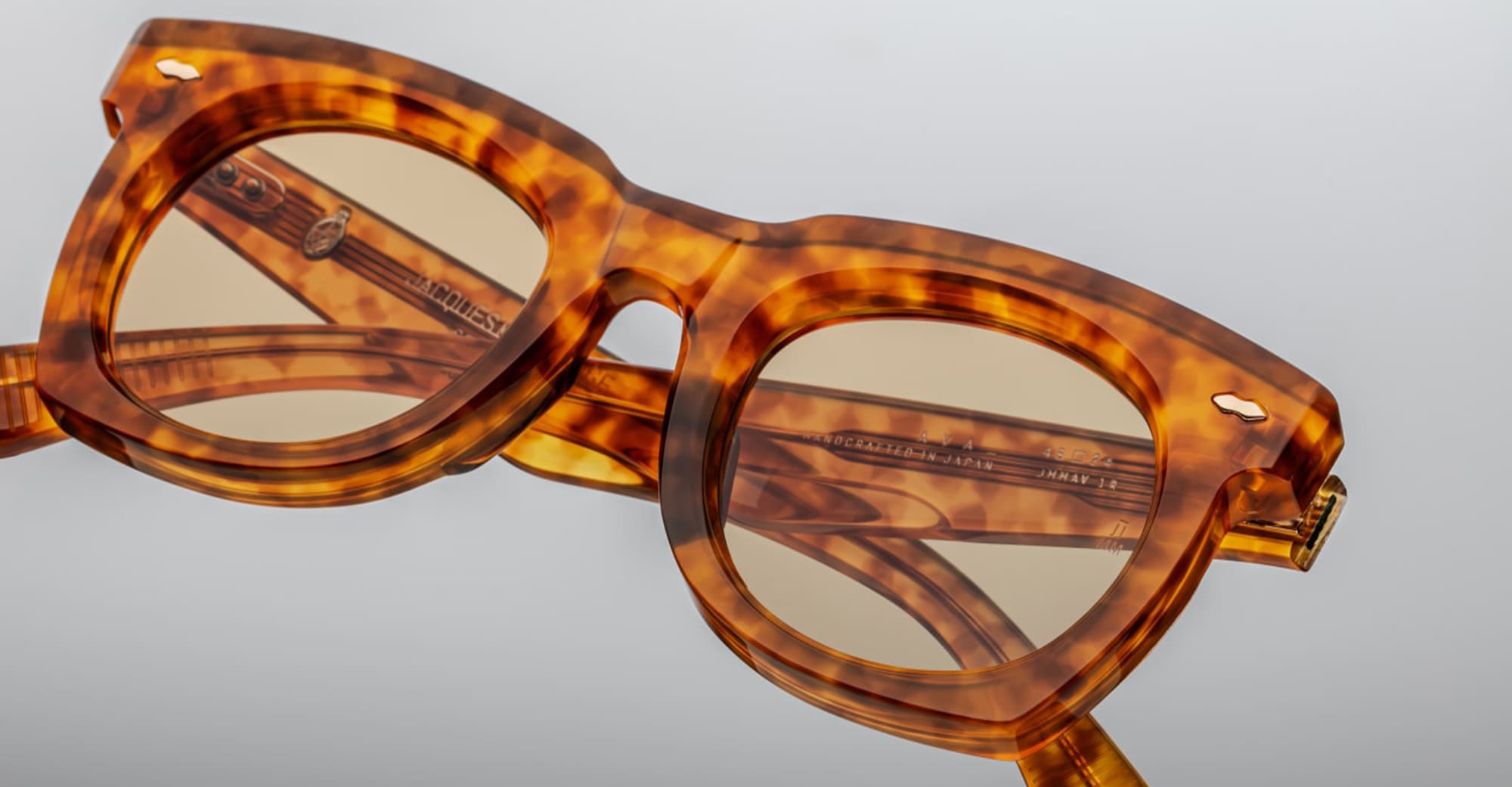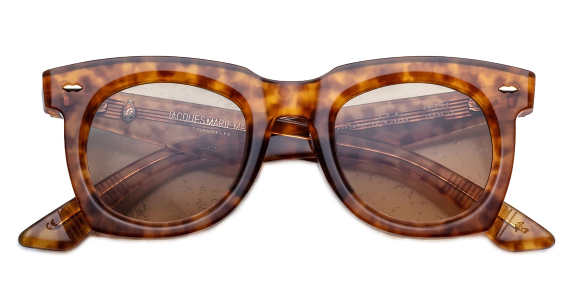 Jacques Marie Mage AVA - CAMEL (JMMAV-1R) are sleek and elegant '50s-inspired sunglasses fo women. They feature brown 8mm cured cellulose acetate frame, custom double laminated temples, light gold double-arrowhead front pins, tension-secured custom ball hinge,yellow CR39 4 base lens with backside ant-reflective treatment, and 100% UV protection.
