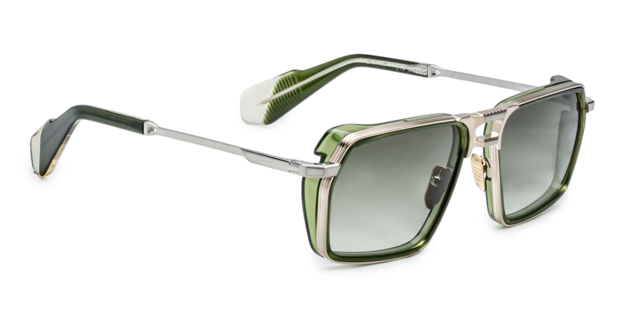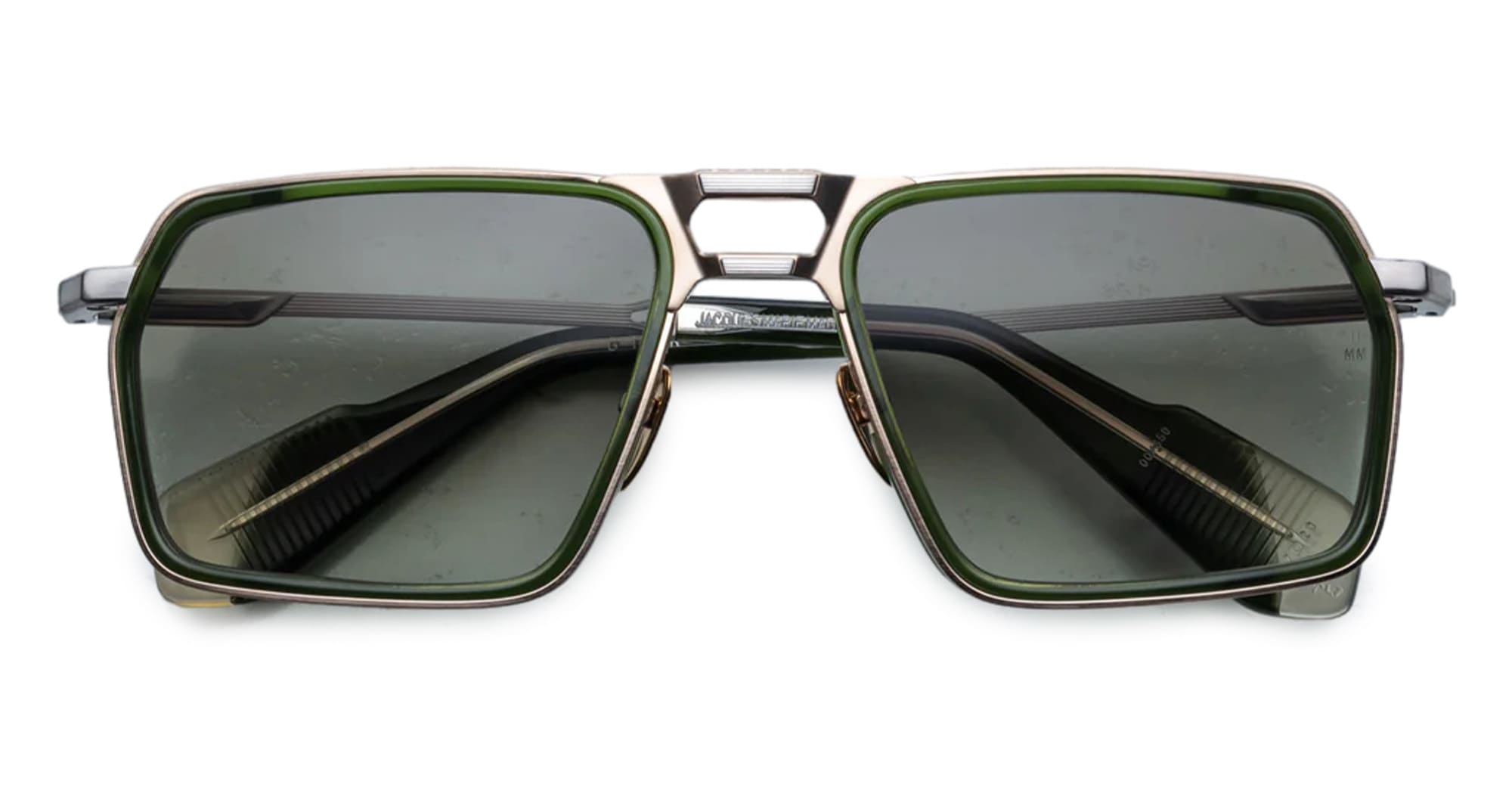 Jacques Marie Mage GT-R - ROVER (JMMGTR-20) are 70s-inspired navigators spectacles, a new iteration of a celebrated JMM style. They feature light gold 100% beta titanium frame with 11mm green cured cellulose acetate lens rim inserts, light gold engraved 100% beta titanium temples with acetate temple tips, custom nose pads, tension-secured custom 917 hinge, and light bottle green gradient CR39 4 base lens with backside anti-reflective treatment and 100% UV protection.