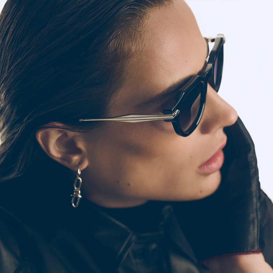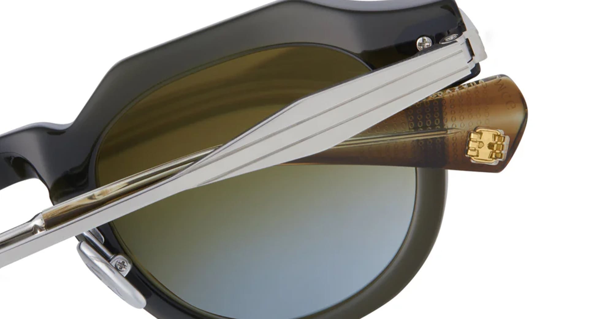 T HENRI M1 - RAINFOREST (MCG-TI) are exclusive panto sunglasses inspired by the German build M1, part of the T Henri eyewear collection. They feature 8mm green hand-carved balck cellulose acetate front with keyhole birdge, silver beta titanium temple with pressed details, adjustable custom titanium nose pads, titanium temples with cellulose acetate temple tips, Japanese titanium hinge, and gradient green Zeiss CR39 lens with 100% UV protection.
