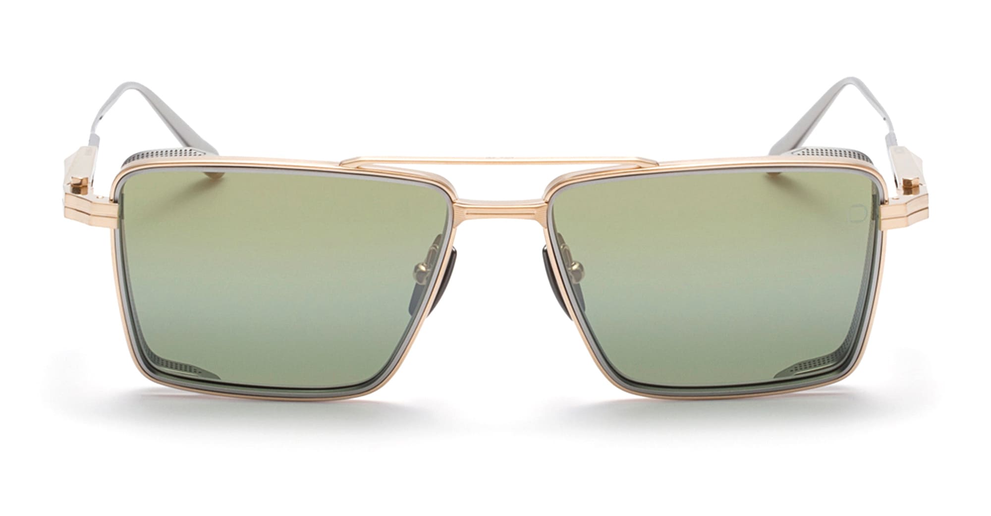 Akoni SPRINT-A - BRUSHED WHITE GOLD / MATTE BLACK (AKS-504A-55) are rectangular sunglasses for man that perfectly harmonize classic and modern style. They feature Japanese titanium structure with double nose bridge, mini side-shields with perforations - reminiscent of the finest vintage sports car interiors, titanium temples with round tips and adjustable temple system, dark olive green lens with with gold glash mirror, 100% UV protection.