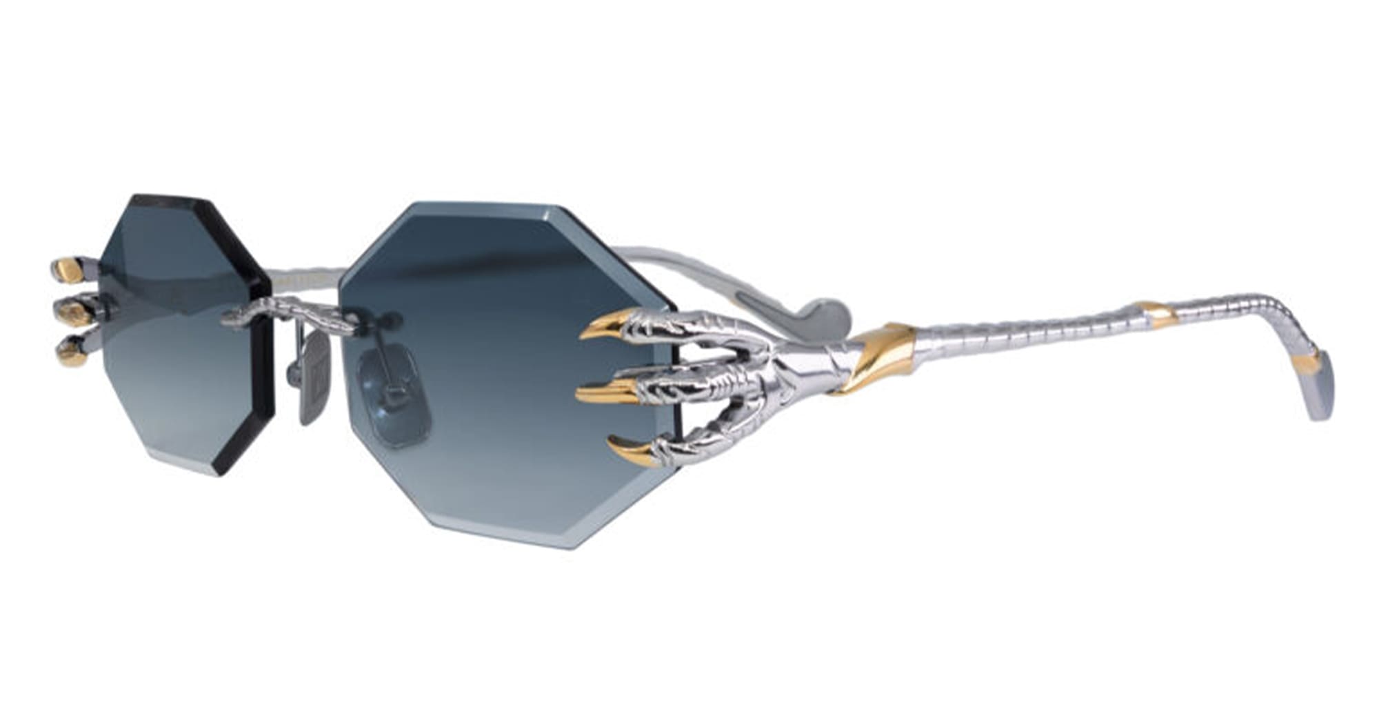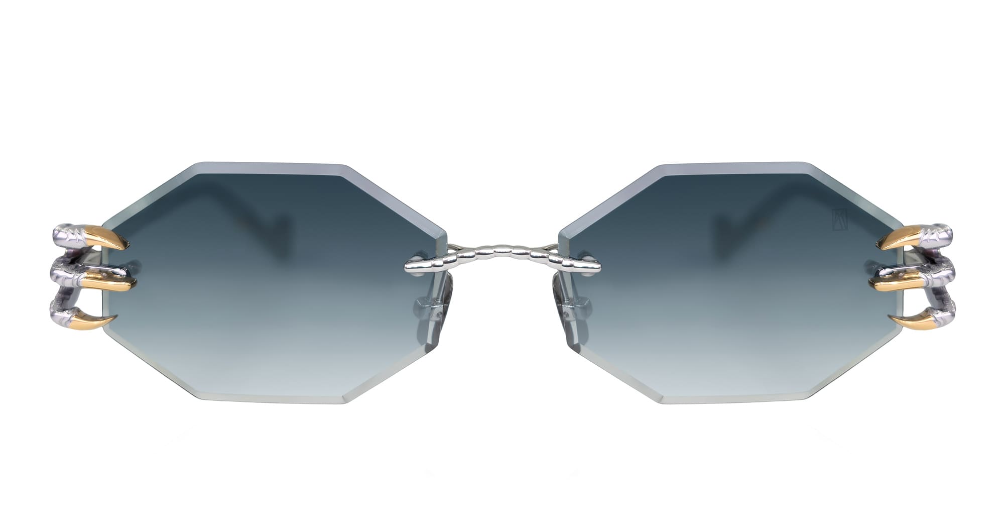 Anna-Karin Karlsson THE CLAW & THE NEST - OCTAGONAL 2.0 - WHITE GOLD (S241-8202) are luxurious, feminine rimless octagonal sunglasses, part of the exclusive Anna-Karin Karlsson eyewear collection. They feature silver and gold titanium structure with claw detail, custom nose pads, grey Zeiss lens engraved with AKK logo and 100% UV protection.