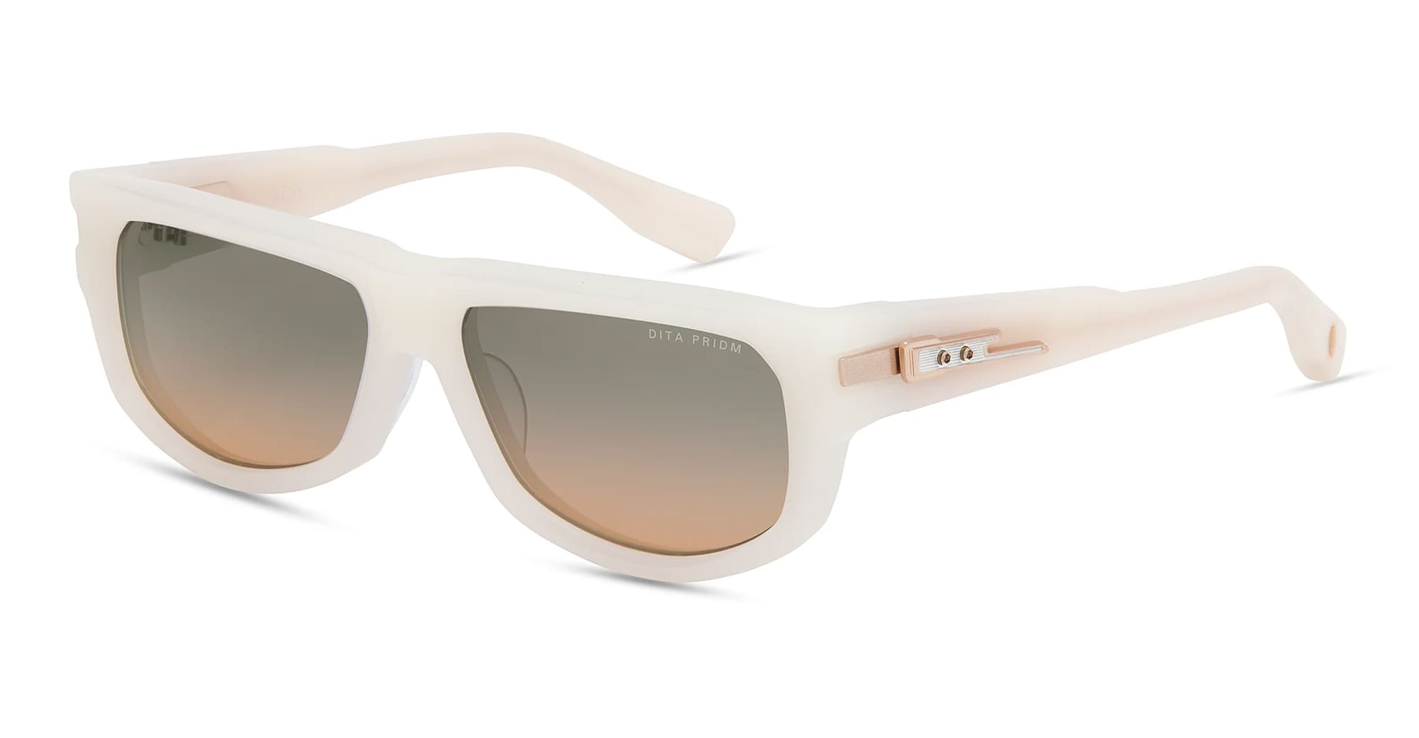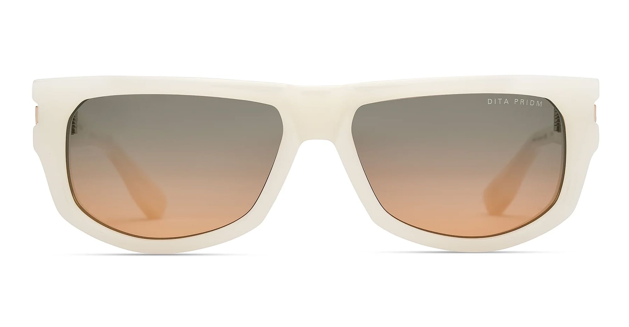 DITA PRIDM - SWANSHELL / WHITE GOLD / WHITE (DTS753-A-03) are bold rectangular sunglasses, part of the Dita eyewear collection. They feature 8mm white Japanese acetate frame, DITA s proprietary titanium hex screw 5-barrel hinge, sculpted acetate temples with custom titanium hinge plate featuring pressed line detailing and hand-applied enamel inlay, gradient grey to apricot lens with 100% UV protection and anti-reflective coating.