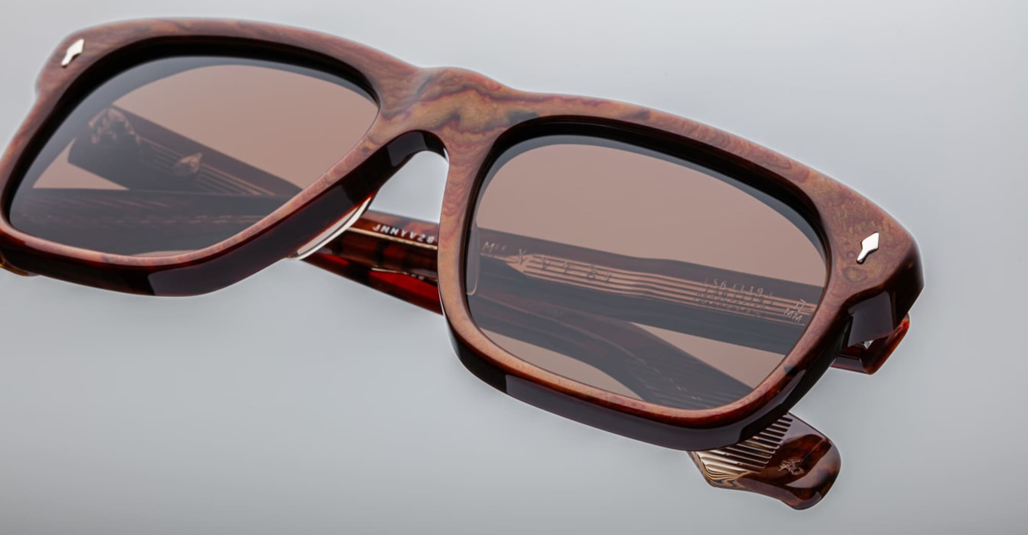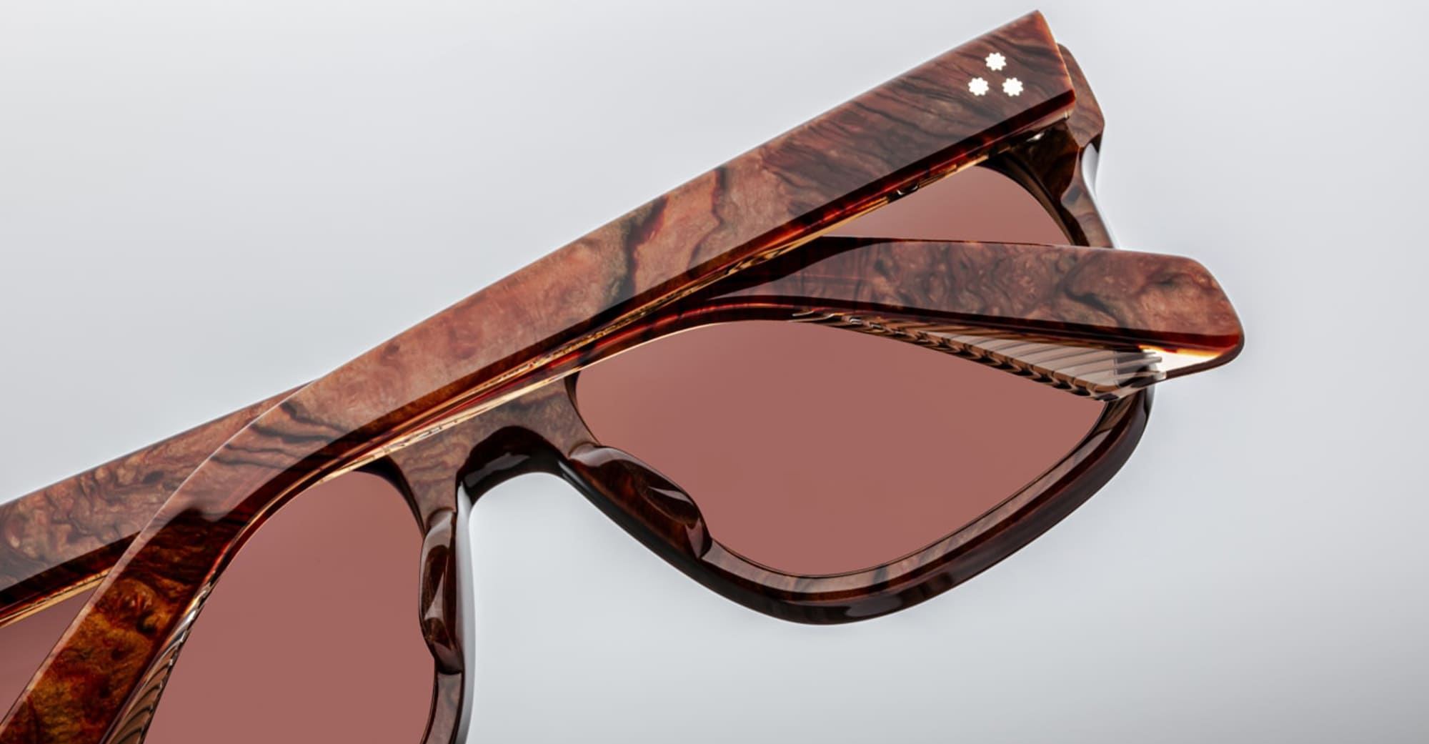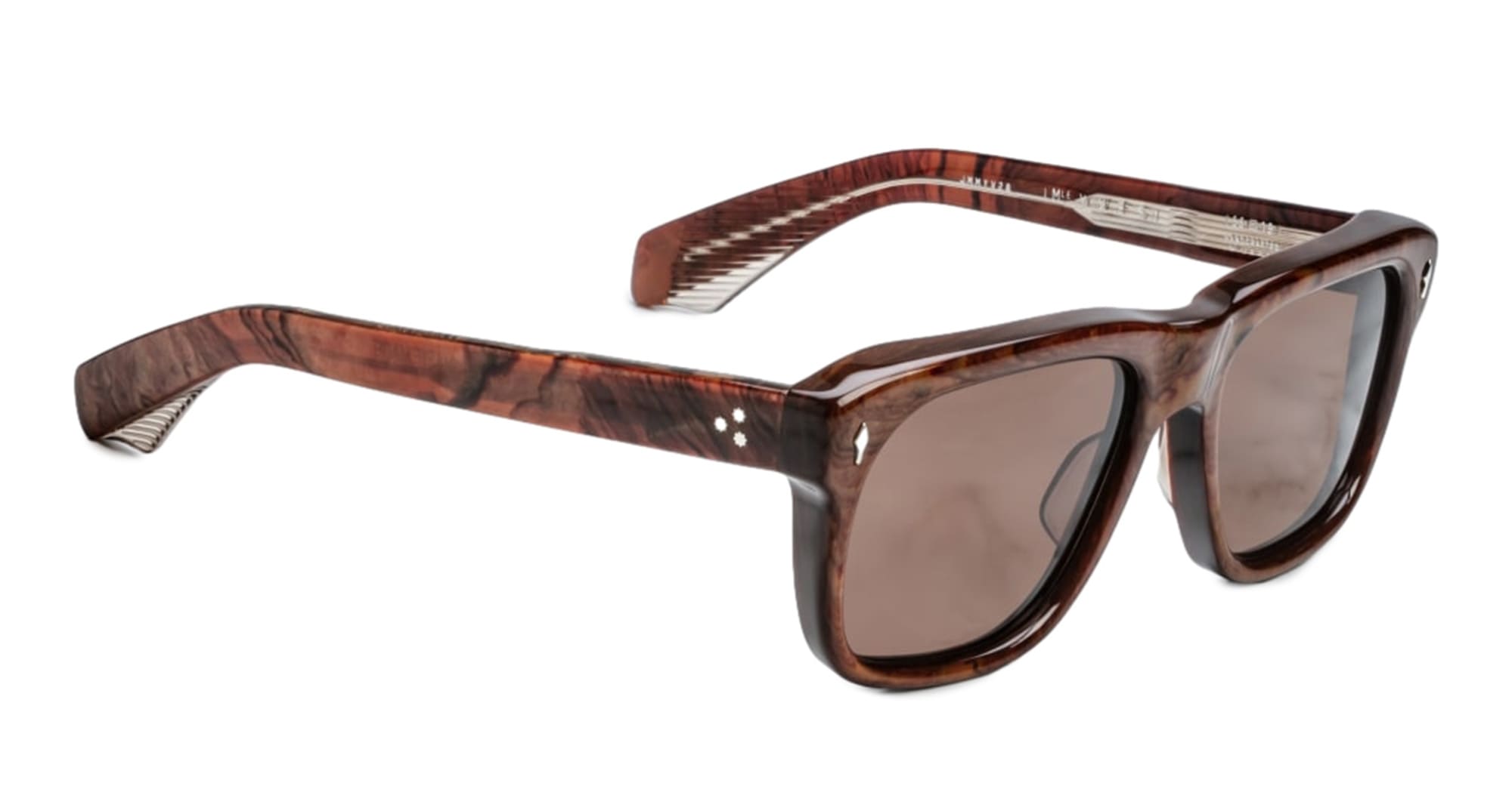 Jacques Marie Mage YVES - BURLWOOD (JMMYV-28) are squared sunglasses with soft lens shape, inspired by the iconic frames worn worn by Yves Saint Laurent during the '70s. They feature brown burlwood pattern 10mm cured cellulose acetate frame, custom double laminated temples, signature silver arrowhead front pins, tension-secured custom 7 barrel hinge with spur-shaped rivets, inner wirecore, sweet brown 4 base CR39 lens with backside anti-reflective treatment and 100% UV protection.