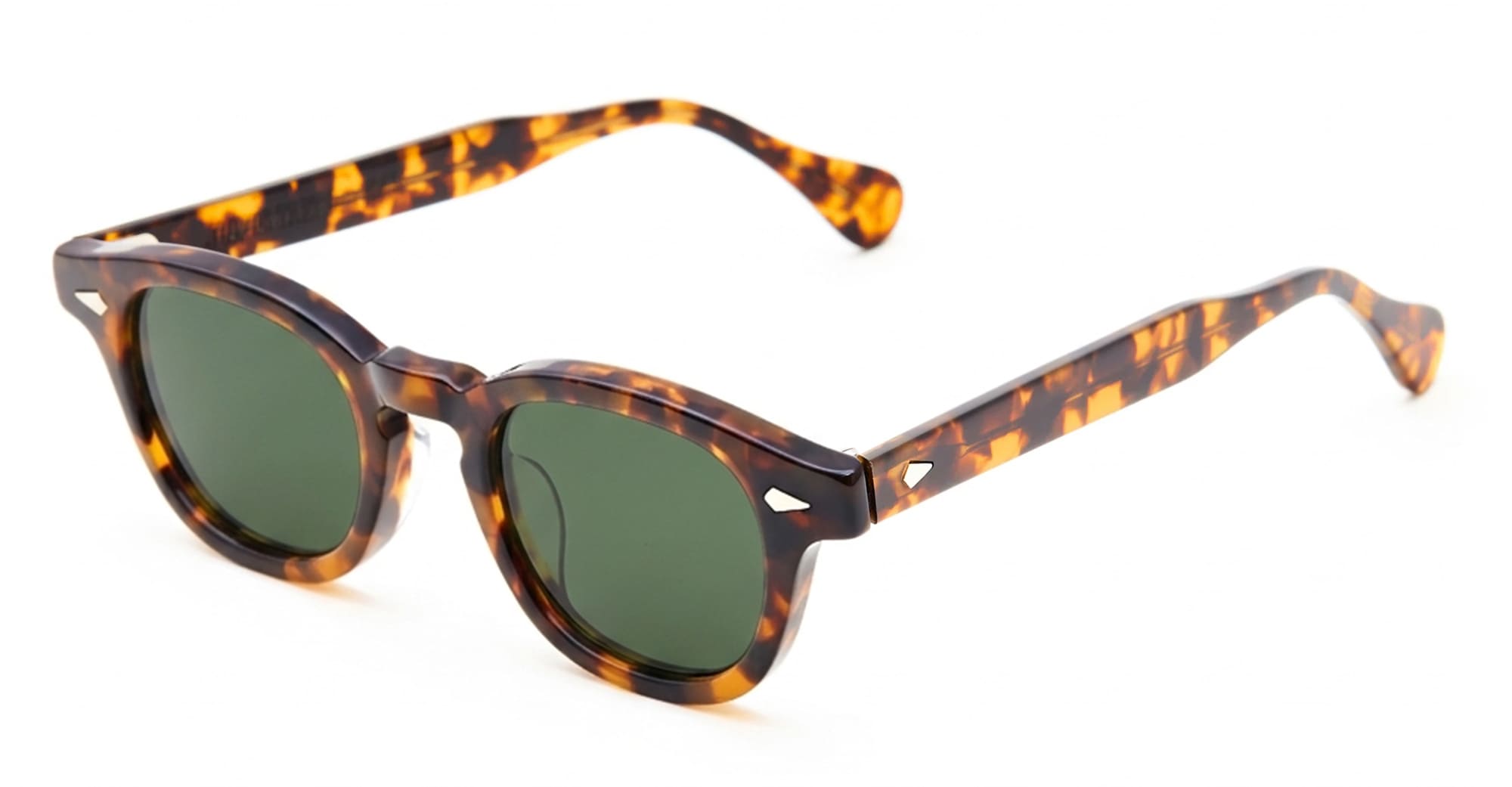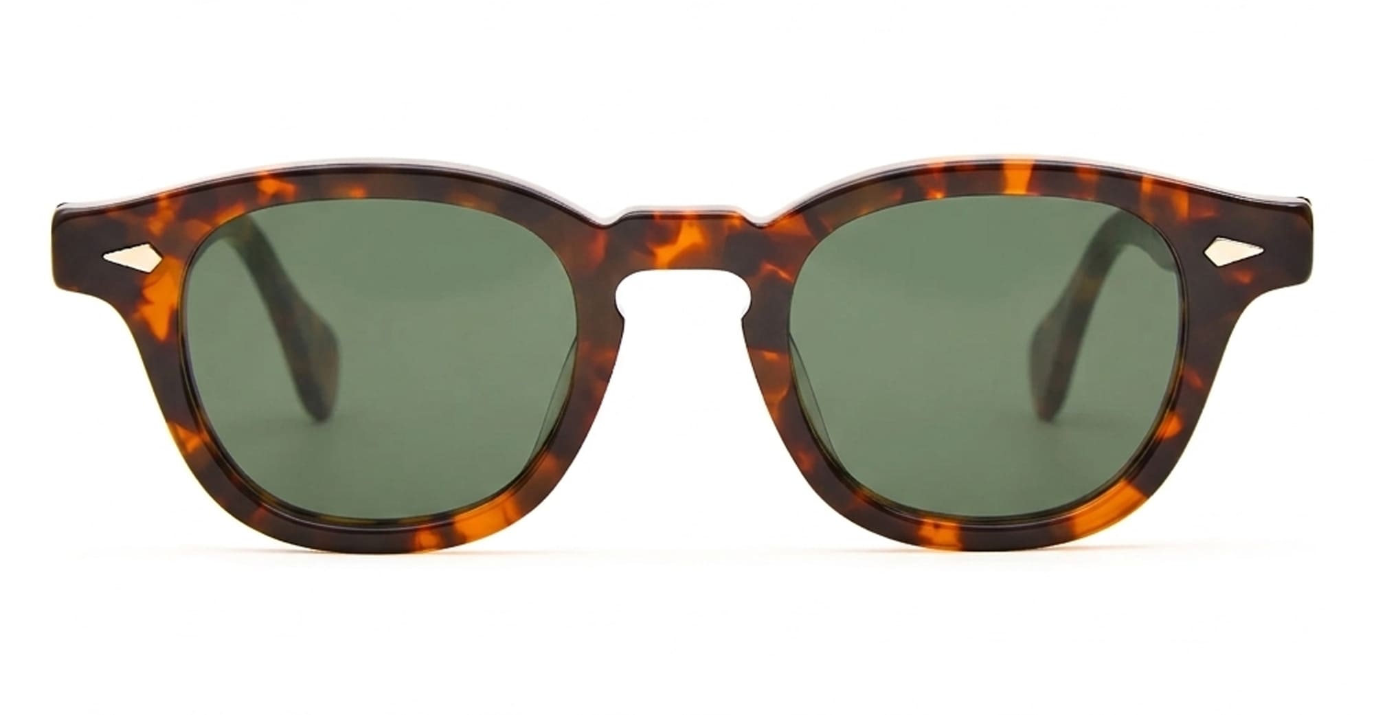 Julius Tart AR 48X24 - TORTOISE / DARK GREEN LENS (JTPL-103C-2B-G-15) are vintage-inspired panto sunglasses made in Japan. They feature tortoise acetate structure with distinctive keyhole bridge, horizontal diamond-shaped front pins on front and temples, dark green lens with 100% UV protection.