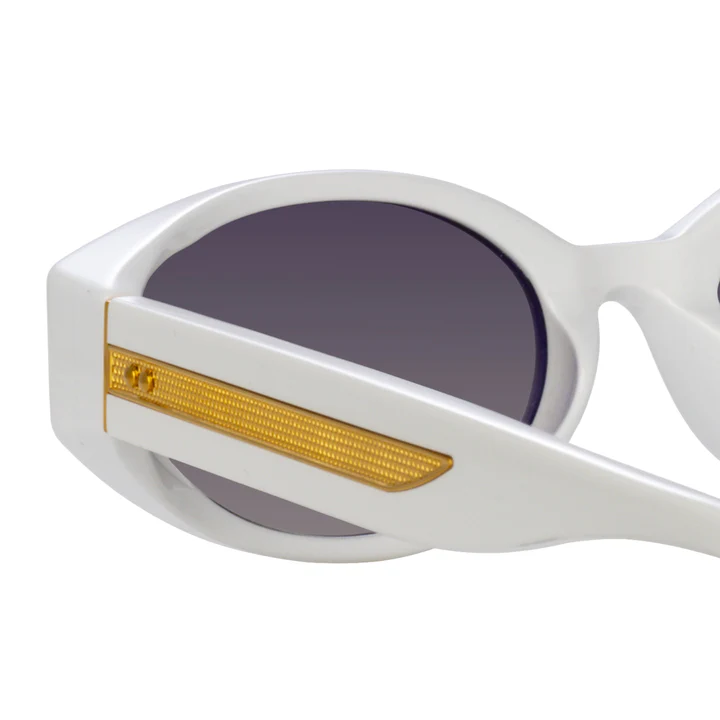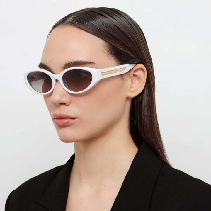 LINDA FARROW LYRA - WHITE / YELLOW GOLD (LFL1540C2SUN) are chic, stylish sunglasses with an oval shape. They feature sculpted white acetate frame, wide acetate temple with rounded temple tips for maximum comfort, exposed yellow gold engraved wirecore, and gradient grey Zeiss lens with 100% UV protection.