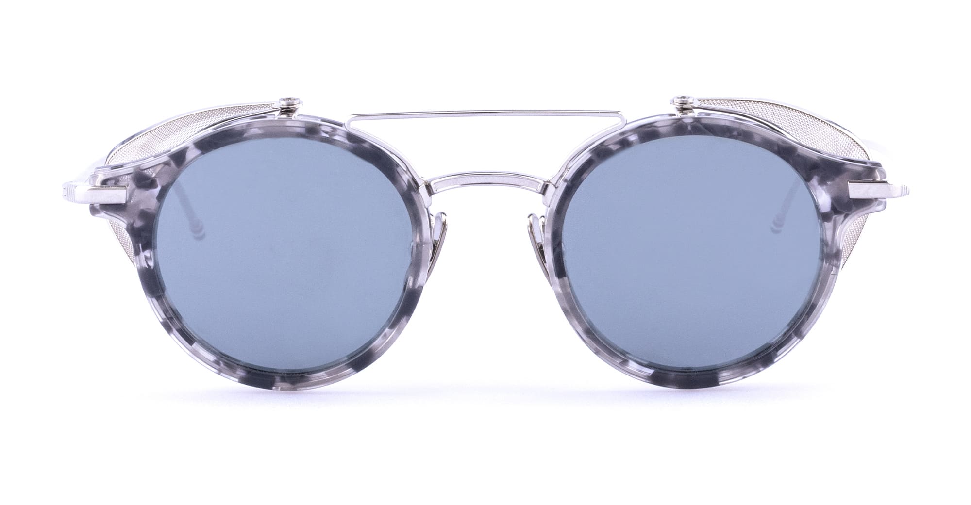Thom Browne ROUND WITH WIDE SHIELD - GREY TORTOISE (UES804A-G0003-020-45) are round aviator sunglasses made in Japan. They feature grey tortoise acetate and silver tone titanium structure, titanium brow bar, elegant titanium mesh side shields, custom titanium nose pads, signature 4-bars, striped enamel temple tips, and grey lens with 100% UV protection.