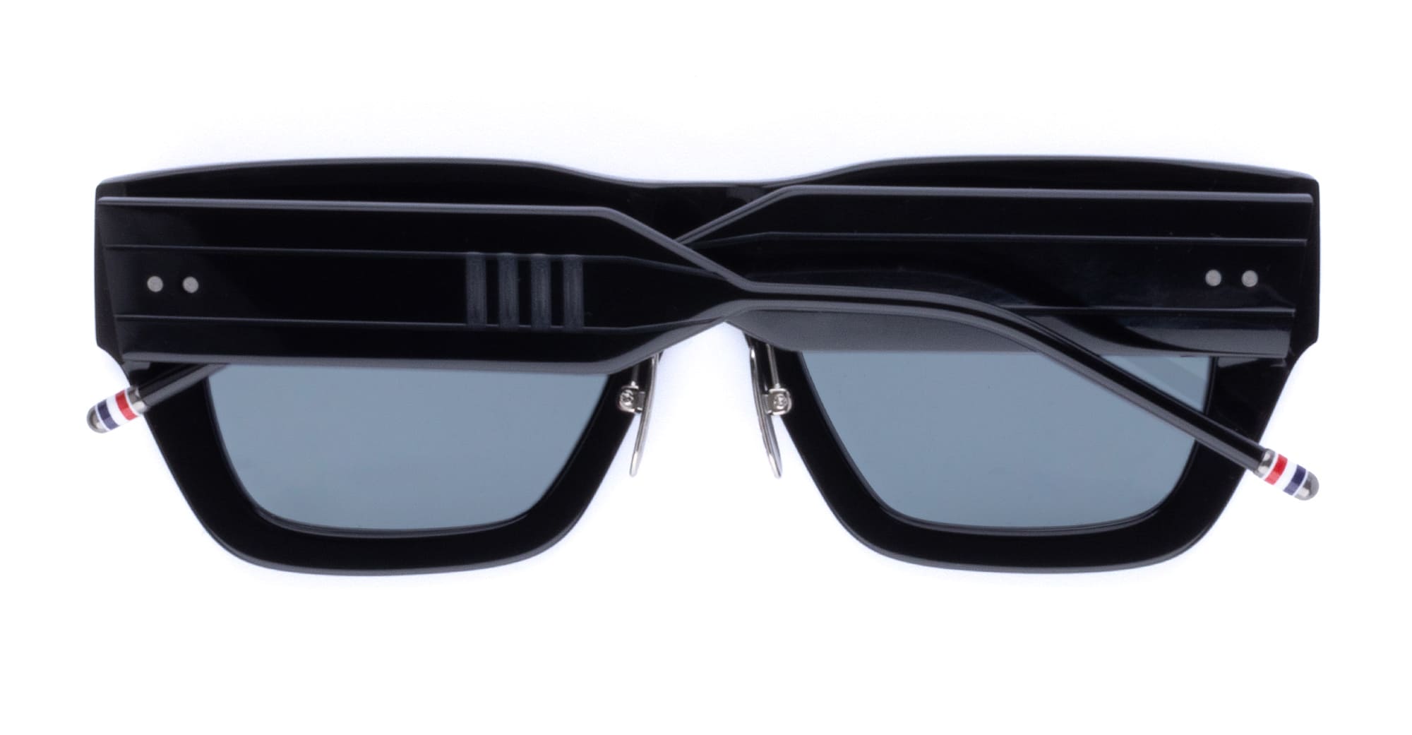 Thom Browne RECTANGULAR - BLACK / ASIAN FIT (UES947Z-G0002-001-52) are elegant rectangular sunglasses, part of the exclusive Thom Brown Eyewear Collection. They feature black acetate frame, signature 4-bars, custom asian fit nose pads, wide temples with iconic Thom Browne striped enamel temple tips, and grey lens with 100% UV protection.