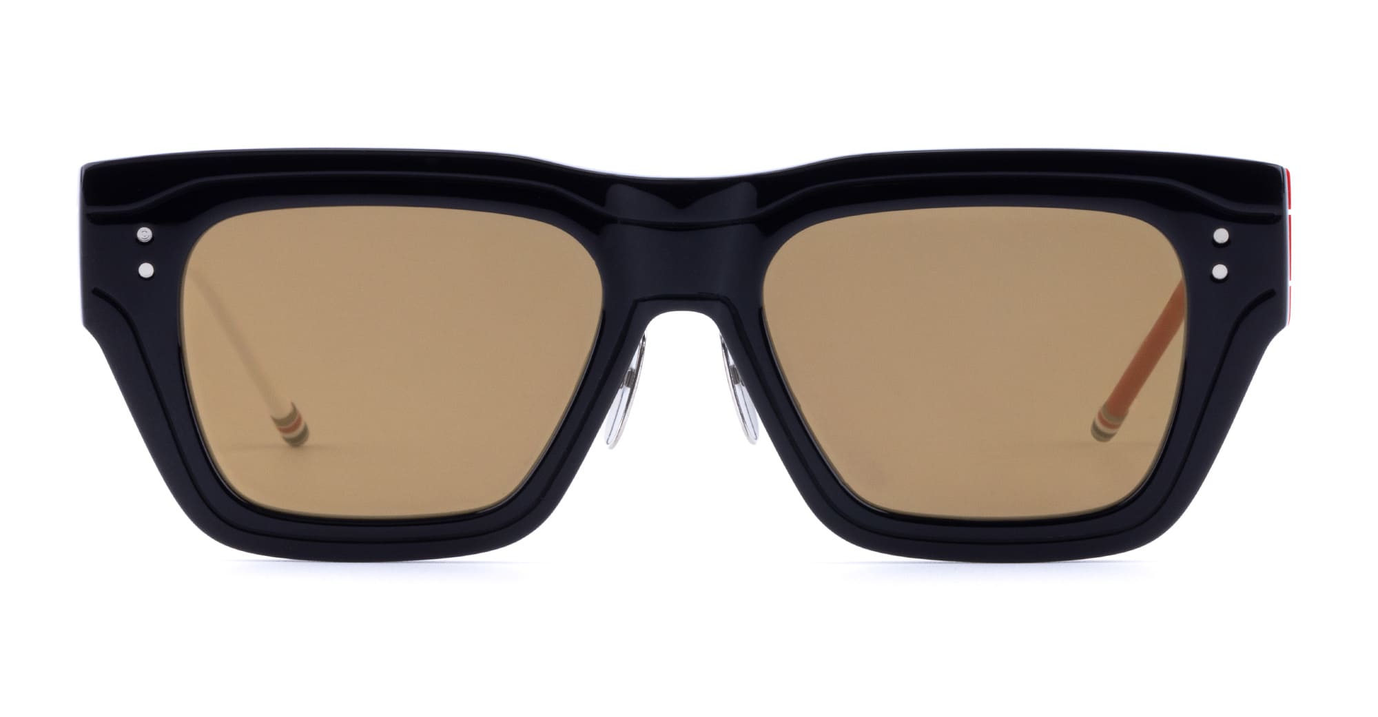 Thom Browne RECTANGULAR - NAVY / WHITE / RED ASIAN FIT (UES947Z-G0002-964-52) are elegant rectangular sunglasses, part of the exclusive Thom Brown Eyewear Collection. They feature navy acetate frame, signature 4-bars, custom asian fit nose pads, red and white wide temples with iconic Thom Browne striped enamel temple tips, and gold mirror lens with 100% UV protection.
