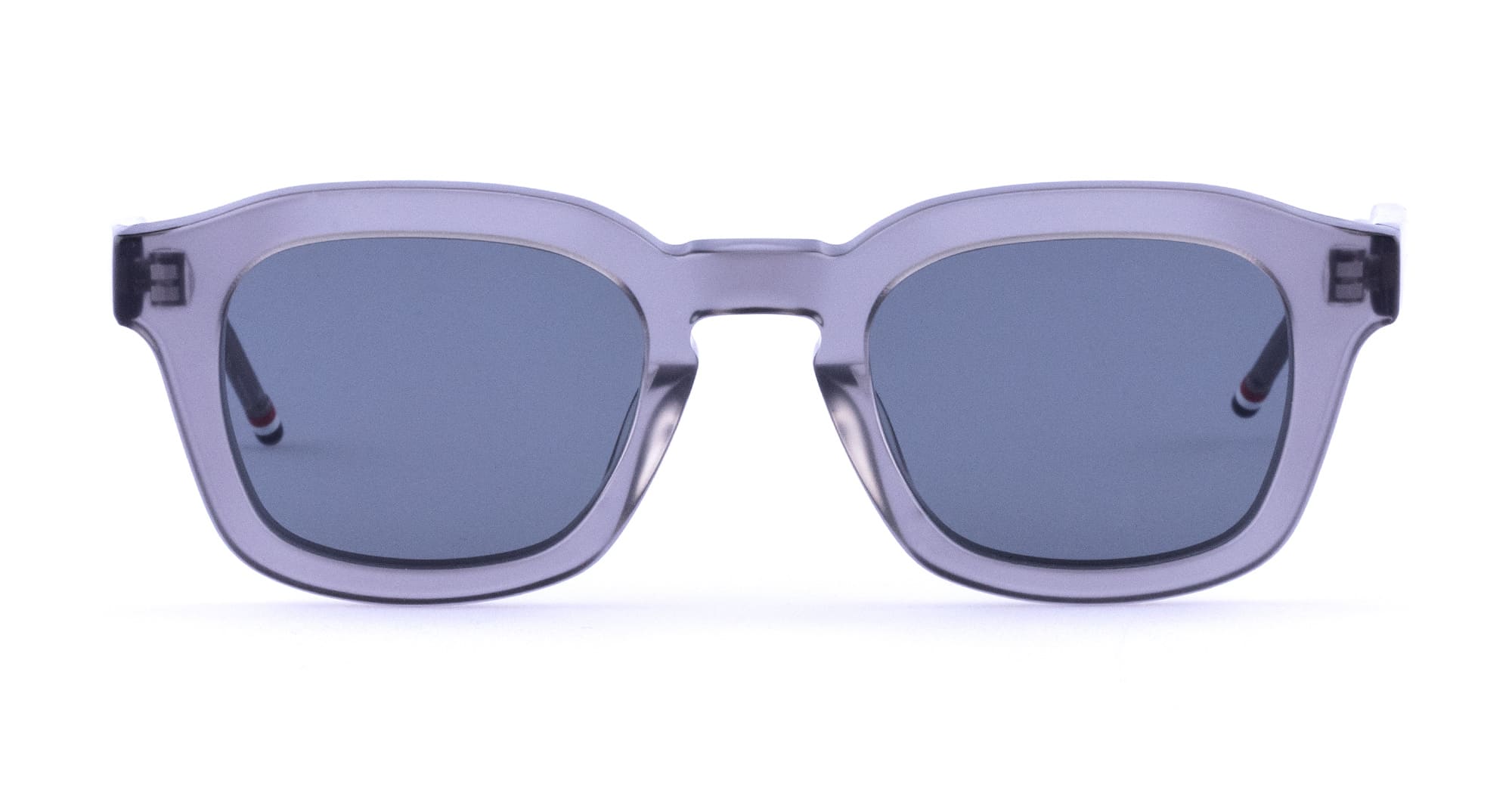 Thom Browne RECTANGULAR - SATIN CRYSTAL GREY (UES412A-G0002-060-48) are rectangular sunglasses made in Japan. They feature transparent satin grey acetate frame, signature 4-bars, striped enamel temple tips, and grey lens with 100% UV protection.
