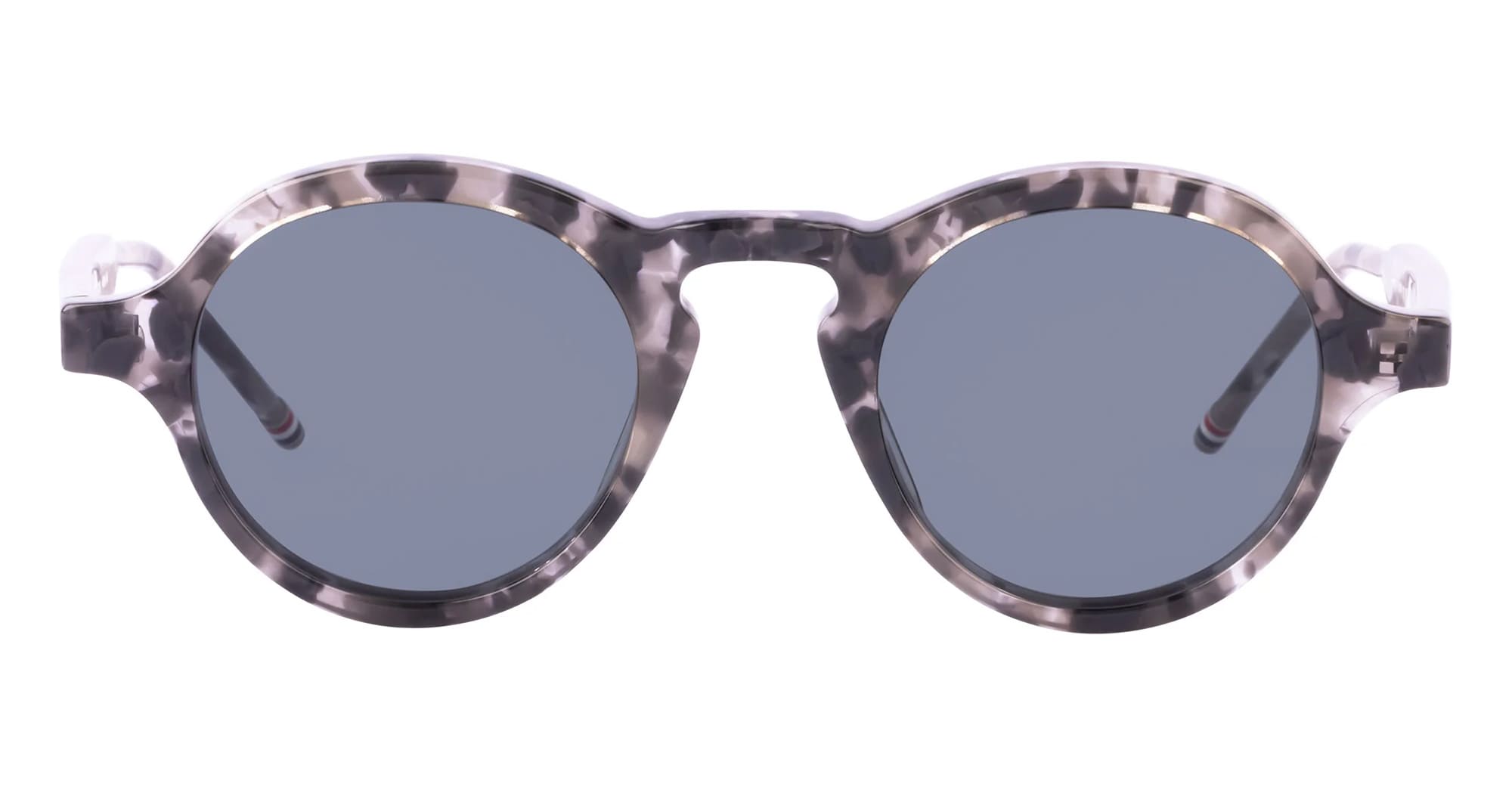 Thom Browne ROUND - DARK GREY (UES926A-G0002-025-47) are elegant round sunglasses, part of the Thom Brown eyewear collection. They feature grey tortoise Japanese acetate frame, signature 4-bars, iconic Thom Browne striped enamel temple tips, and blue lens with 100% UV protection.