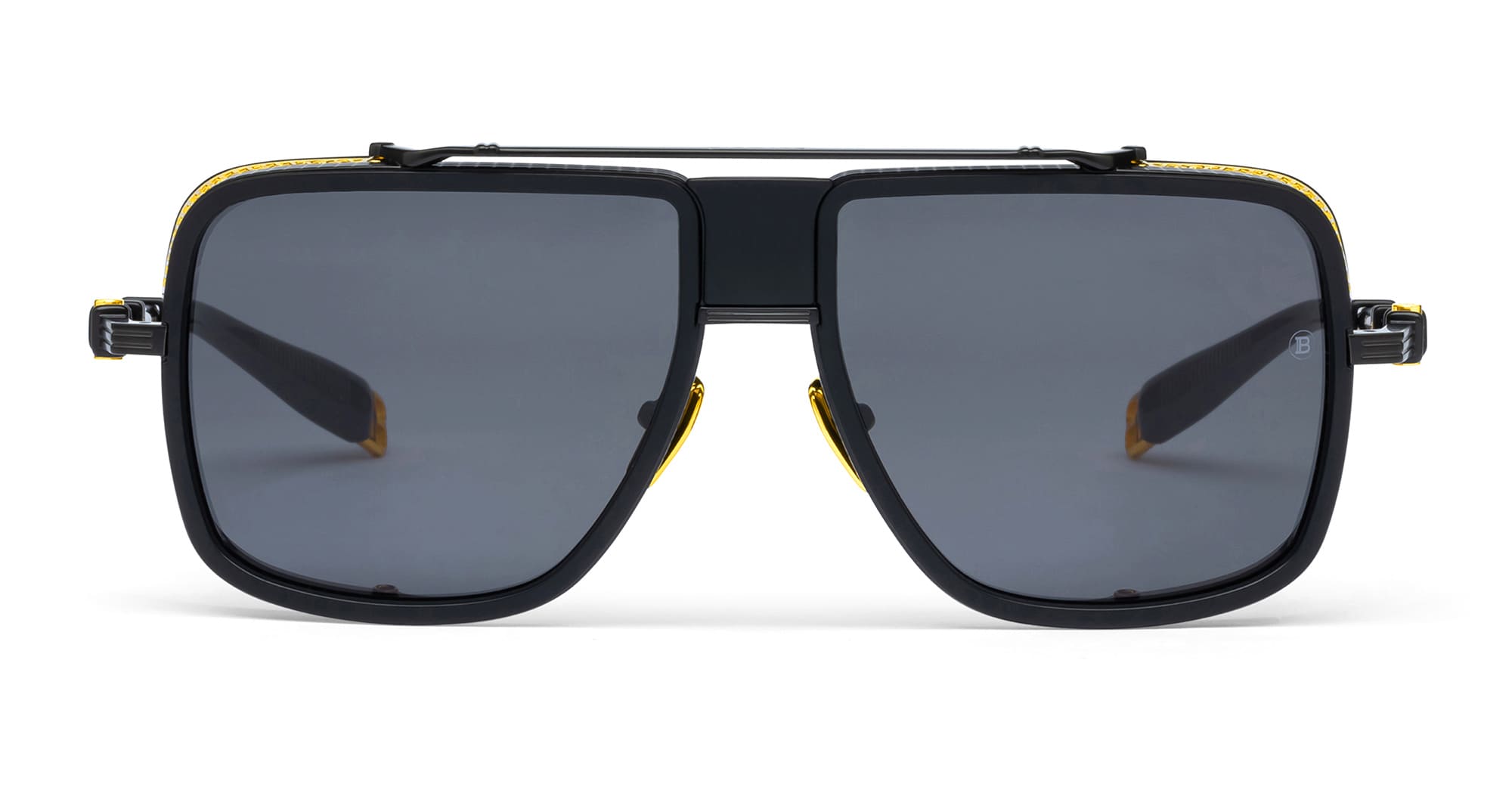 Balmain O.R. - MATTE BLACK / 18K GOLD (BPS-104G-59) sono sofisticati occhiali da sole in stile navigator fatti in Giappone, con una silhouette di ispirazione rétro. Presentano una montatura in titanio giapponese color oro opaco, doppio ponte con logo sulla parte superiore, paraocchi laterali a rete placcati oro 18 carati, aste sottili in titanio nero e finali in acetato giapponese, lenti grigio scuro con trattamento antiriflesso e protezione UV al 100%.