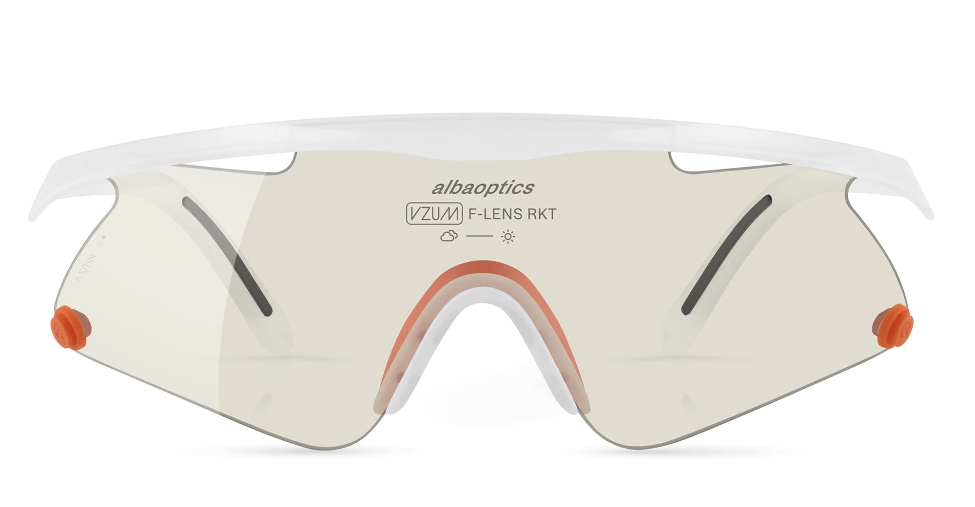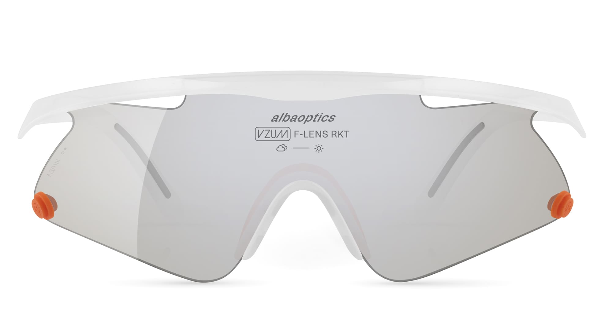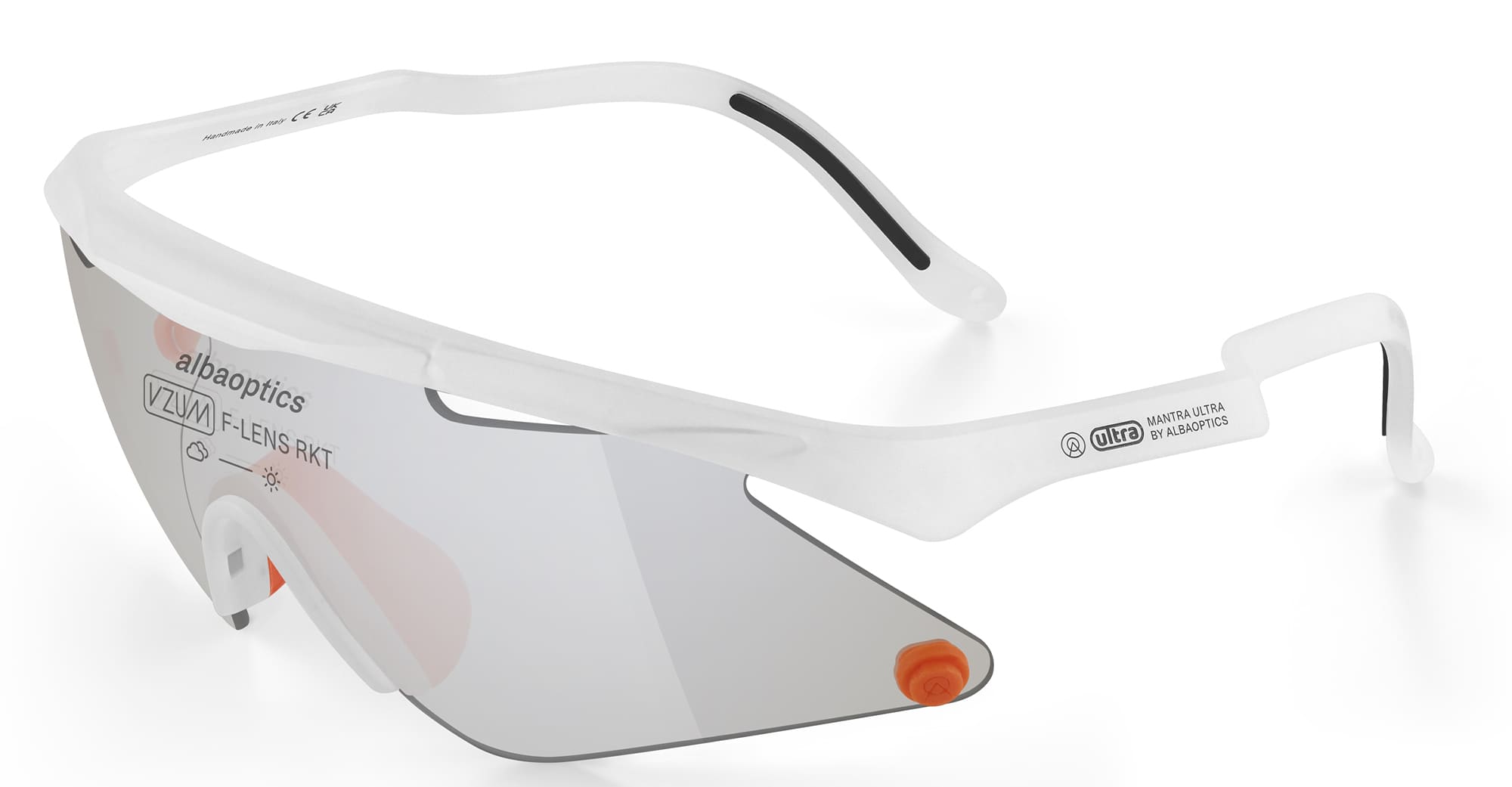 Alba Optics MANTRA ULTRA WHITE - VZUM F-LENS RKT (8050054514611) sono occhiali da sole a mascherina sportivi in edizione limitata realizzati in Italia, parte della Collezione Ultra. Sono caratterizzati da una montatura monopezzo in Tr90 leggera di 24 g, lenti intercambiabili, aste ergonomiche, lenti fotocromatiche VZUM U-Lente (più piccole del 10% rispetto alle lenti Mantra tradizionali) con bottoni decorativi con logo in gomma arancione, rivestimento a scudo e protezione UV al 100%. Possono essere indossati sul casco, sulla testa o appesi al collo.