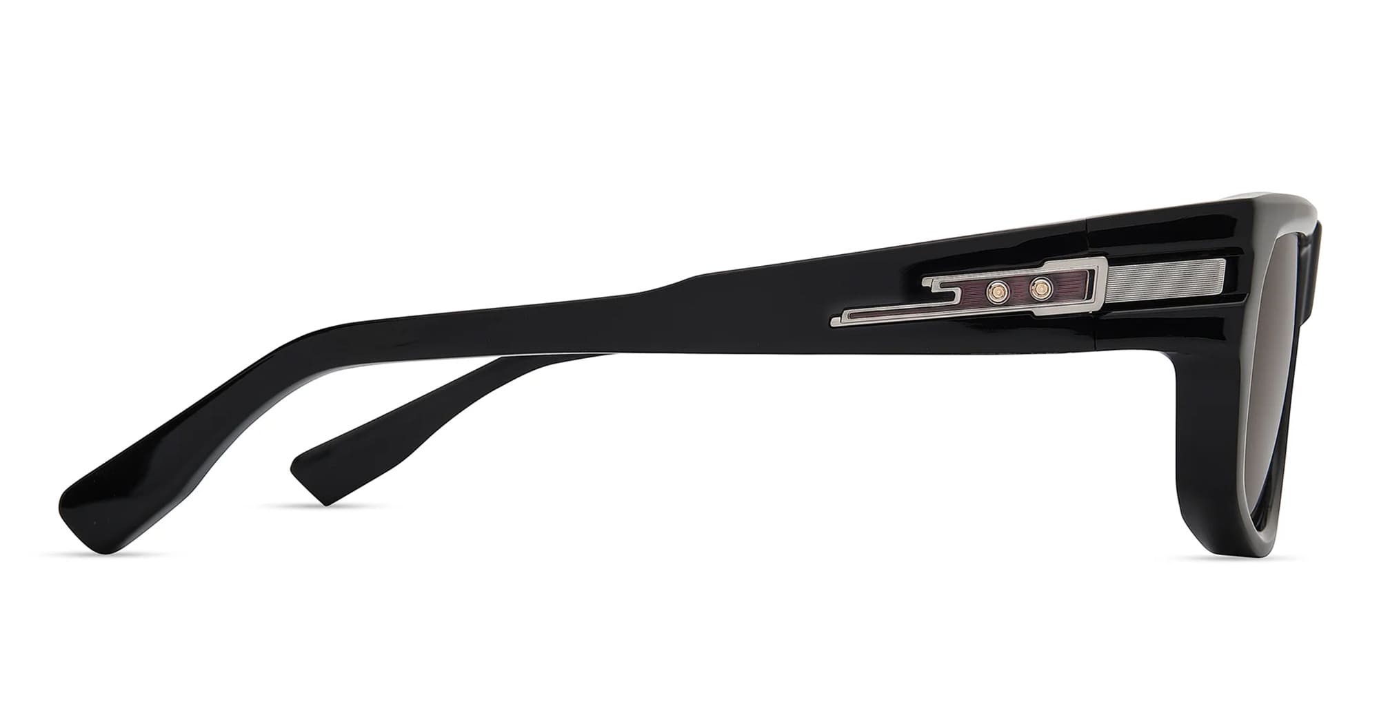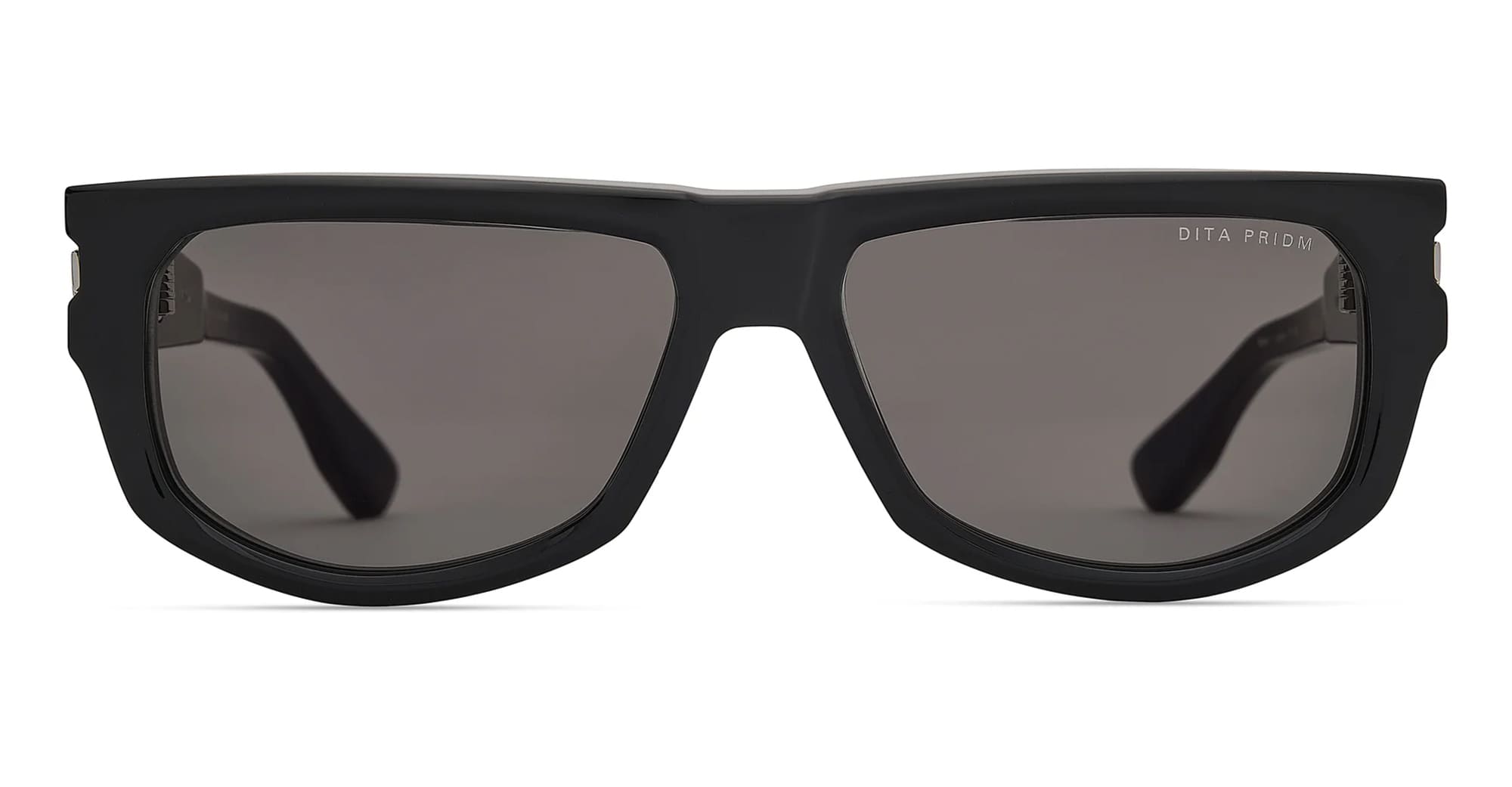 DITA PRIDM - BLACK / BLACK PALLADIUM / RED (DTS753-A-02) are bold rectangular sunglasses, part of the Dita eyewear collection. They feature 8mm matte black Japanese acetate frame, DITA s proprietary titanium hex screw 5-barrel hinge, sculpted acetate temples with custom titanium hinge plate featuring pressed line detailing and hand-applied enamel inlay, grey lens with 100% UV protection and anti-reflective coating.