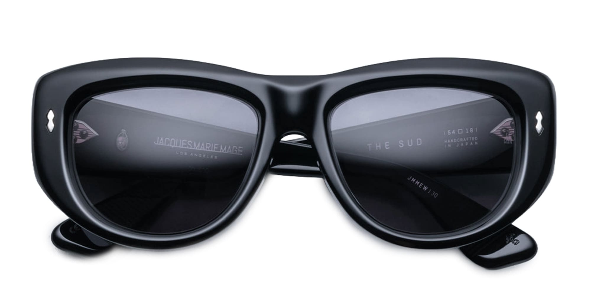 Jacques Marie Mage ERIN WASSON - SUD - FRANCOISE (JMMEW-13Q) sono occhiali da sole tondi prodotti in Giappone, parte della collezione Erin Wasson for JMM e ispirati alla cantante francese Françoise Hardy. Montatura in acetato di cellulosa polimerizzato nero da 10 mm, aste doppie in acetato personalizzate con minuteria in metallo prezioso, perni frontali a doppia punta di freccia in argento, anima in filo nascosta, cerniera a 7 barilotti fissata in tensione, stemma di Marsiglia in argento sulla punta delle aste e lenti CR39 a base 6 nere con trattamento antiriflesso sul lato posteriore e protezione UV al 100%.
