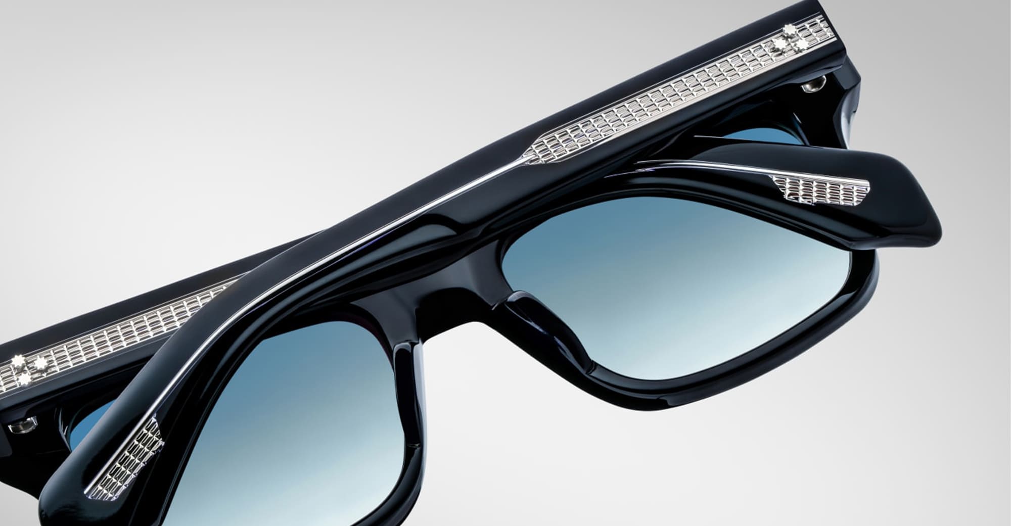 Jacques Marie Mage TORINO EPOXY - PRUISSE (JMMTR-13J) sono occhiali da sole di ispirazione anni '60 dalla forma rettangolare e audace, ispirati al Teatro Regio di Torino, storico teatro italiano, parte della Jacques Marie Mage Epoxy Collection. Montatura blu da 10 mm acetato di cellulosa, aste doppie laminate personalizzate, perni frontali a punta di freccia in argento sterling personalizzati con intarsio epossidico blu navy, esposizione anima con motivo a "baguette", cerniera a 7 barrette fissata a tensione, lente CR39 a 6 basi sfumata blu Nettuno con trattamento antiriflesso sul retro e protezione UV al 100%.