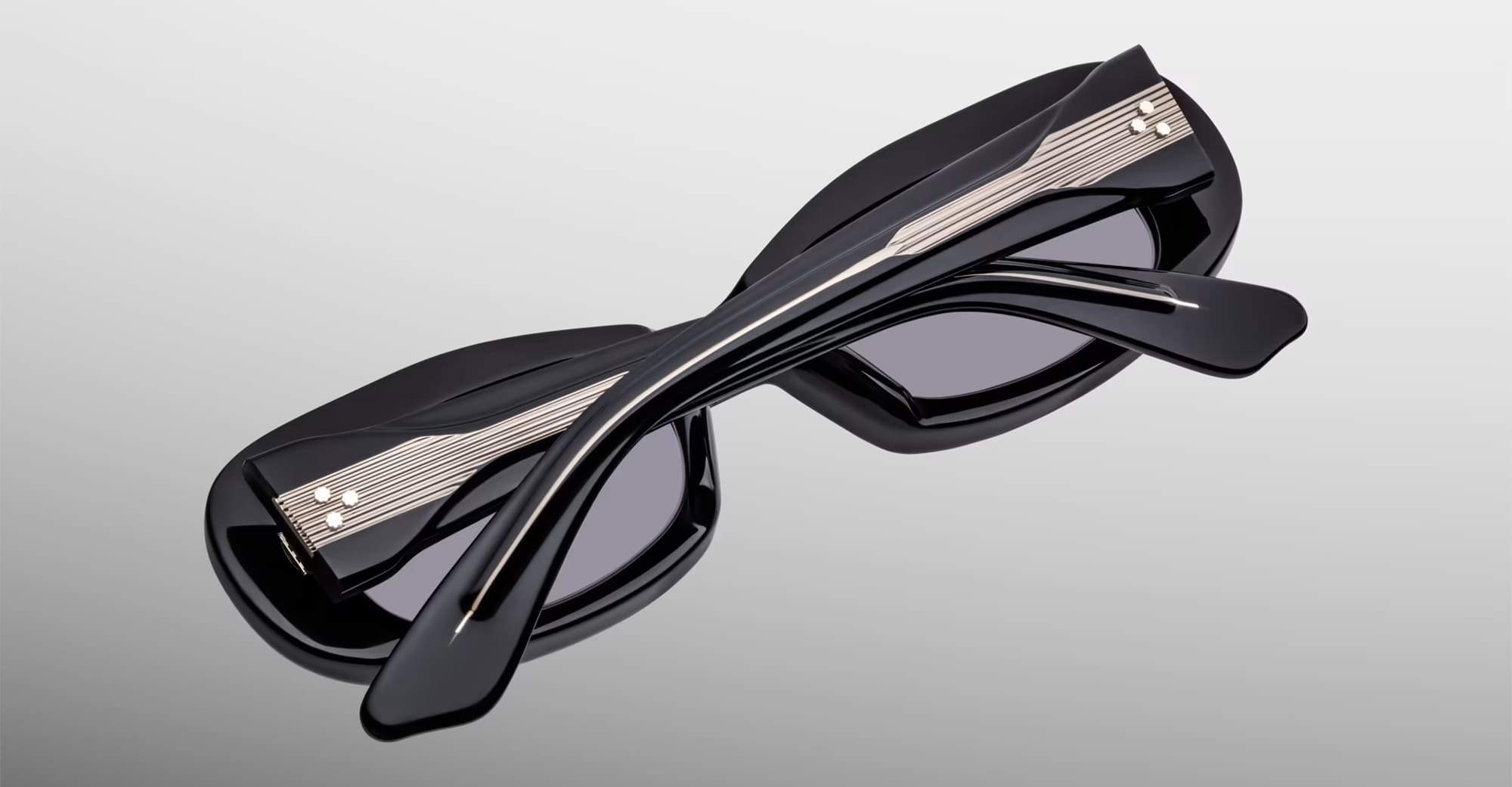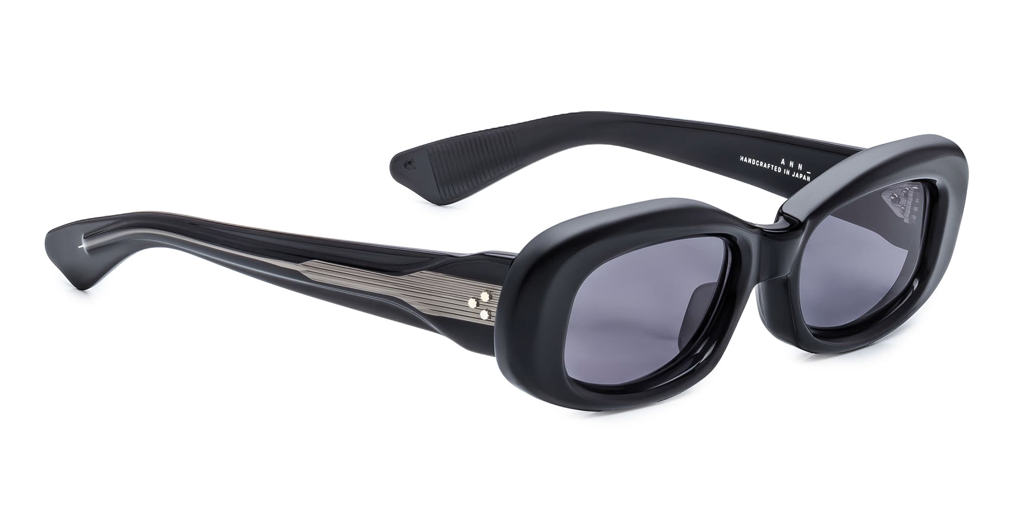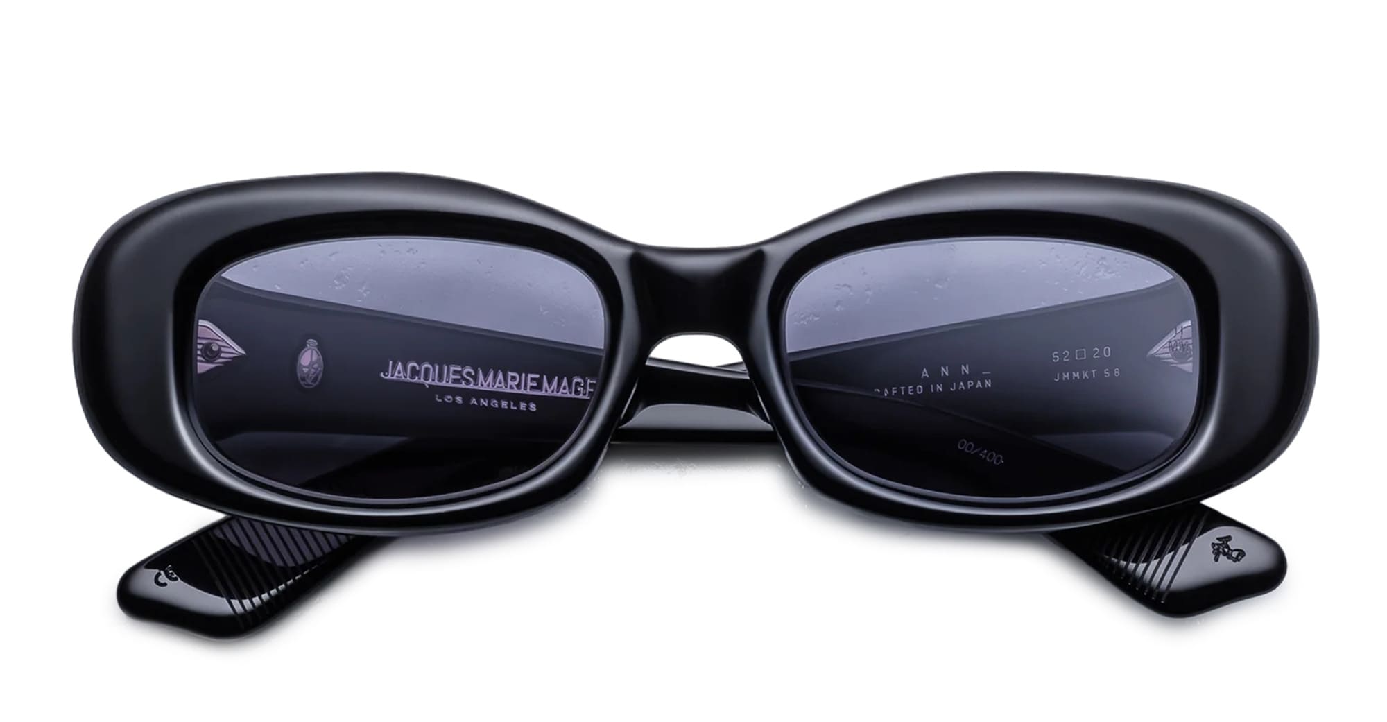 Jacques Marie Mage ANN - RAVEN (JMMKT-58) are oval '90s-inspired sunglasses with butterfly-esque volumes and medium fit. They feature 10mm balck cured cellulose acetate frame, custom acetate temples, silver palladium exposed wirecore, tension-secured custom 7 barrel hinge with spur-shaped rivets, and charcoal 2 base CR39 lens with backside anti-reflective treatment with 100% UV protection.