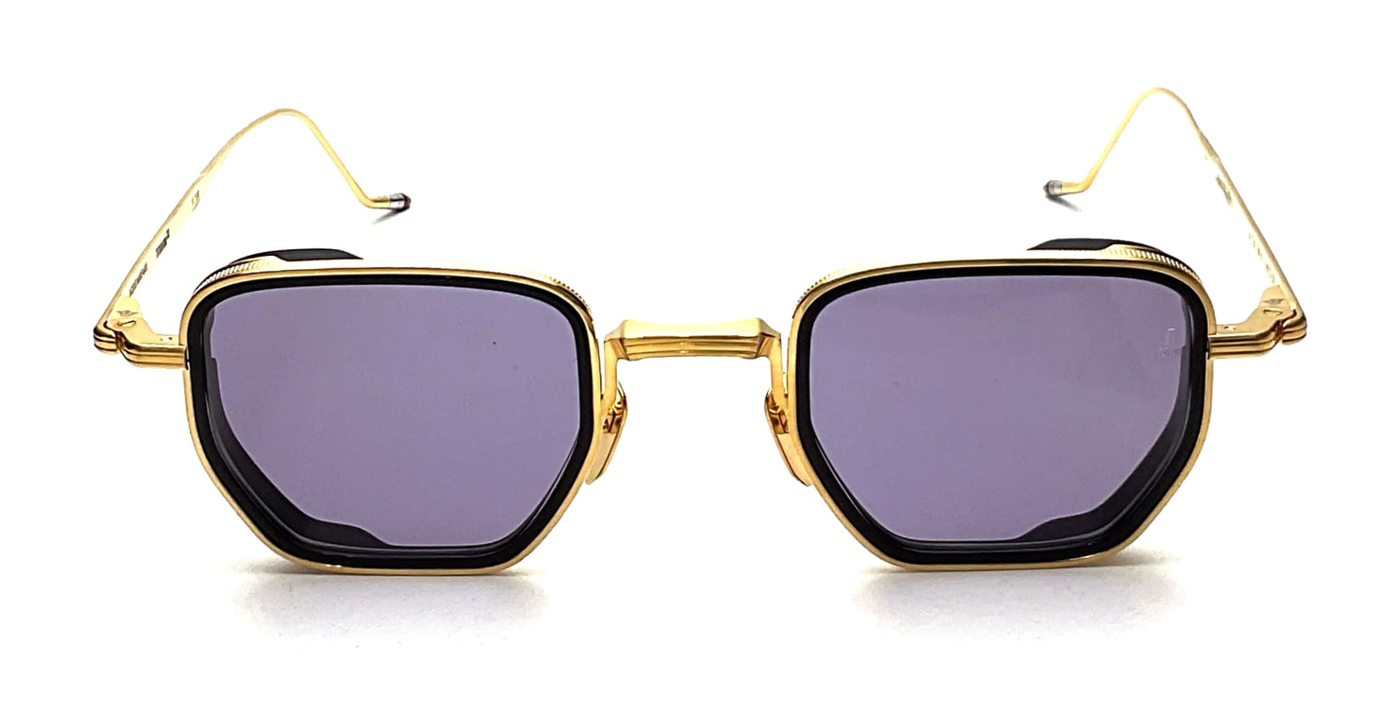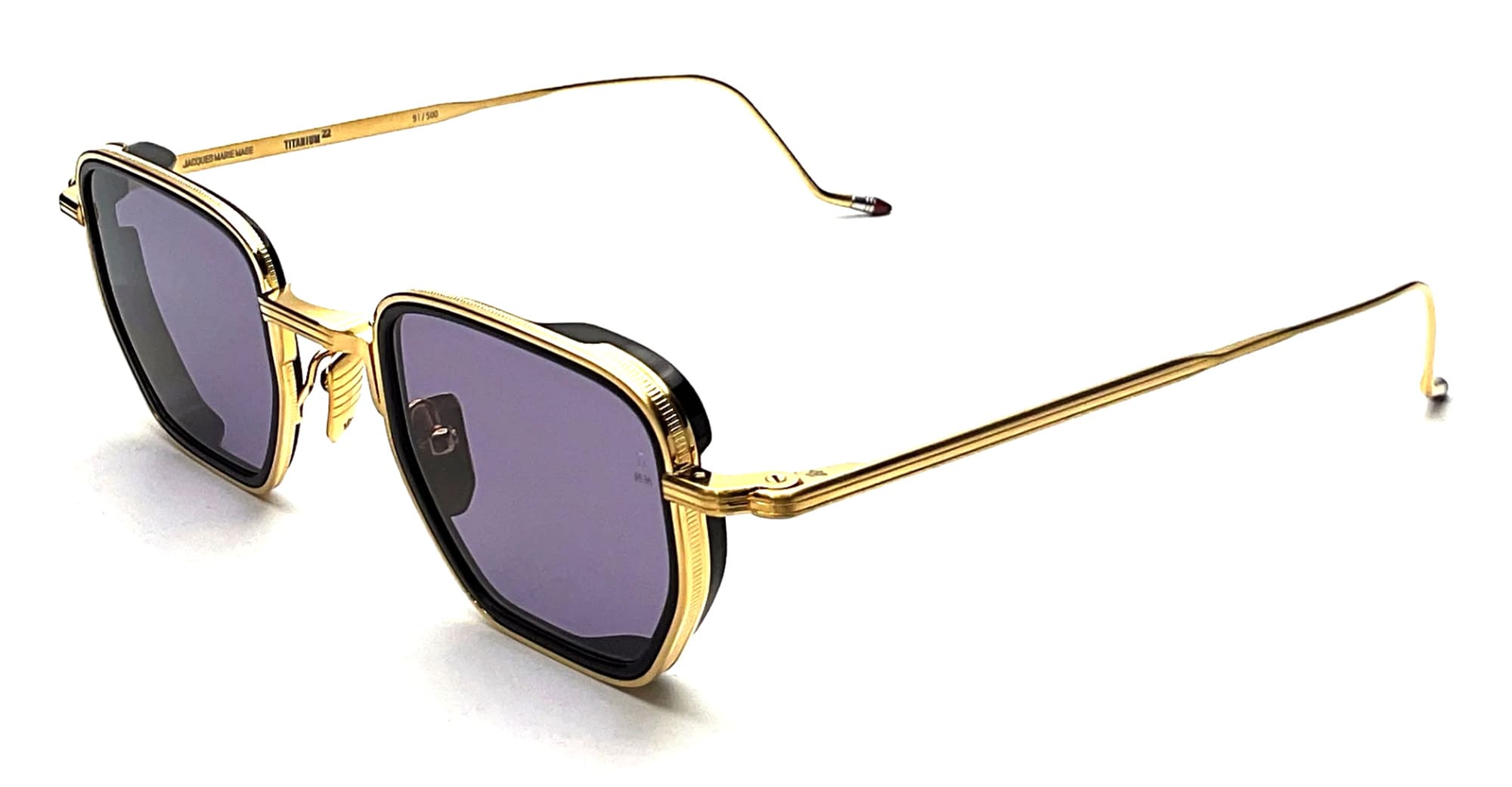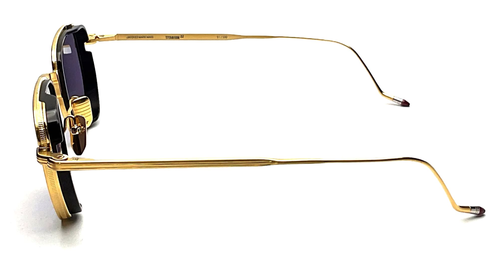 Jacques Marie Mage ATKINS - GOLD (JMMTK-40 ) are squared sunglasses with soft angles, part of JMM's Titanium Series. They feature gold 100% beta titanium with 10mm grey acetate eyerim inserts, monoblock hinge construction, custom nose pads, titanium temples with burgundy epoxy temple tips, nimbus 2 base lens with backside anti-reflective treatment and 100% UV protection.
