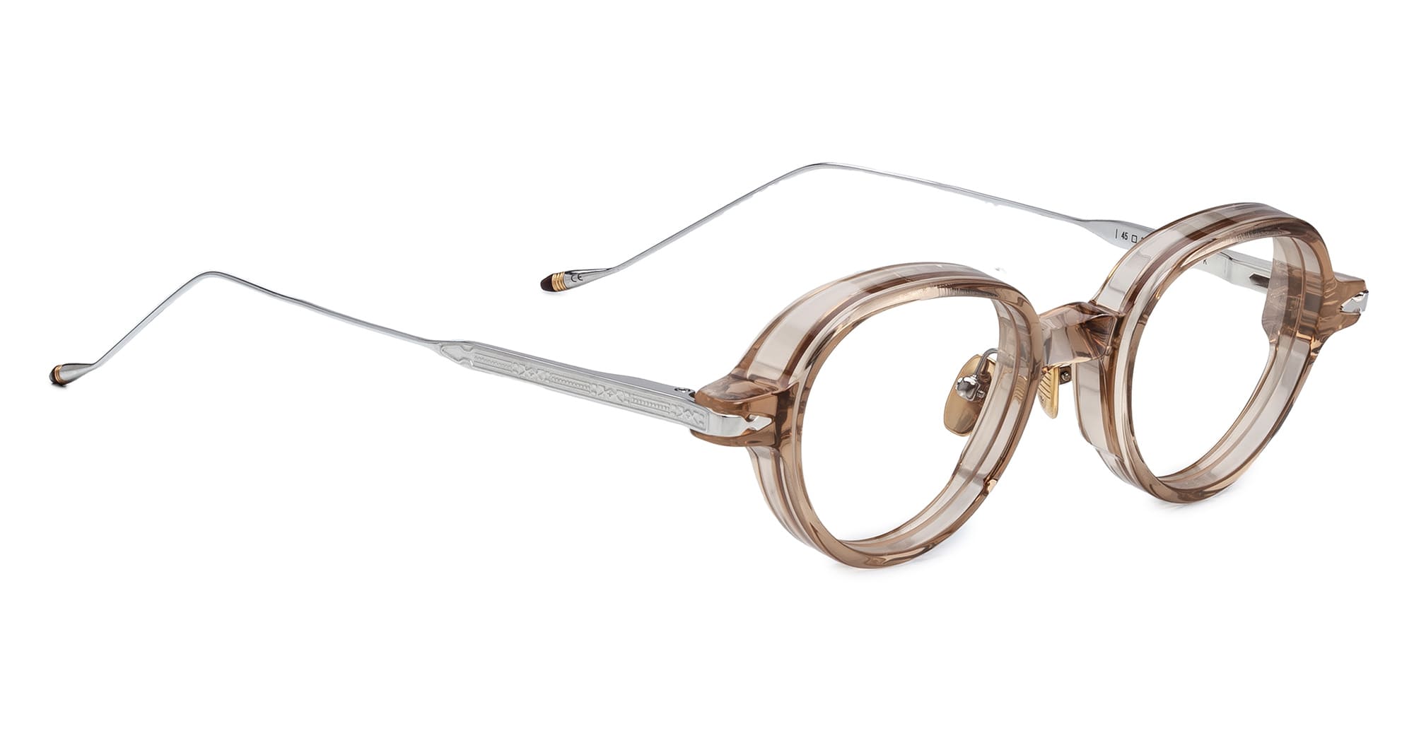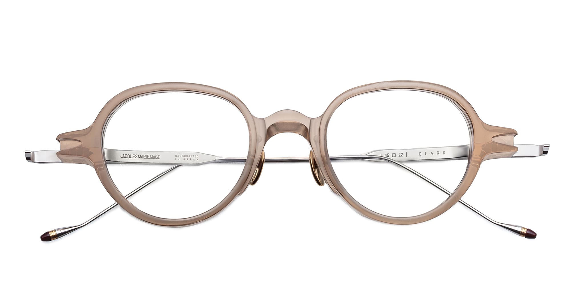 Jacques Marie Mage CLARK VU - SAND RX (JMMCRV-76) è un modello di occhiali dalla forma rotonda, elegante ed equilibrata, con naselli custom in titanio, ispirato a Clark Gable. Il modello presenta una montatura in acetato di cellulosa beige da 10 mm con aste in acetato personalizzate e hardware in metallo prezioso, una cerniera monoblocco custom fissata a tensione e naselli custom in titanio.