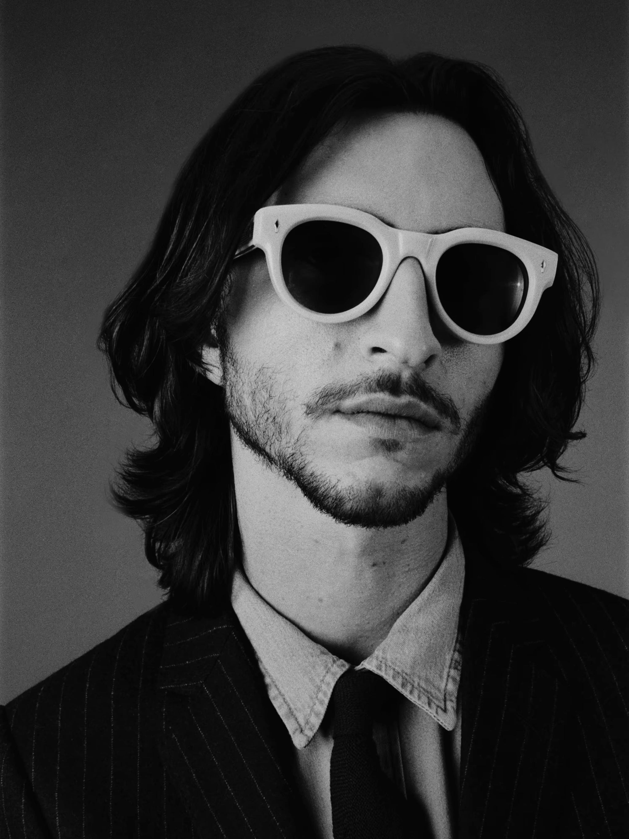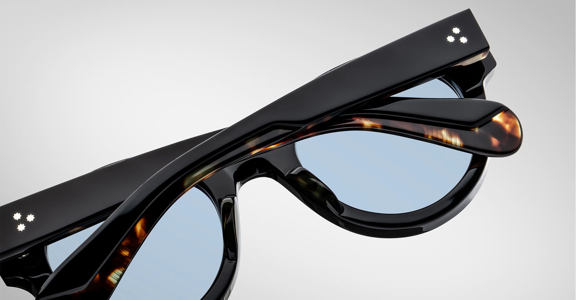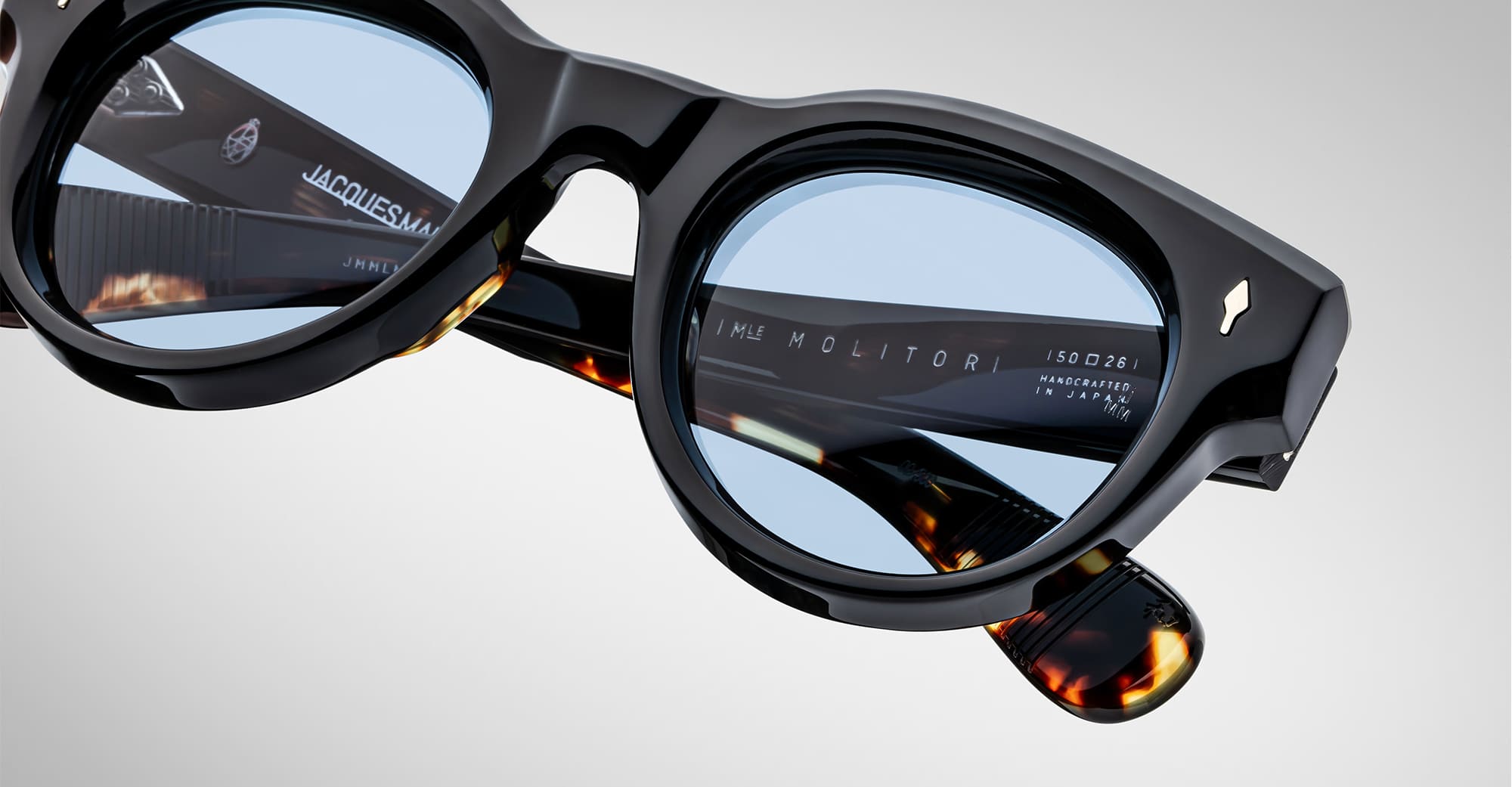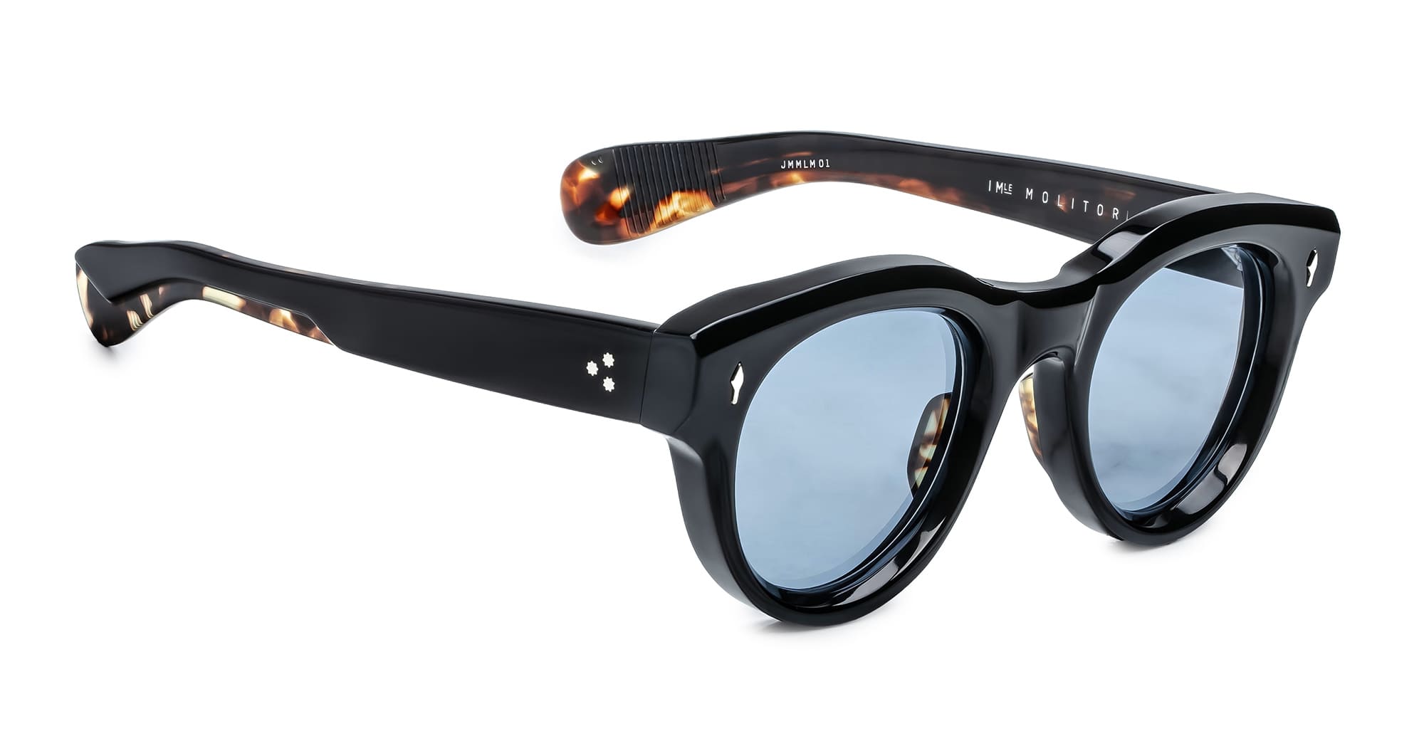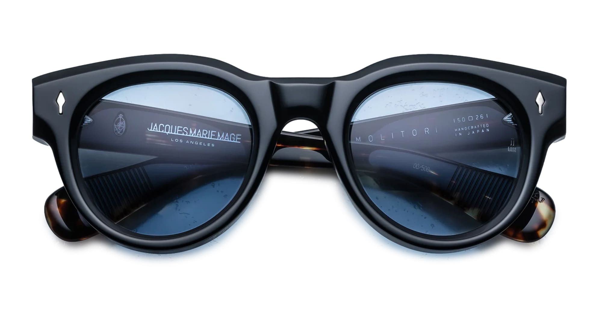 Jacques Marie Mage MOLITOR - NOIR (JMMLM-01) are boldly balanced sunglasses with a medium fit. They feature 10mm black cured cellulose acetate frame, custom double laminated acetate, inner wirecore, silver arrowhead front pins, tension-secured custom 7 barrel hinge with spur-shaped rivets, blue 6 base CR39 lens with backside anti-reflective treatment and 100% UV protection.
