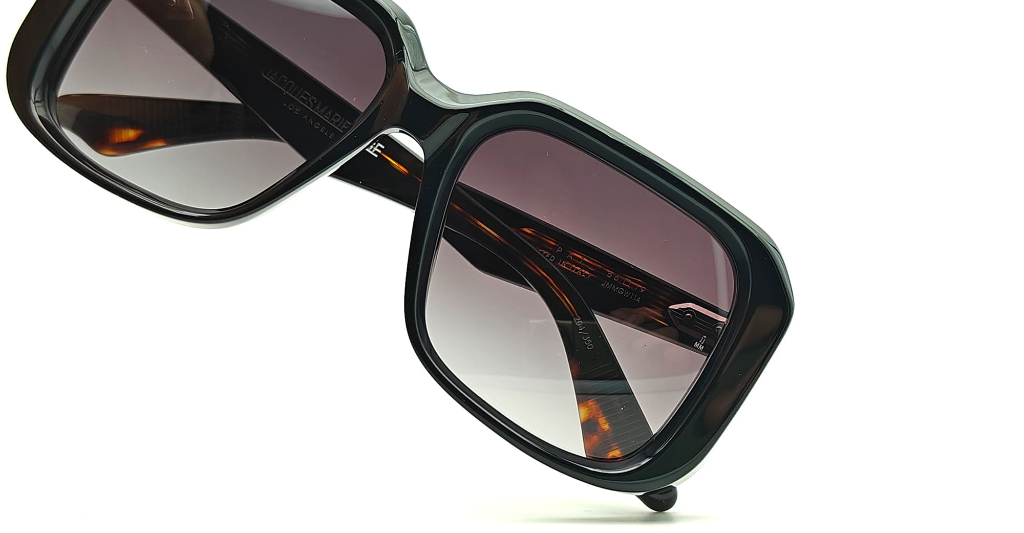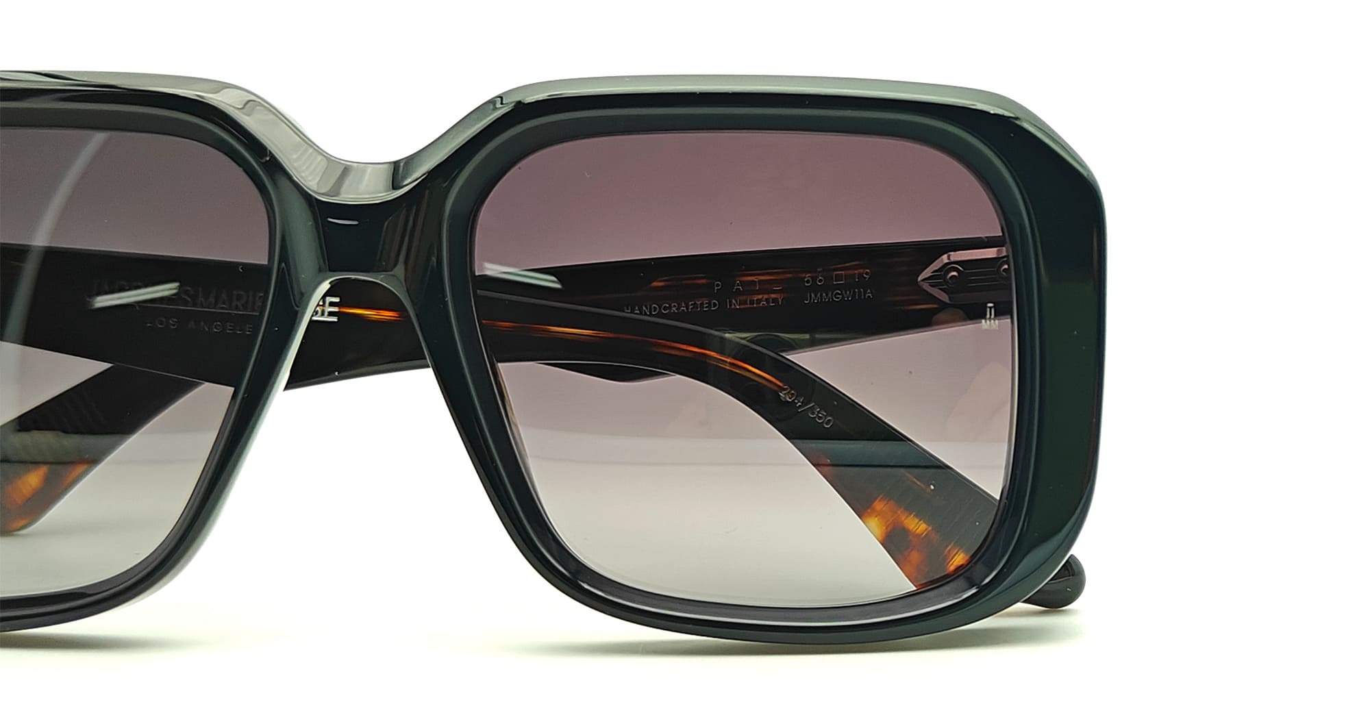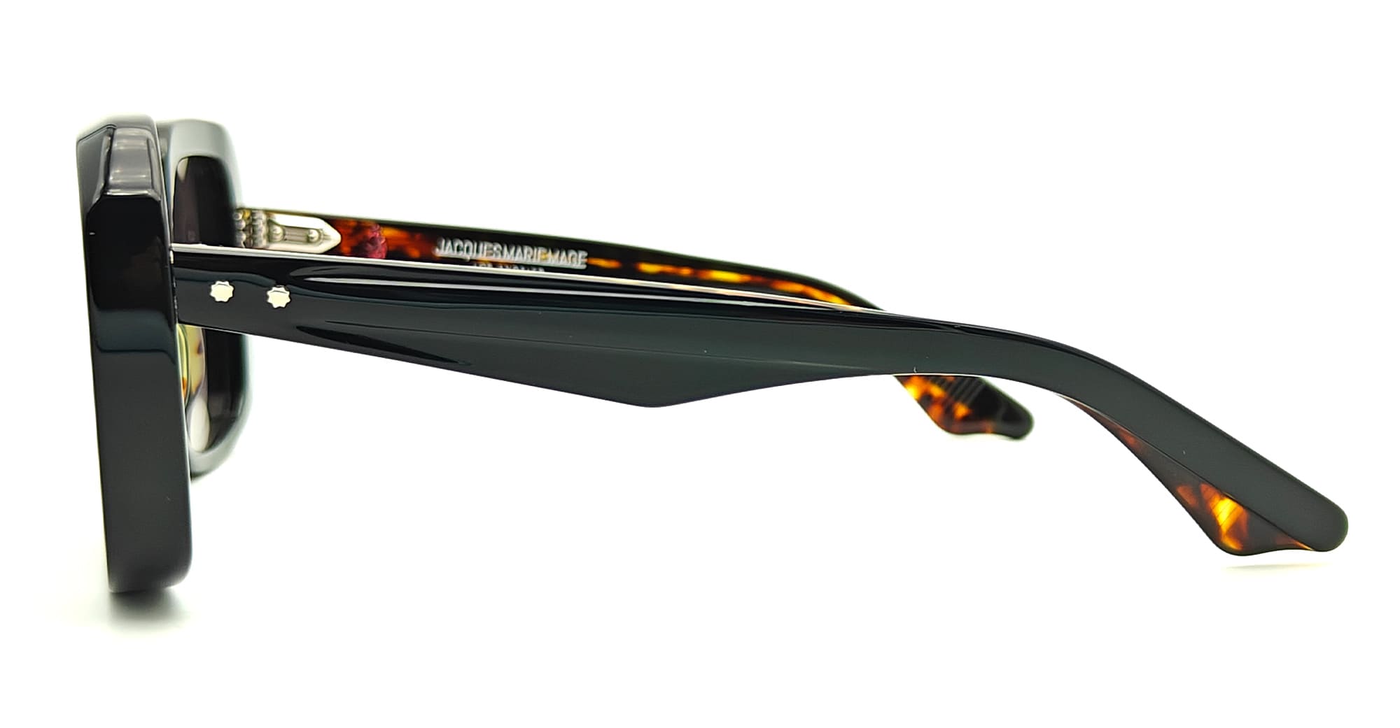 Jacques Marie Mage PAT - NOIR (J-ESN-GW-S6011A-OS) sono occhiali da sole squadrati oversize di ispirazione anni '70 realizzati in Italia. Montatura nera acetato di cellulosa, aste doppie laminate personalizzate, cerniera personalizzata nascosta anima e fissata a tensione, lente CR39 grigia sfumata con trattamento antiriflesso posteriore e protezione UV al 100%.