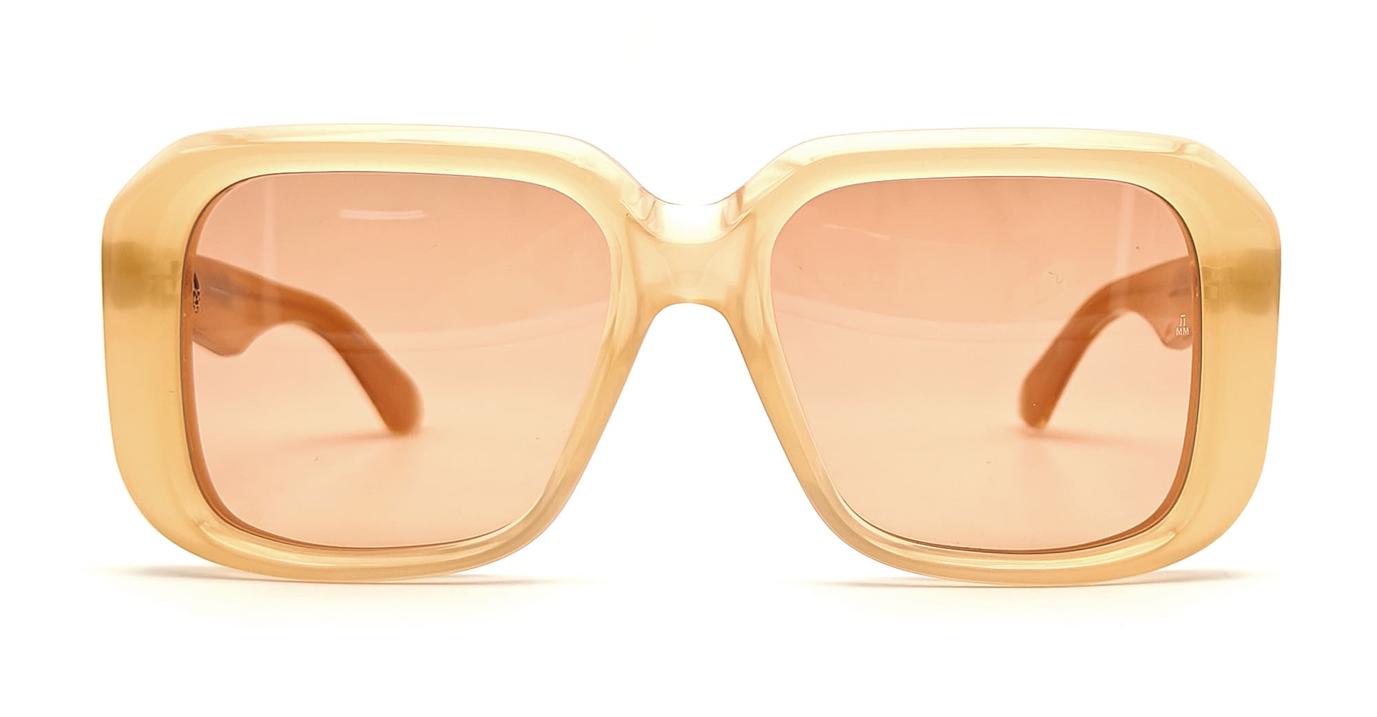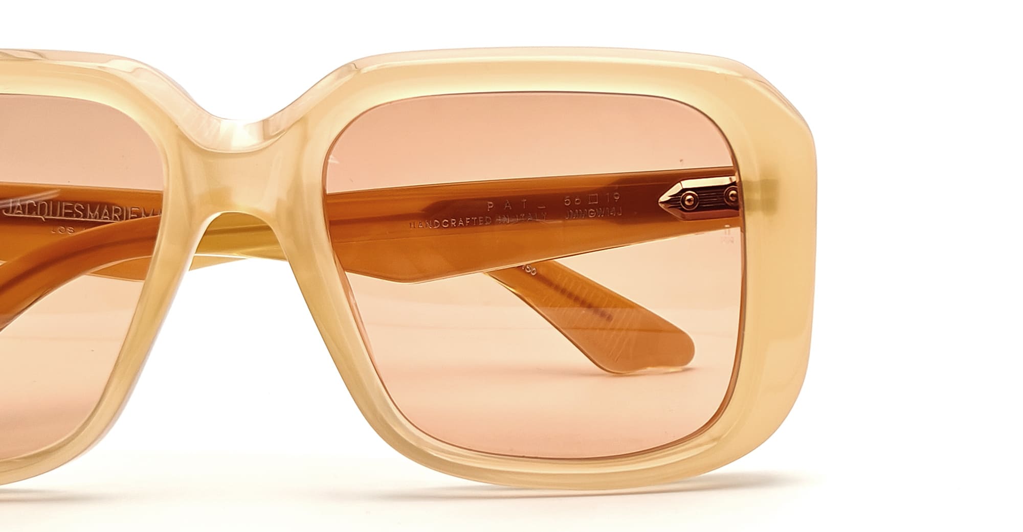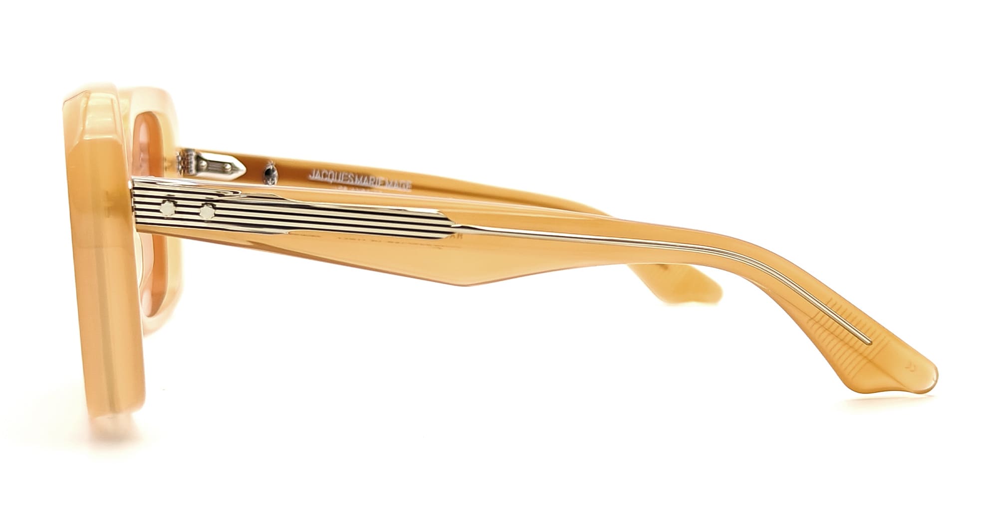Jacques Marie Mage PAT - SUNDIAL (J-ESN-GW-T7014J-OS) sono occhiali da sole squadrati oversize di ispirazione anni '70 realizzati in Italia. Montatura acetato di cellulosa beige trasparente, aste doppie laminate personalizzate, cerniera personalizzata anima a vista e fissata a tensione, lenti CR39 color seppia con trattamento antiriflesso posteriore e protezione UV al 100%.