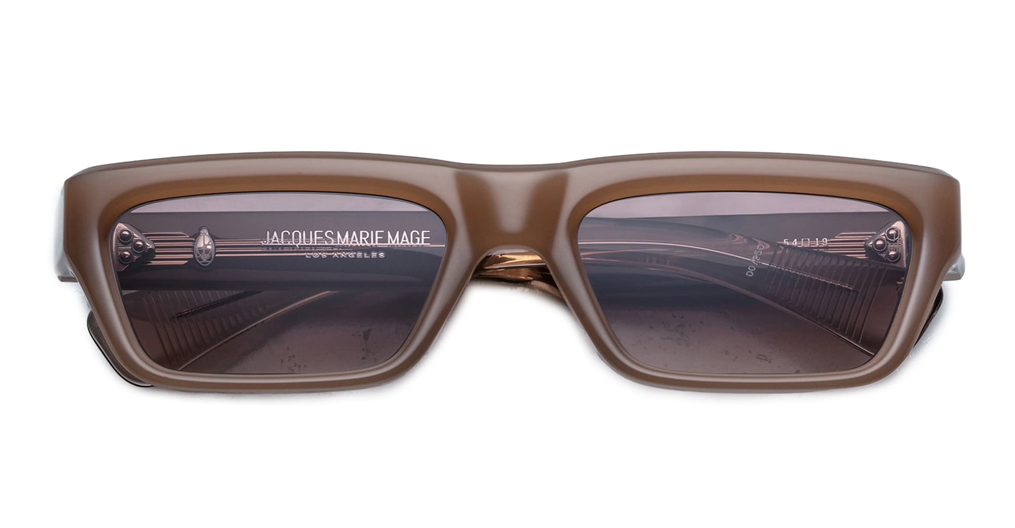 Jacques Marie Mage RUSH - BIRCH (JMMRUS-11W) sono eleganti occhiali da sole da donna in stile micro di fine anni '90 con lenti sottili. Montatura marrone da 8 mm acetato di cellulosa, aste doppie laminate personalizzate, cerniera a 7 barilotti nascosta anima e fissata a tensione, lenti CR39 a 2 basi color cognac sfumate con trattamento antiriflesso sul retro e protezione UV al 100%.