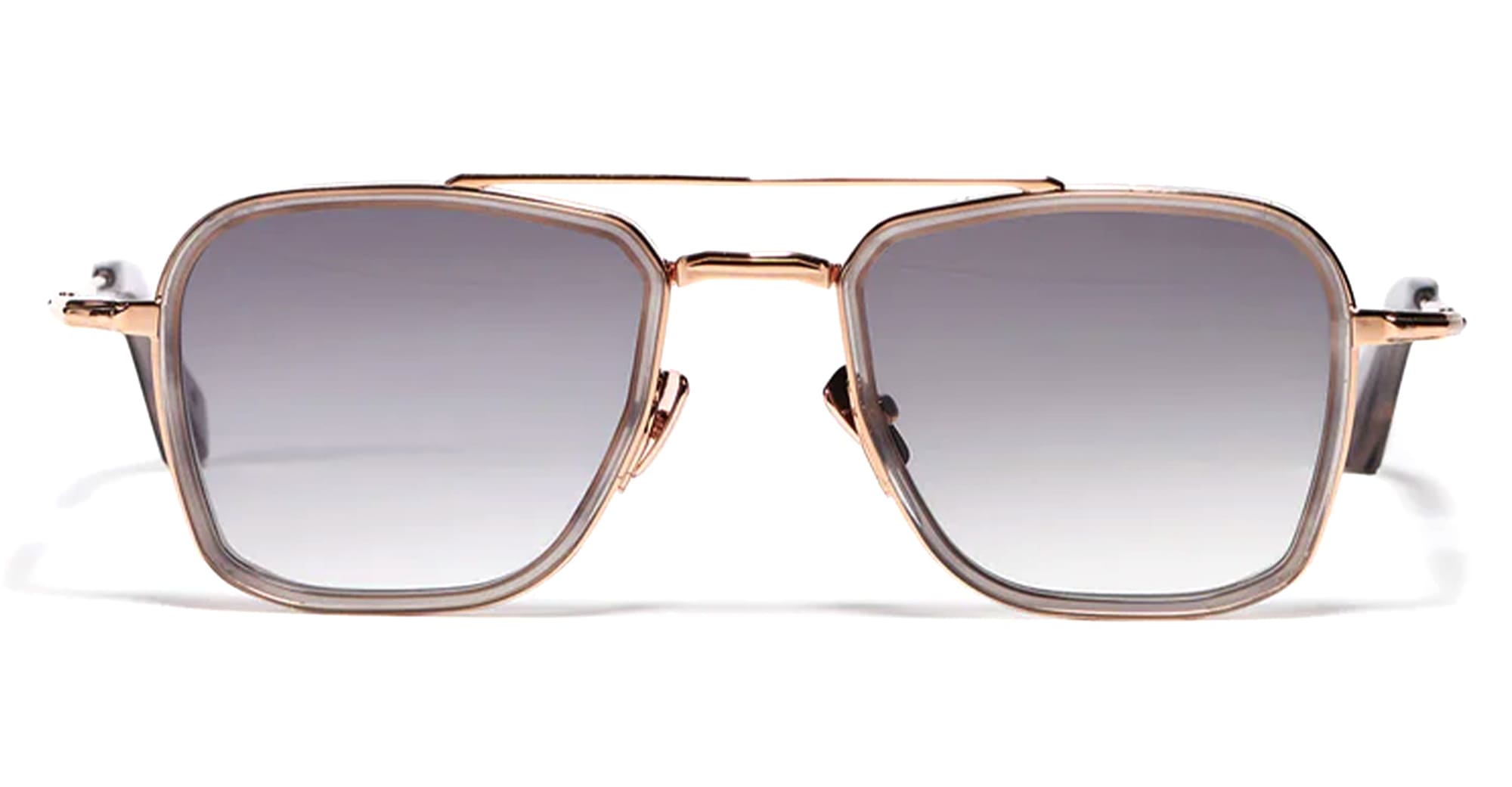 John Dalia EWAN - C154 - WORKMAN GREY - ROSE GOLD 18K (EWAN-C154) are unisex squared aviator sunglasses combining, titanium, metal and acetate elements, part of the exclusive John Dalia eyewear collection. They feature a rose gold titanium corewire structure, grey acetate eyerims, titanium temples with sculpted grey acetate end tips, double nose bridge with custom nose pads, grey gradient CR39 lenses with an anti-reflective coating on the inner surface, and 100% UV protection.