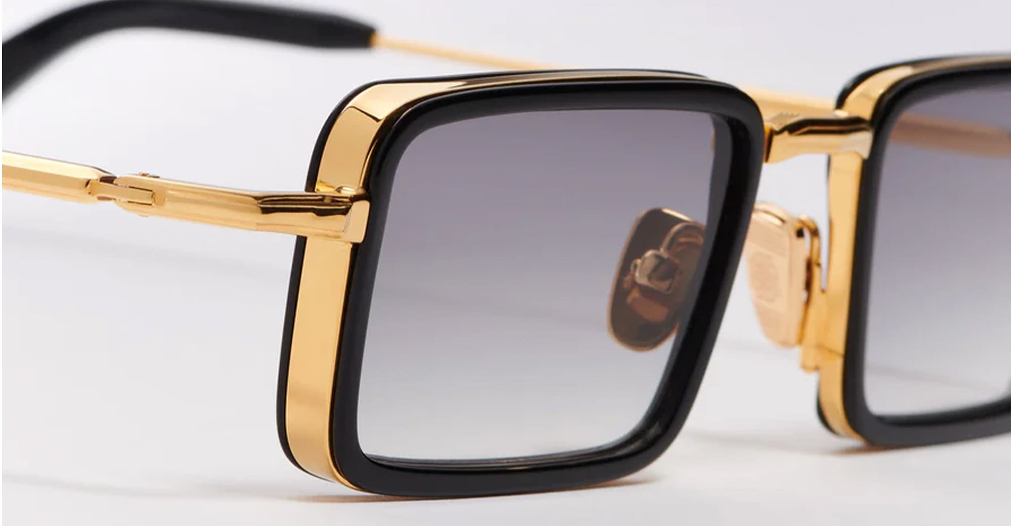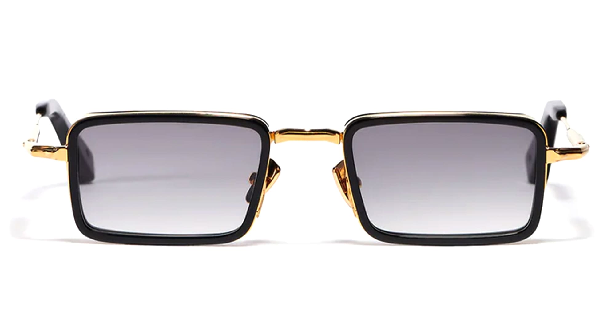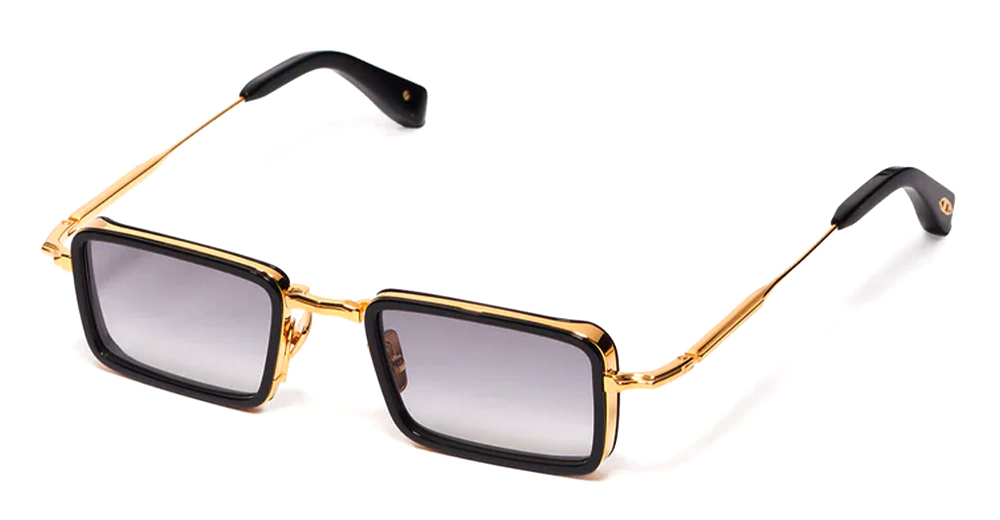 John Dalia PIERCE - C100 SHINY BLACK / 18K YELLOW GOLD (PIERCE-C100) are unisex rectangular aviator sunglasses combining, titanium, metal and acetate elements, part of the exclusive John Dalia eyewear collection. They feature a yellow gold titanium corewire structure (5µ), black acetate eyerims, titanium temples with sculpted black acetate end tips, double nose bridge with custom nose pads, grey gradient CR39 lenses with an anti-reflective coating on the inner surface, and 100% UV protection.