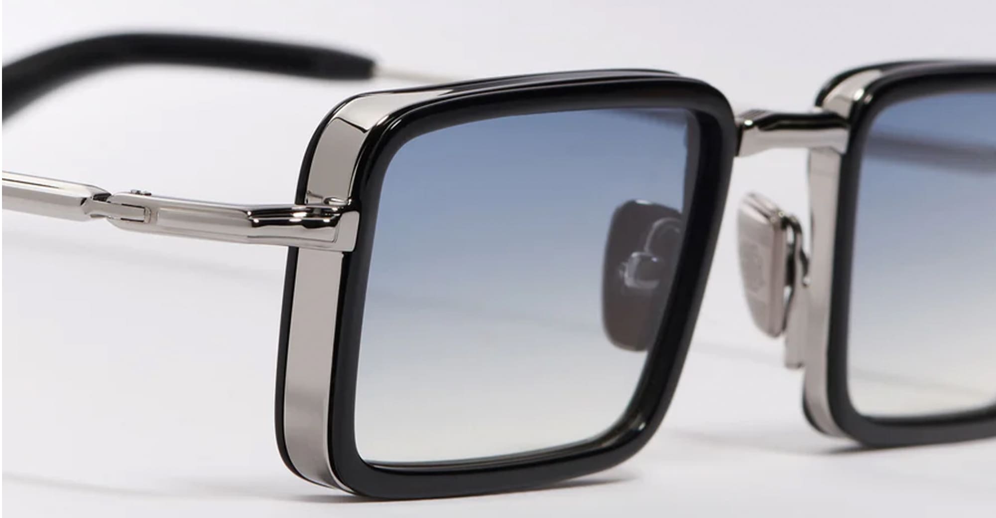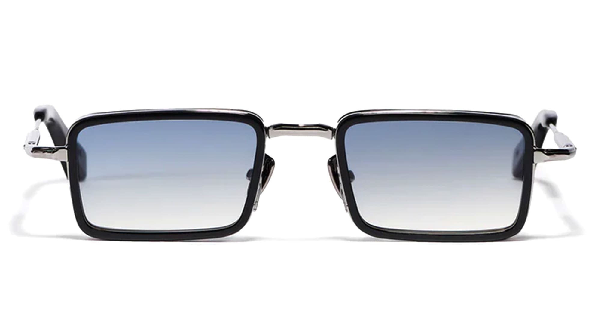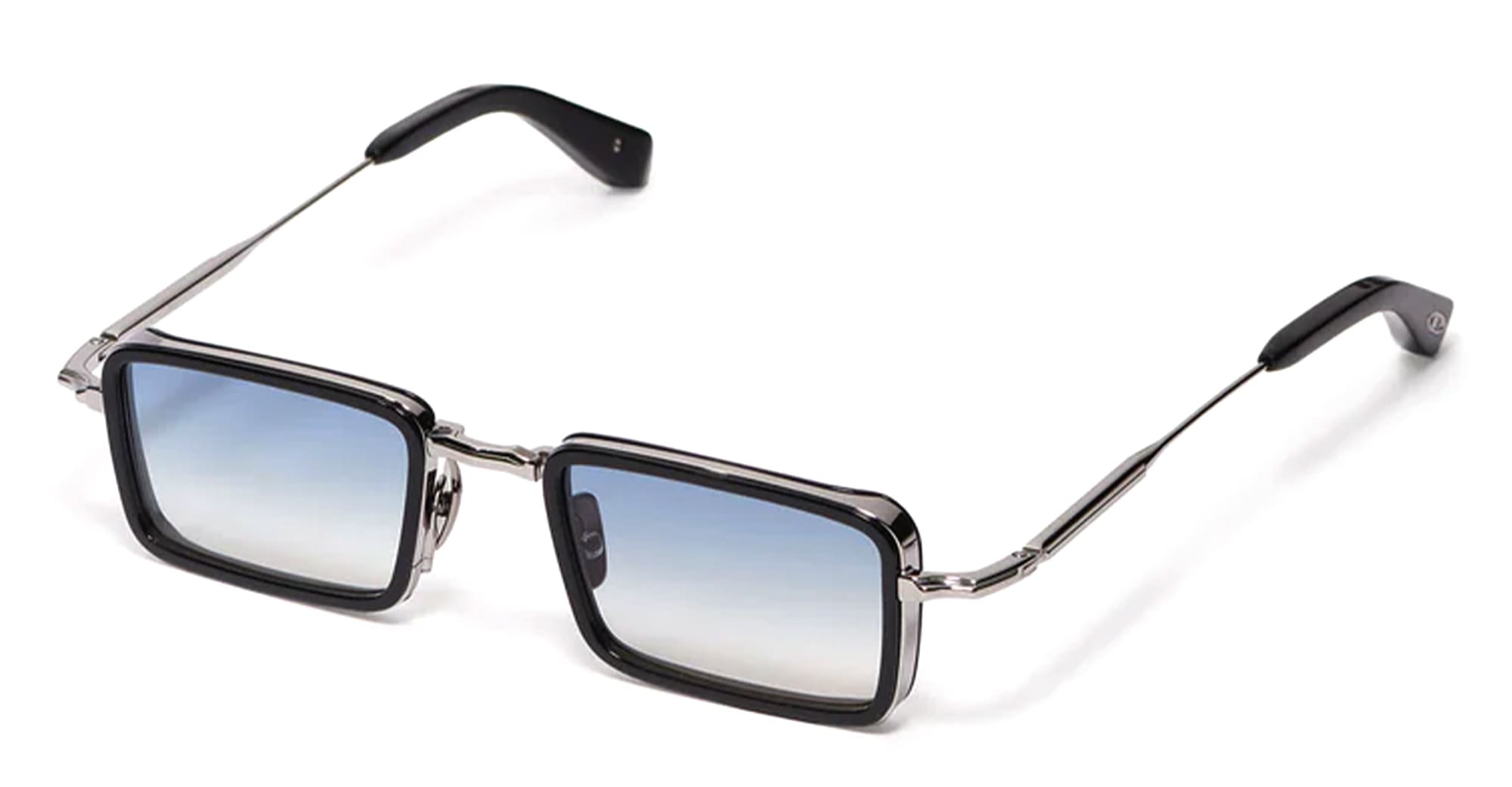 John Dalia PIERCE - C107 SHINY BLACK / RUTHENIUM PLATED (PIERCE-C107) are unisex rectangular aviator sunglasses combining, titanium, metal and acetate elements, part of the exclusive John Dalia eyewear collection. They feature a ruthenium titanium corewire structure (3µ), black acetate eyerims, titanium temples with sculpted black acetate end tips, double nose bridge with custom nose pads, blue gradient CR39 lenses with an anti-reflective coating on the inner surface, and 100% UV protection.