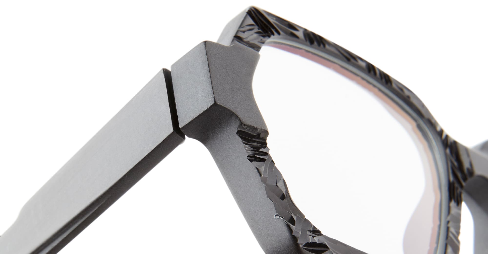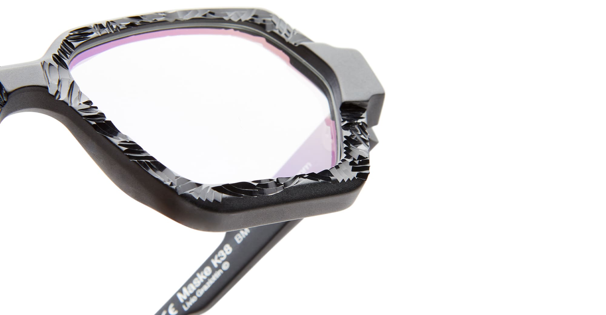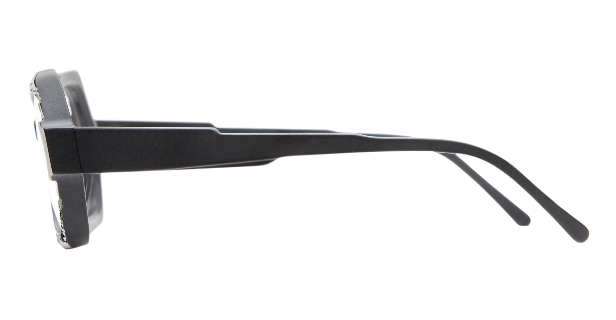 Kuboraum MASK K38 - BLACK MATTE / PITHOPRAKTA RX (KROK38BM00PK00OP) are hexagonal eyeglasses made in Italy. They feature matte black textured Mazzucchelli acetate frame with a slightly cat-eye shape, and sculpted acetate temples.