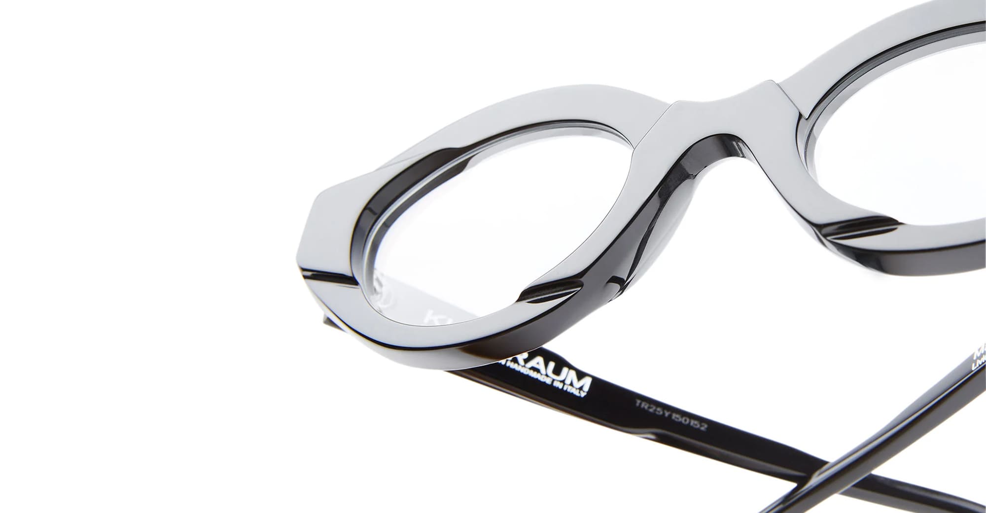 Kuboraum MASK K44 BS - BLACK SHINE RX (KROK44BS000000OP) sono occhiali ovali moderni dalla forma cat-eye, parte dell'esclusiva collezione di occhiali Kuboraum. Presentano un frontale in acetato nero Mazzucchelli e aste in acetato scolpito.