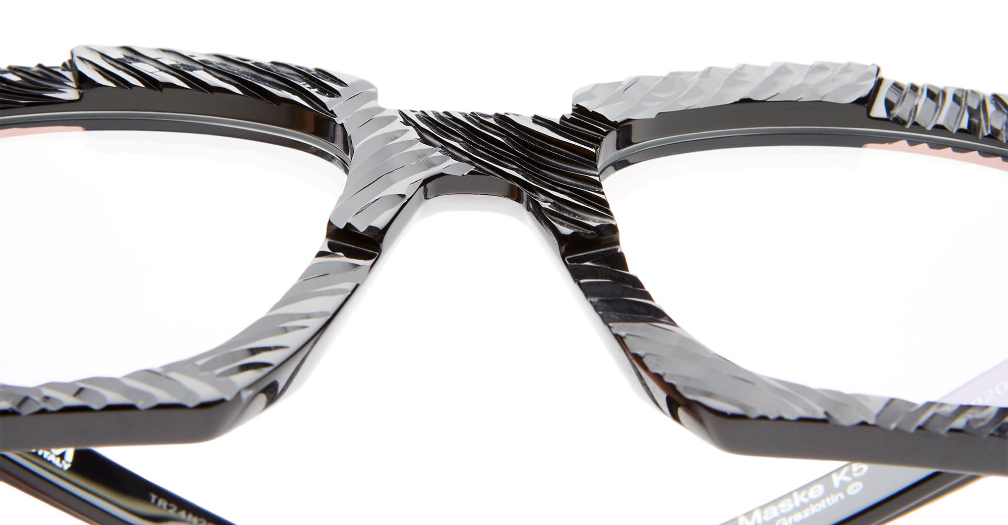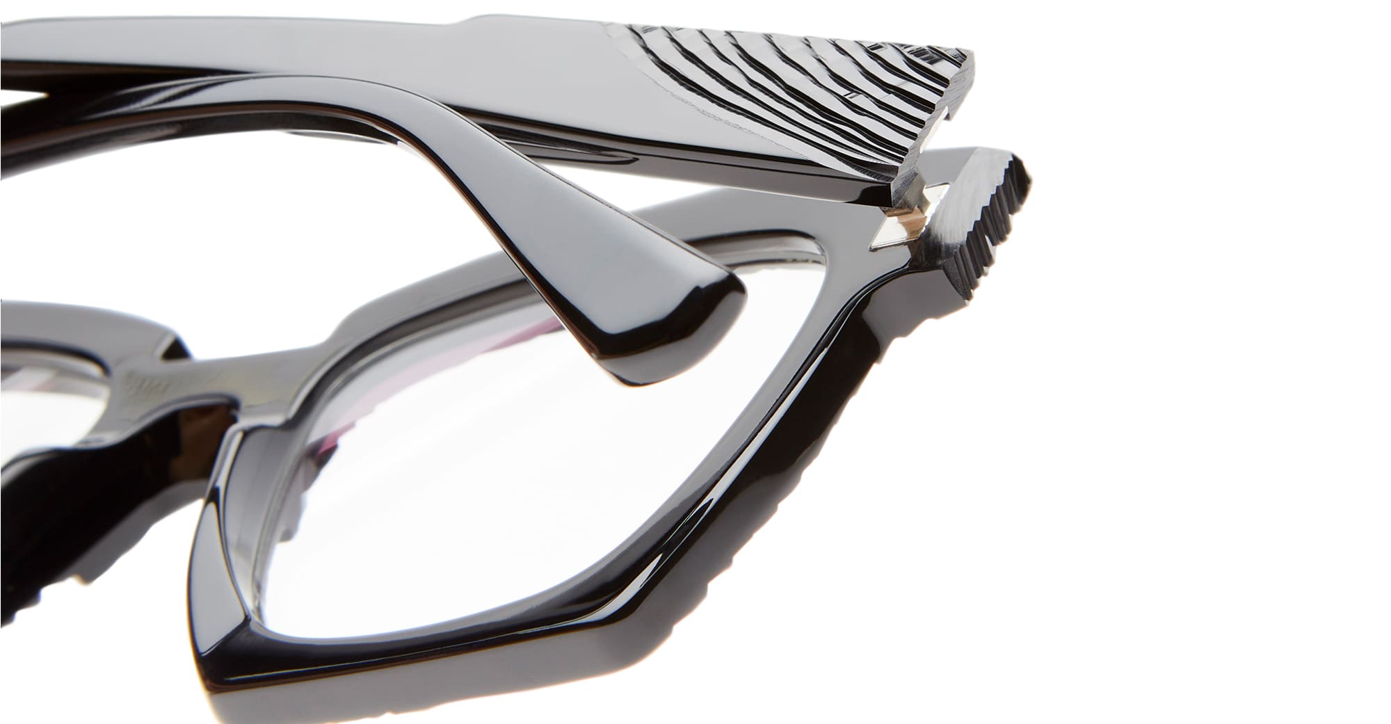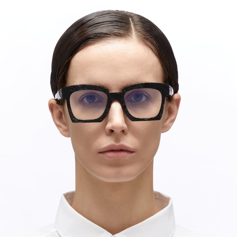 Kuboraum MASK K5 - BSP TITLTED ARC RX (KRO0K5BSP00000OP) are elegant squared eyeglasses made in Italy with a distinctive design. They feature black textured Mazzucchelli acetate frame with front bevel cuts, and sculpted temples.