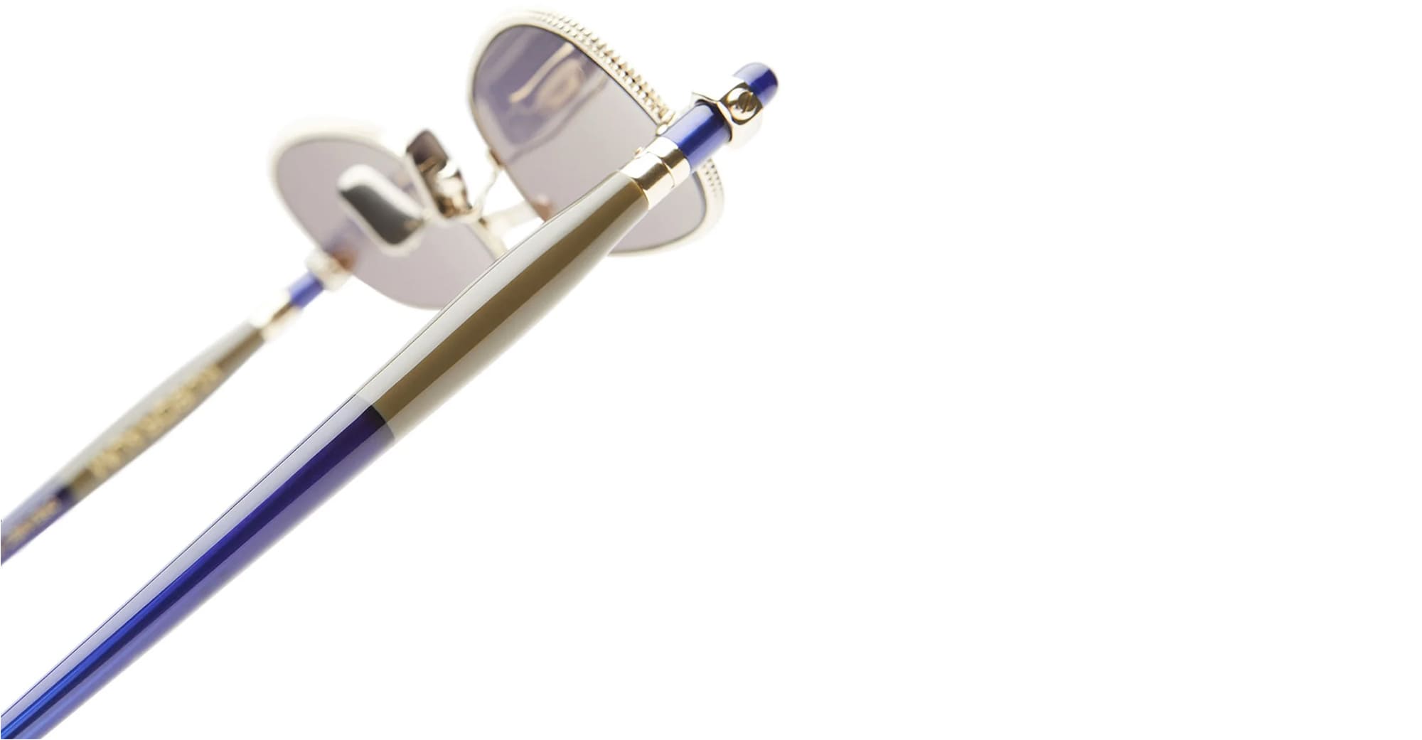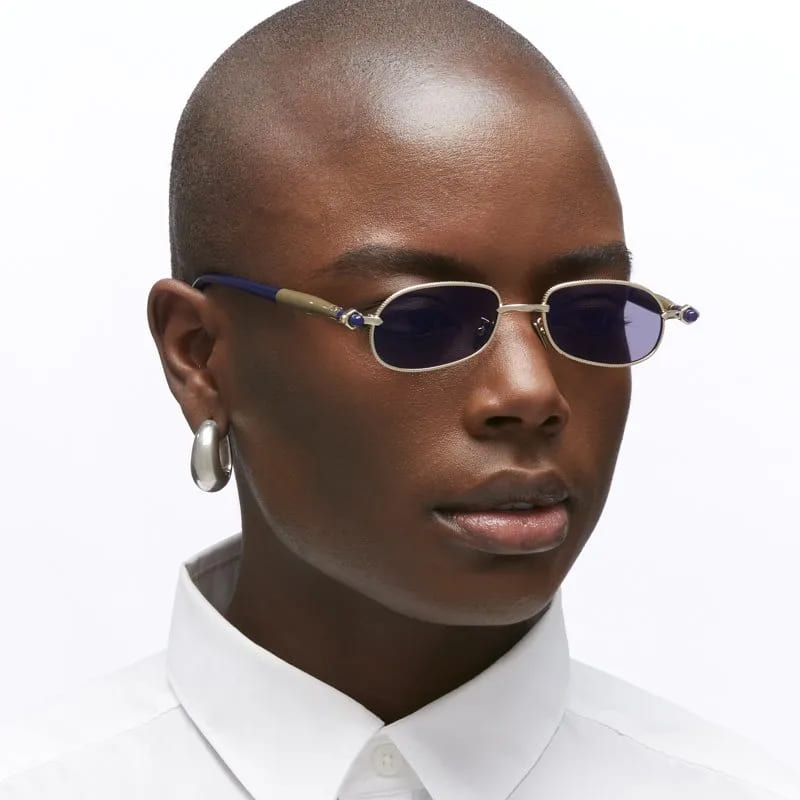 Kuboraum MASK P78 LGB - LIGHT GOLD (KRSP78LGB00000DL) are oval sunglasses with a tear drop shape, part of the exclusive Kuboraum eyewear collection. They feature light gold metal frame with pressed details, iconic bi-color Kuboraum acetate round temples, custom hinge, and dark blue lens with 100% UV protection.