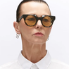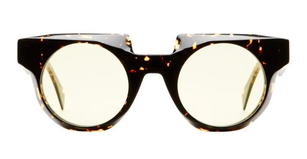 Kuboraum MASK U1 - HAVANA FIRE (KRS0U1HOF00000SE) sono occhiali da vista tondi realizzati in Italia con una parte superiore dritta e spigolosa. Presentano una montatura in acetato Mazzucchelli marrone havana con tagli smussati, aste sclupted, lenti giallo senape chiaro con protezione UV al 100%.