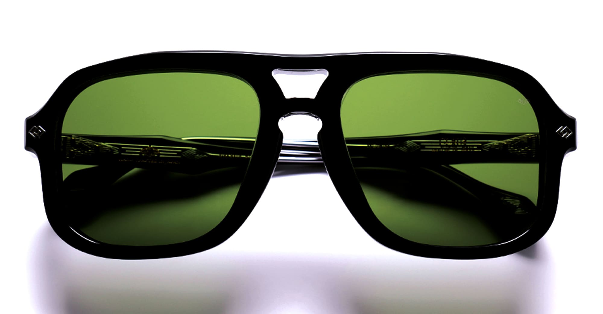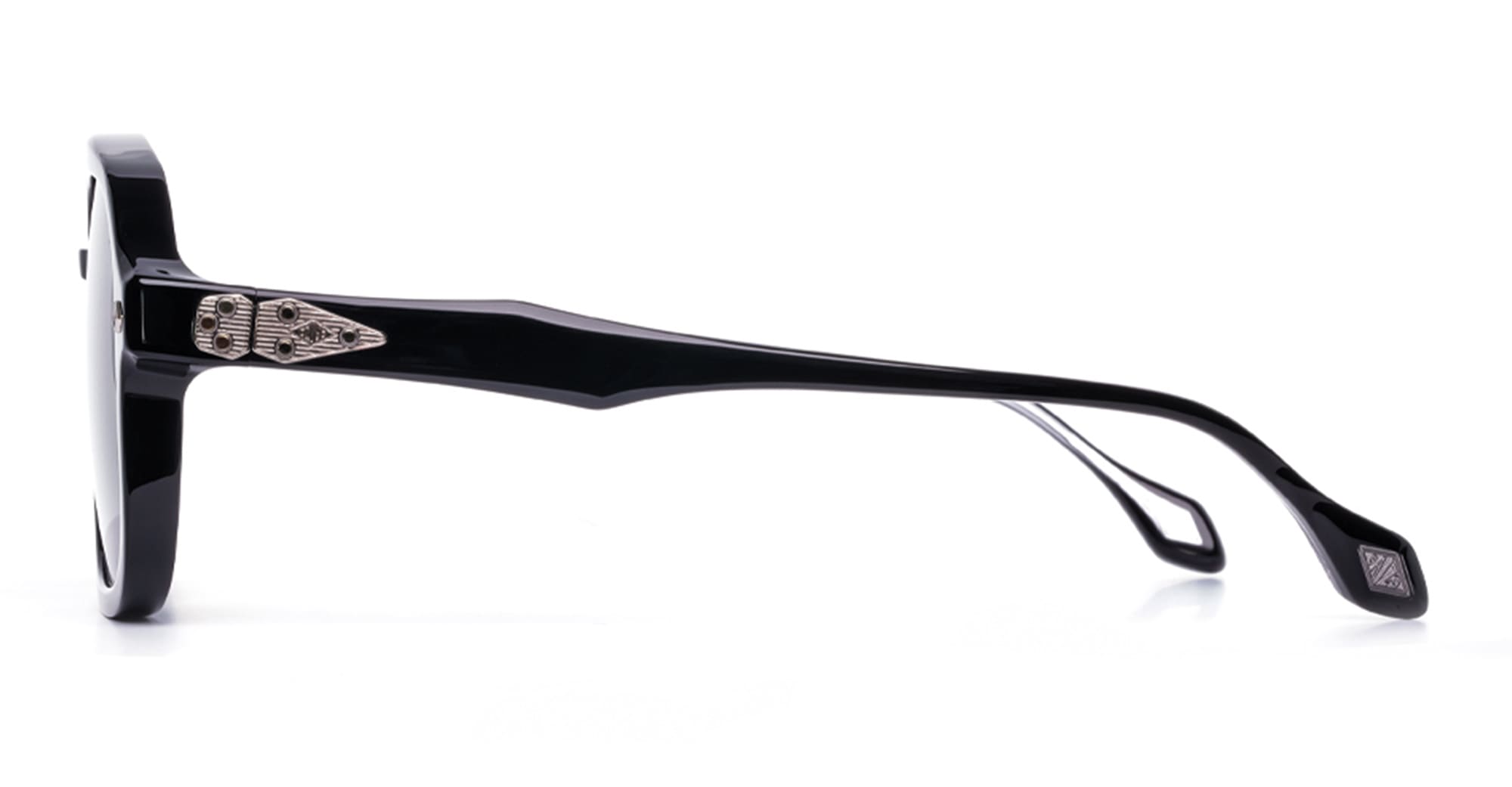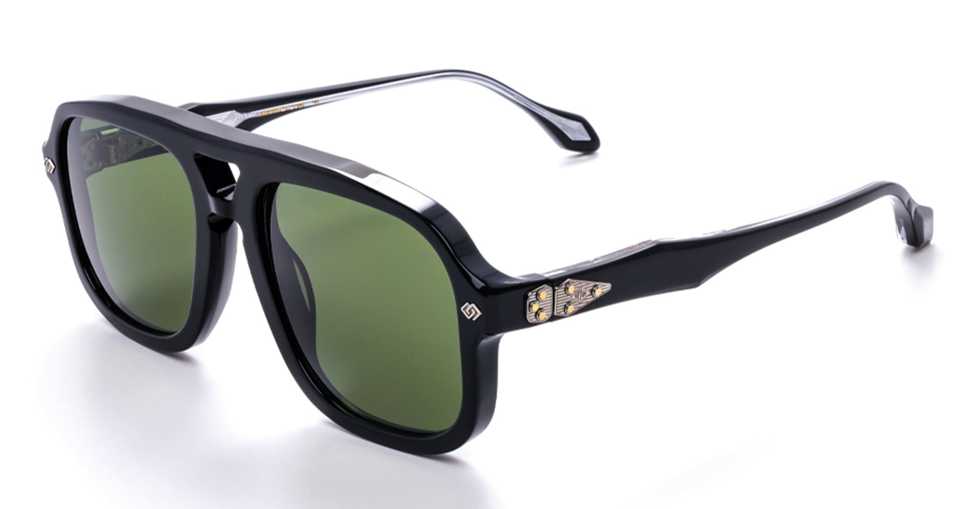 Daizo CLAUS - BLACK / POLISHED TITANIUM (A-AVS001e-B1-PG01) are late 1970s-inspired square aviator sunglasses, part of the Daizo custom-batch eyewear collection and handcrafted in Japan. They feature black Italian and Japanese acetate frame with beveled edging for three-dimensional depth, unique 180 degree hinge system with outer matching plates and detailed with custom two tone rivets, Signature laminated wire core and embedded DAIZO diamond logo at temple tips, and green lens with 100% UV protection. This frame is ergonomically designed to give ultimate wearing comfort.