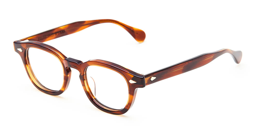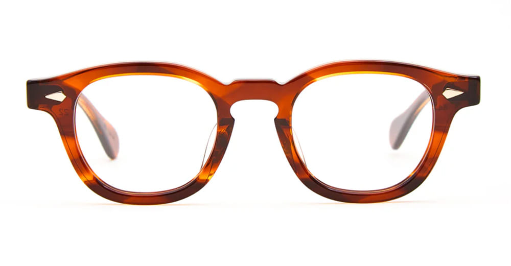 Julius Tart AR 46X24 - AMBER RX (JTPL-102G) are vintage-inspired pantos eyeglasses made in Japan. They feature havana acetate structure with distinctive keyhole bridge, horizontal diamond-shaped front pins on front and temples.