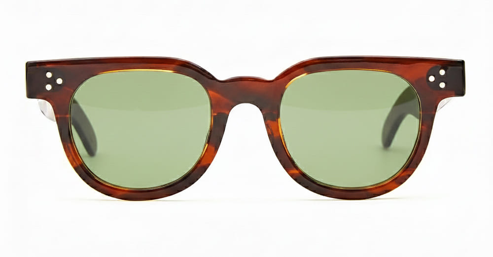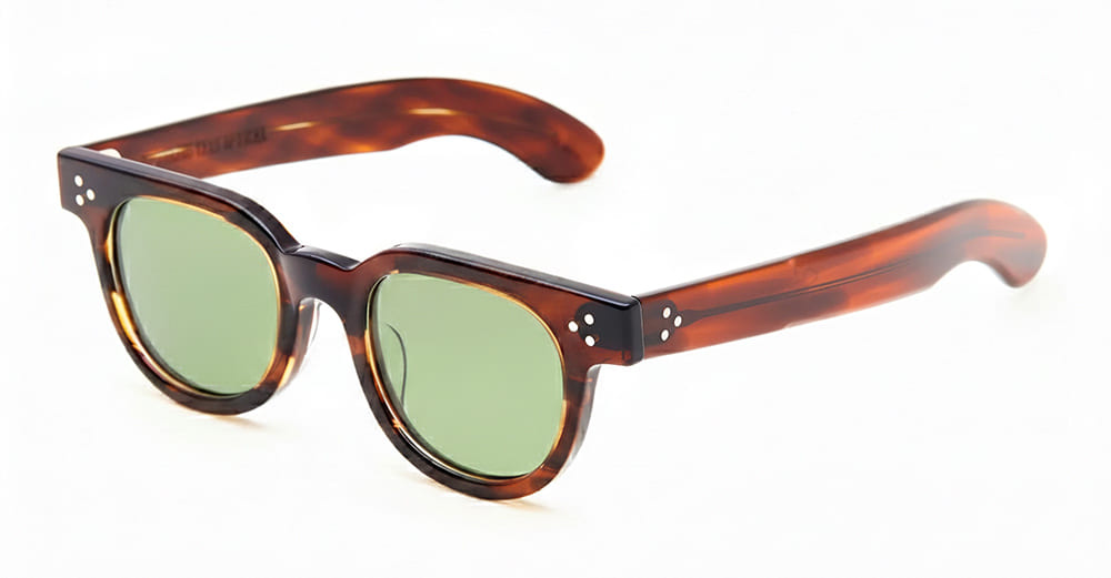 Julius Tart FDR 48X24 - DEMI AMBER / GREEN LENS (JTPL-105M-2B-GN-30) are vintage-inspired round sunglasses made in Japan. They feature havana acetate frame, three-dots pins on front and temples, spatula acetate temples, and green lens with 100% UV protection.